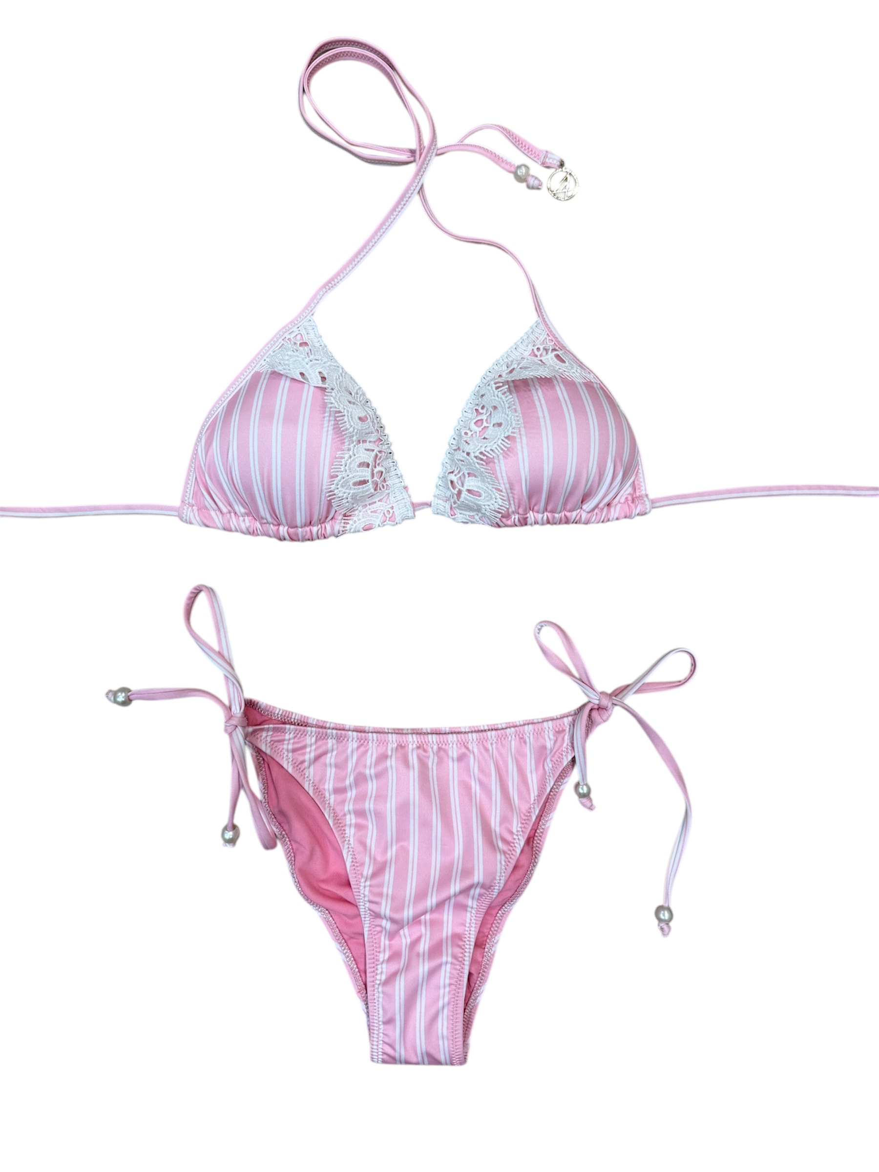 Bikini triangolo righe rosa baby e bianche + pizzo.