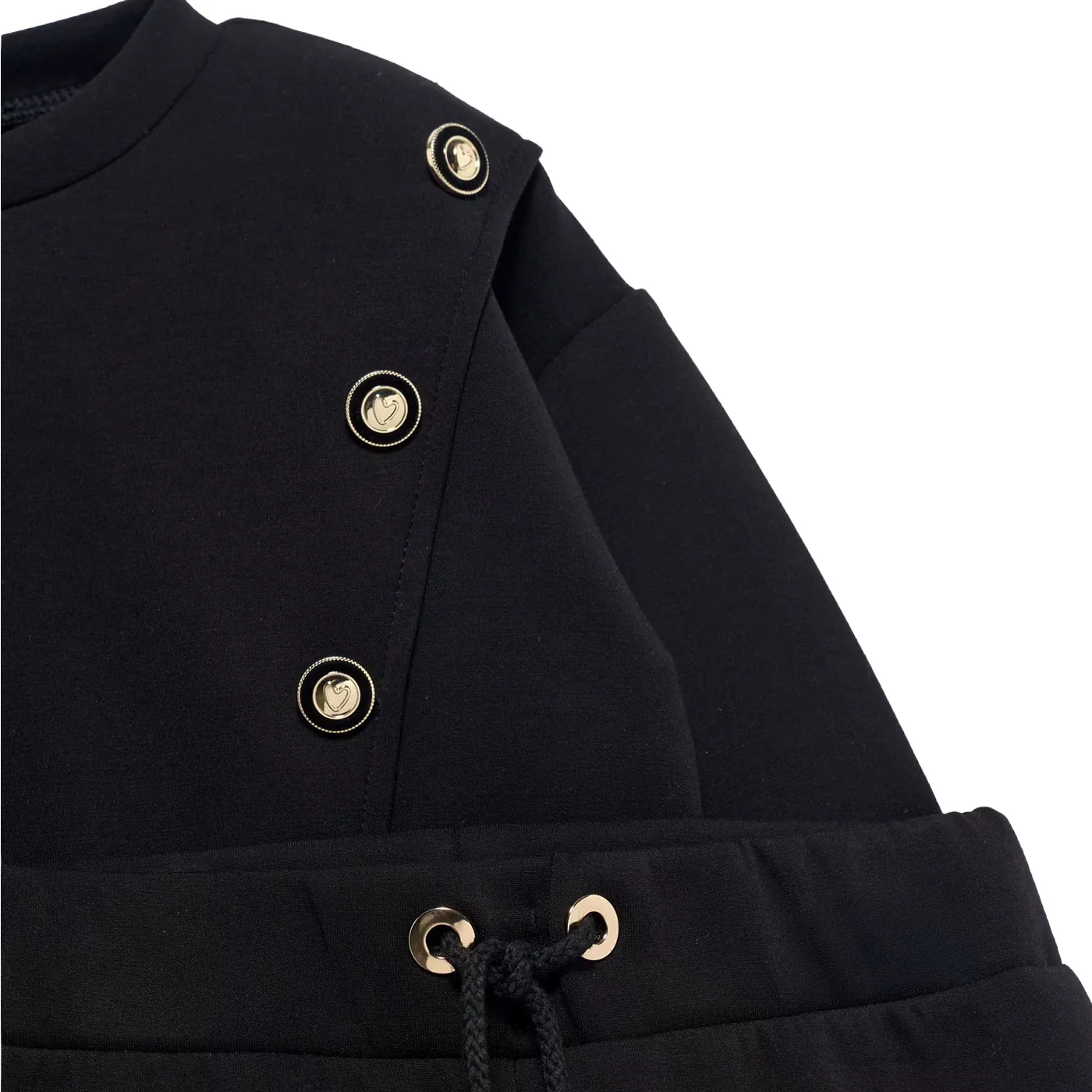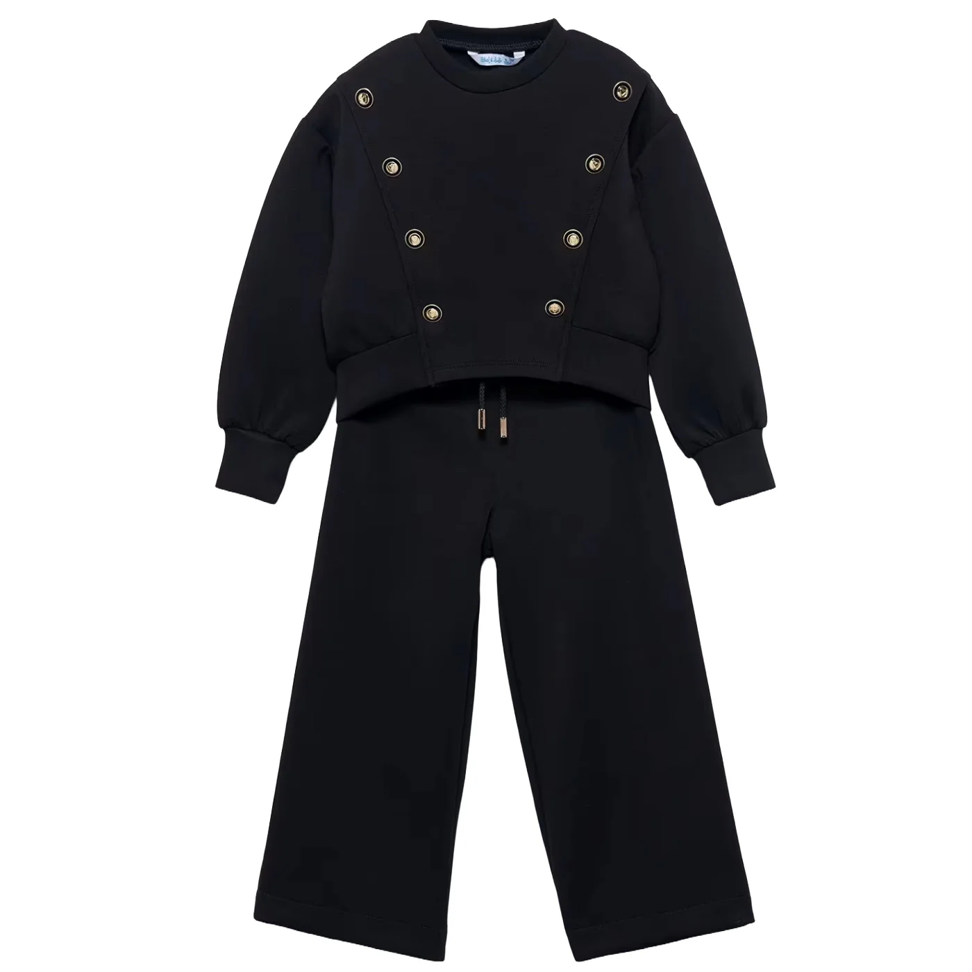 Abel & Lula completo due pezzi bambina neroFelpa girocollo Dettagli bottoni Banda a contrasto sul retro Pantalone gamba Vita elastica con coulisse Composizione: 47% poliestere 46% viscosa 7% elastanMade in CinaCollezione Autunno Inverno