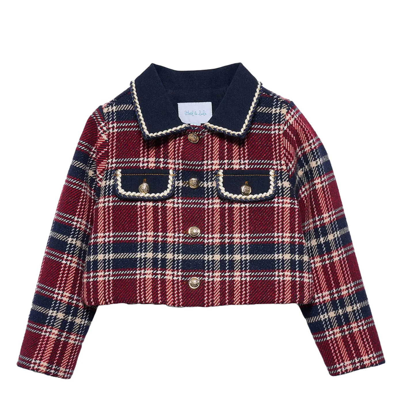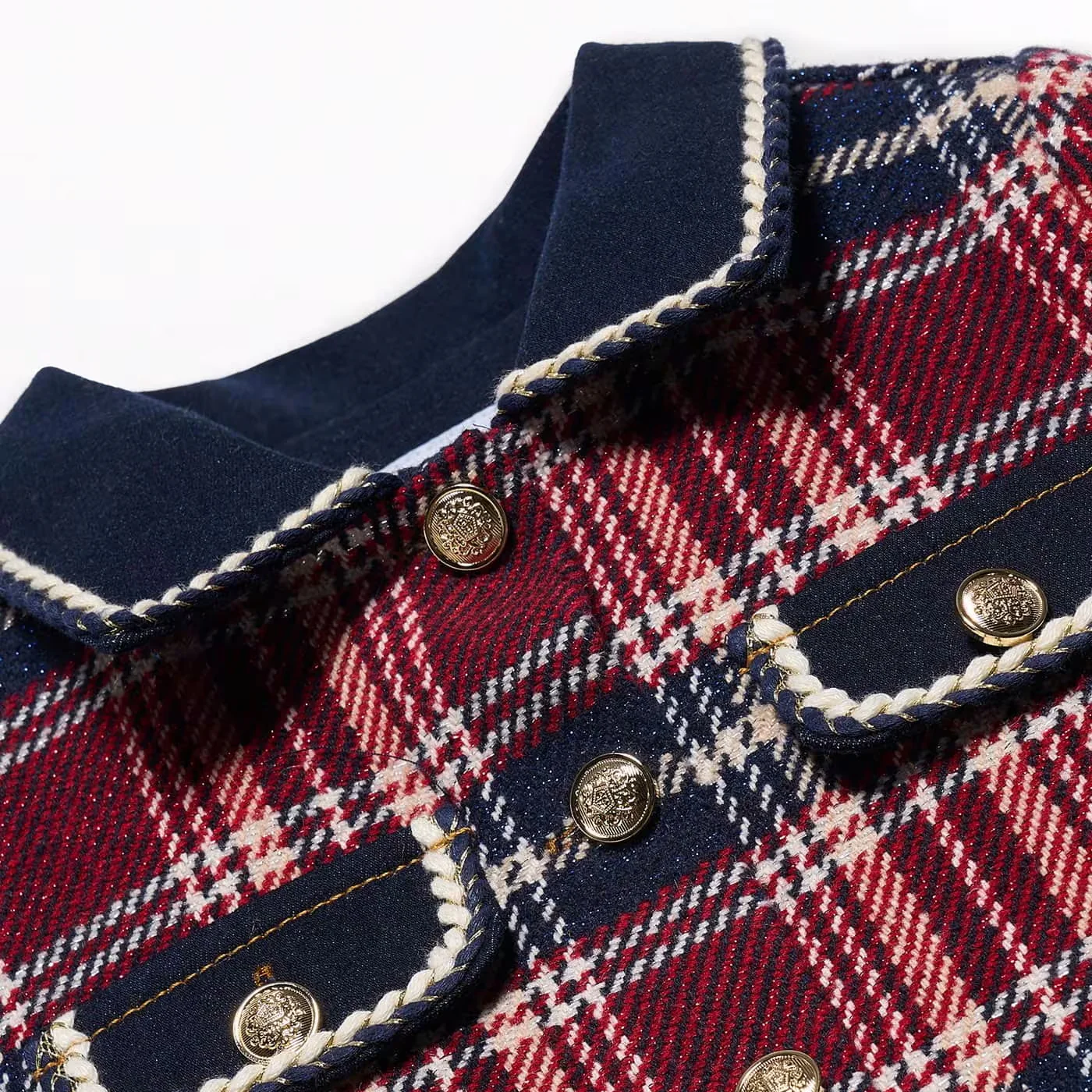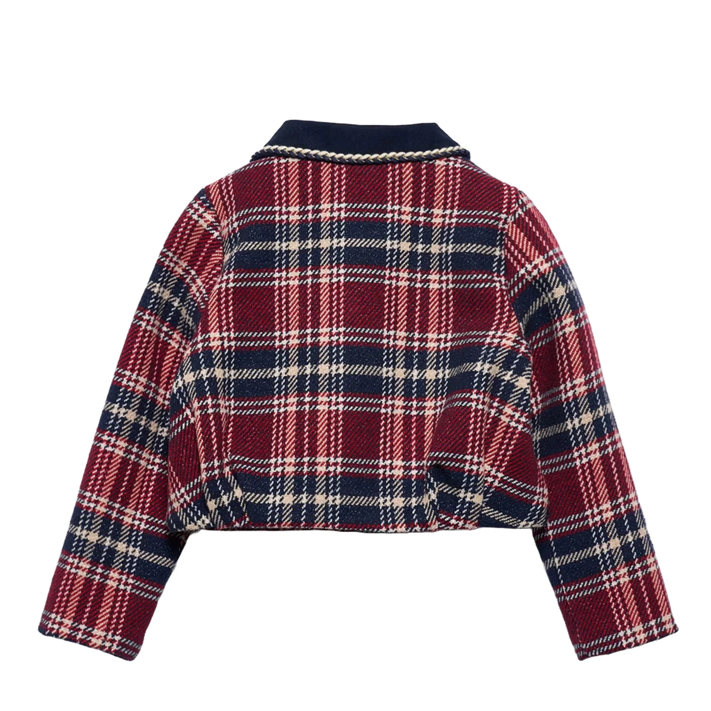 Abel & Lula giacca junior tartan rossa blu lurex Collo a camicia ricamato Tasche finte con patta e bottoni oro Chiusura centrale con bottoni oroComposizione: 46% poliestere 22% acrilico 13% cotone 8% viscosa 6% poliestere fodera 100% cotone Made in CinaCollezione Autunno Inverno Vestibilitร :Taglia Etร