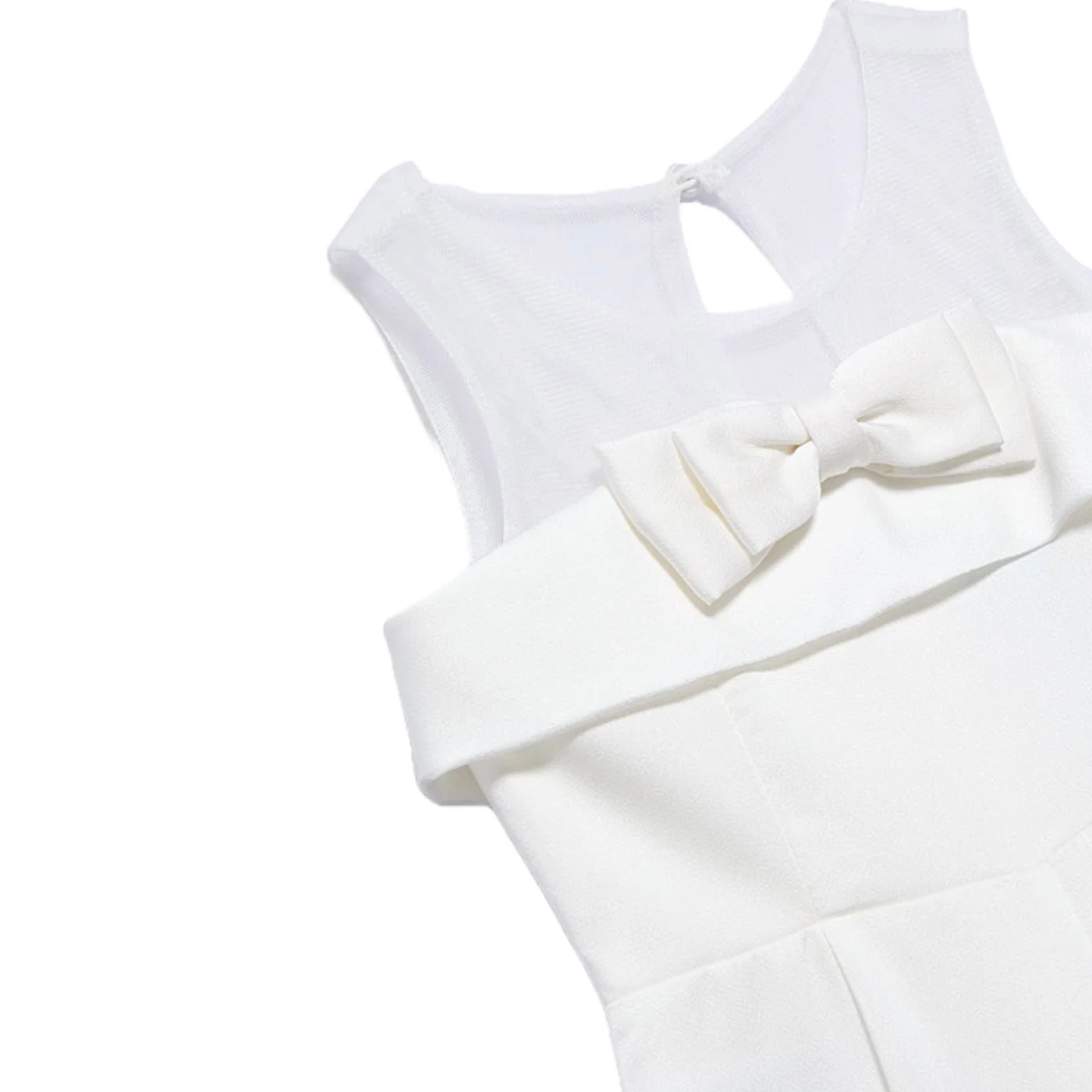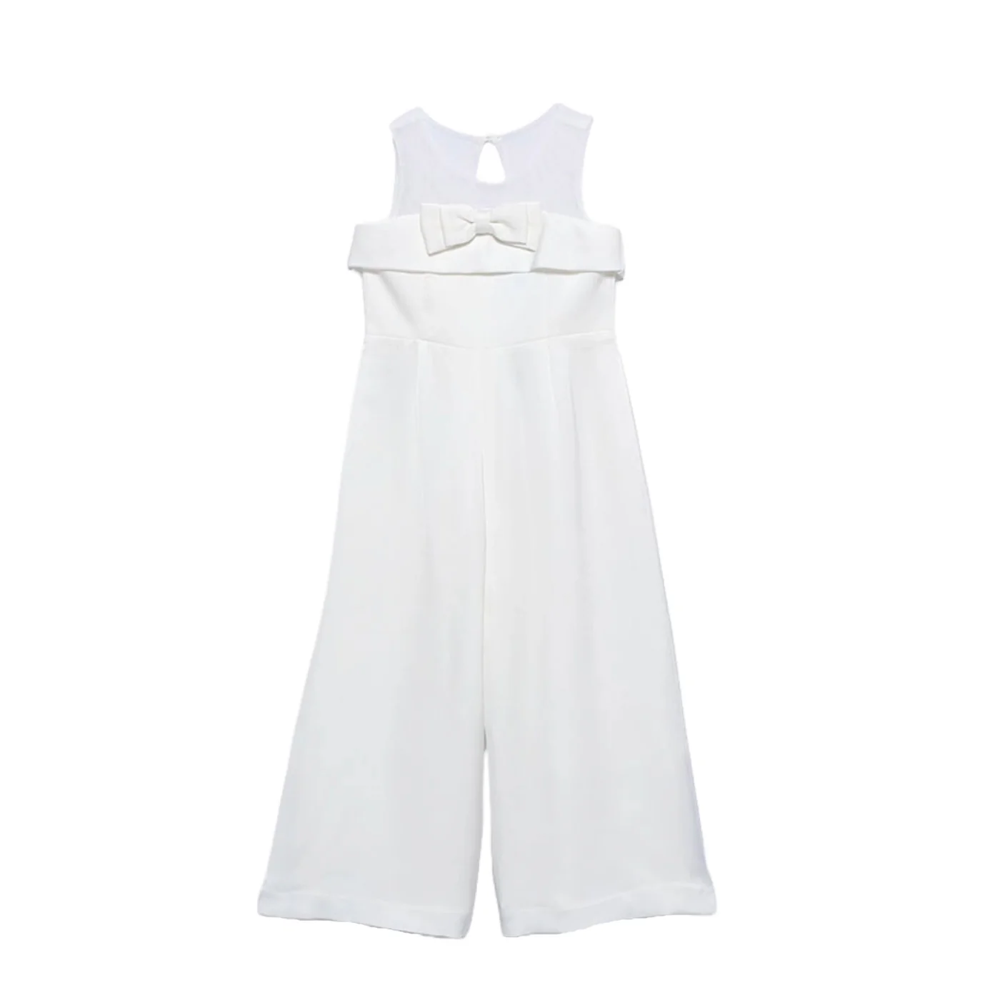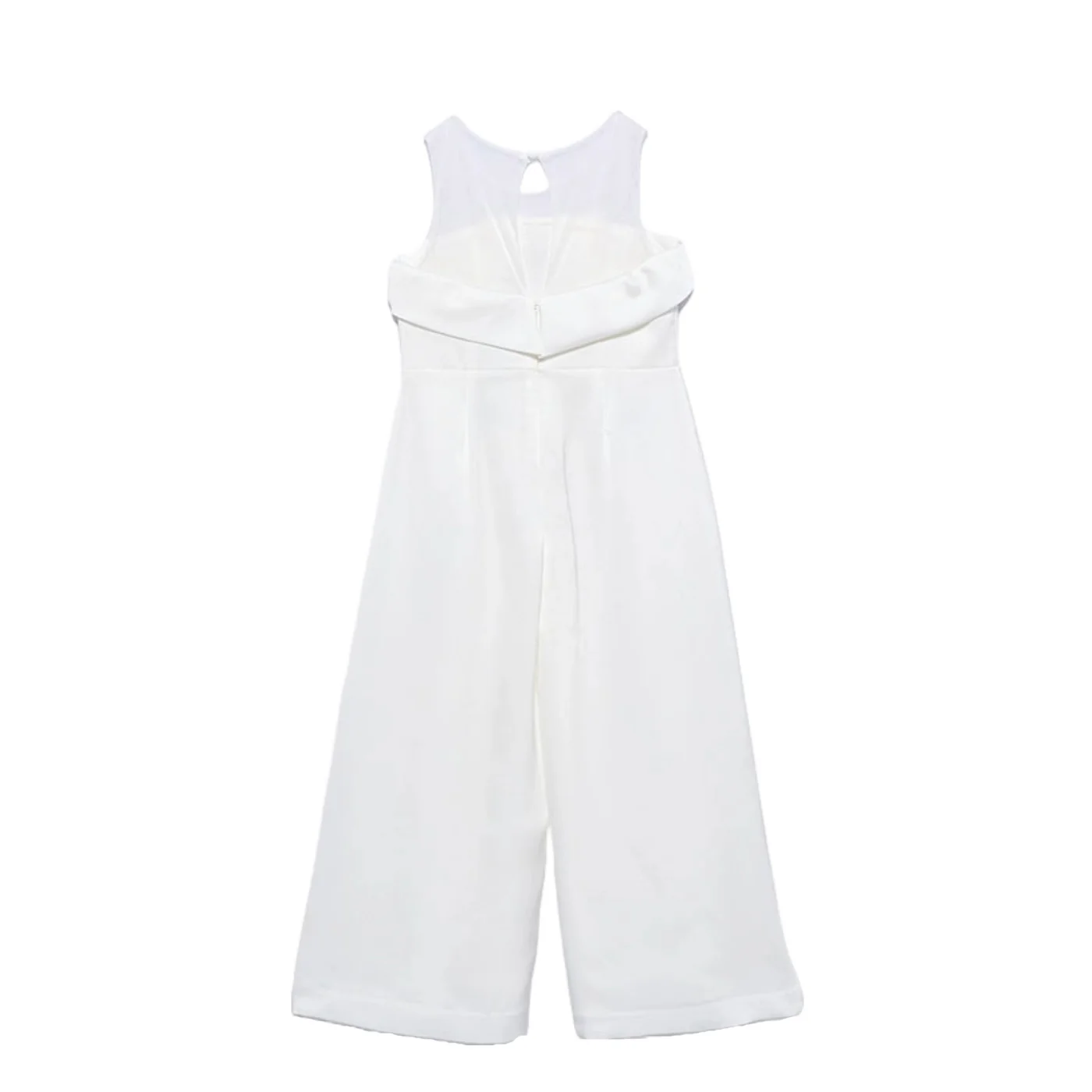 Abel & Lula tuta pantalone elagante bambina in crepรจ bianca Senza maniche Parte superiore in velo Fiocco frontale con balza Parte inferiore a palazzo Chiusura con cerniera nascota e bottoncinoComposizione: 100% poliestere fosera 100% cotoneMade in CinaCollezione Primavera Estate Vestibilitร :Taglia Etร