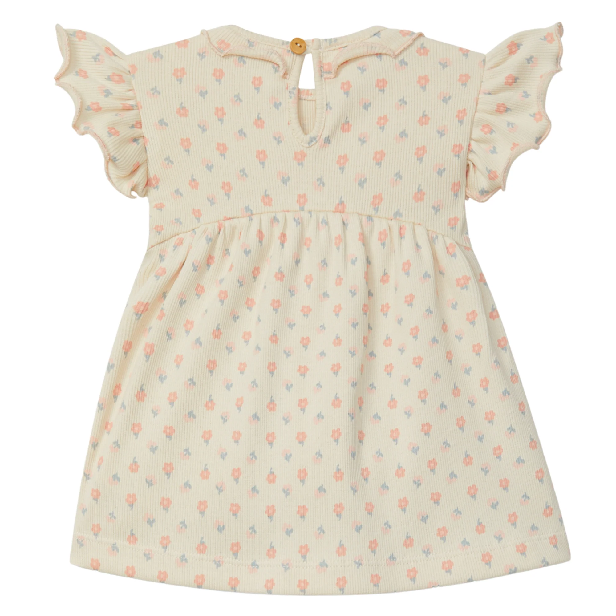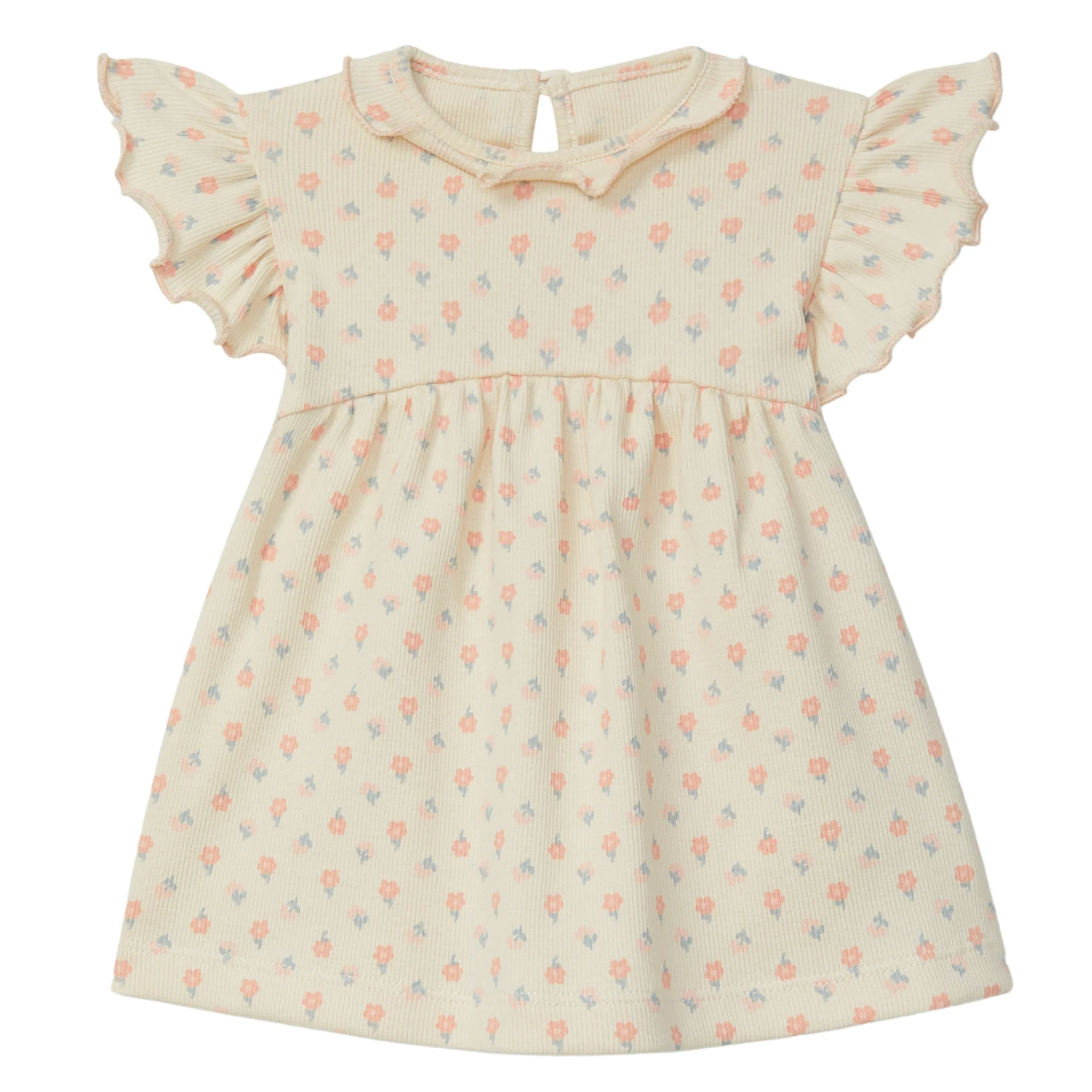 Vestito jersey di cotone organico a costine con stampa floreale. Volant su colletto e maniche. Apertura a forma di lacrima nella parte posteriore.