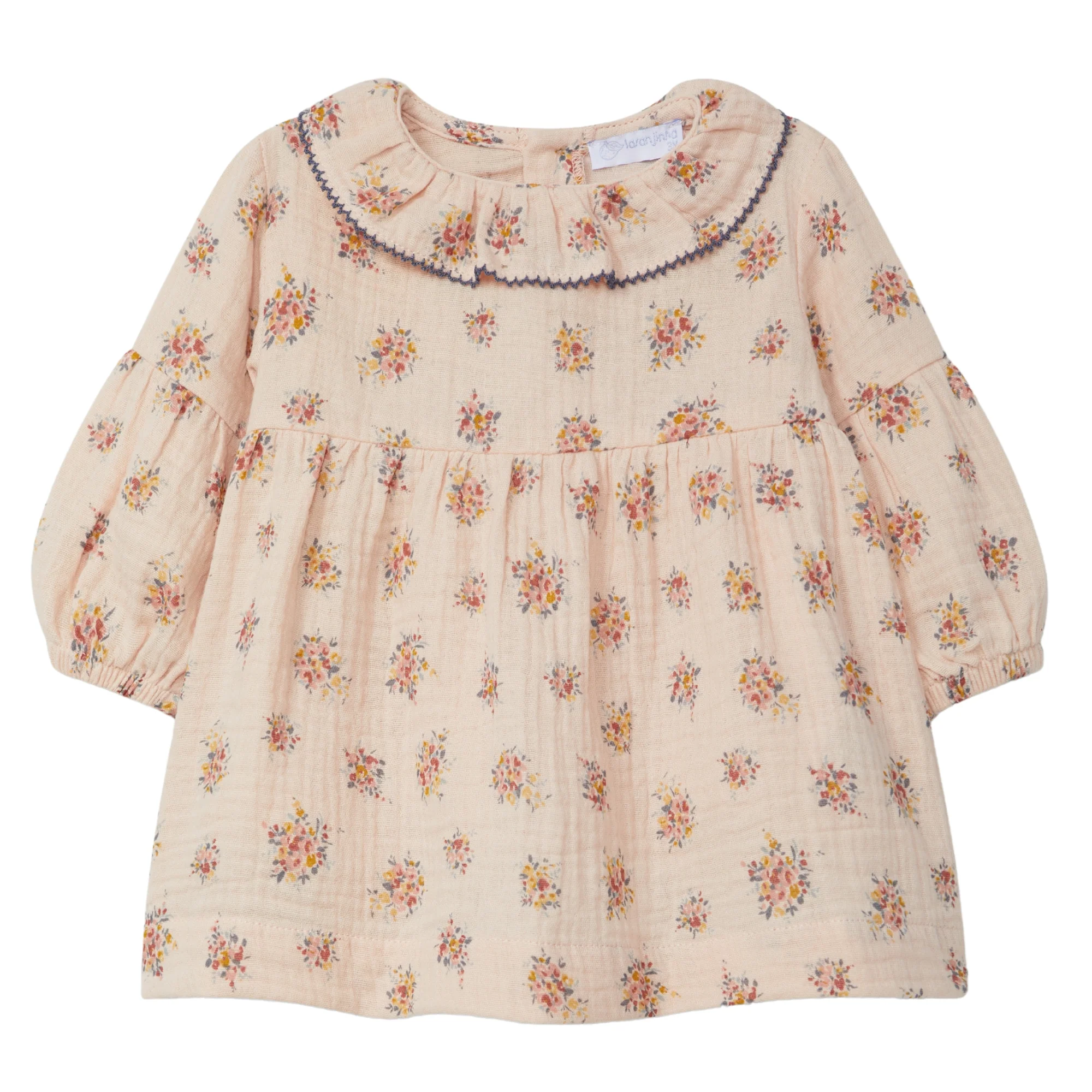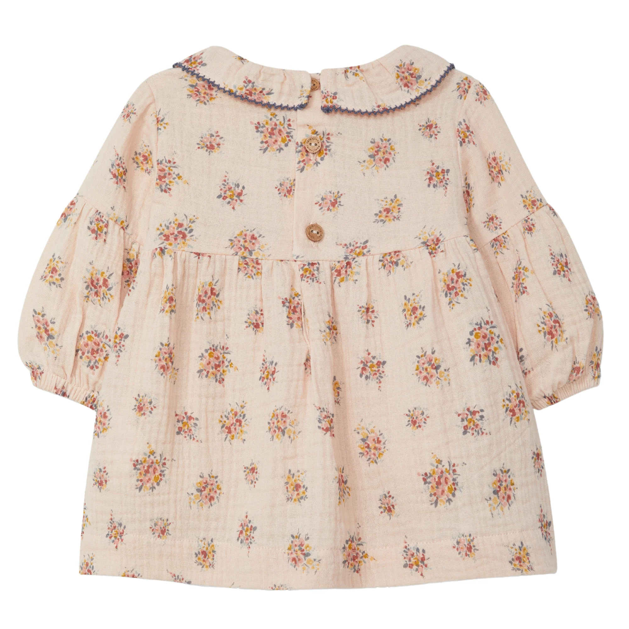 Abito floreale in garza di cotone 100% biologico. Colletto arricciato con bordo in colore a contrasto. Si chiude con bottoni in legno sul retro.