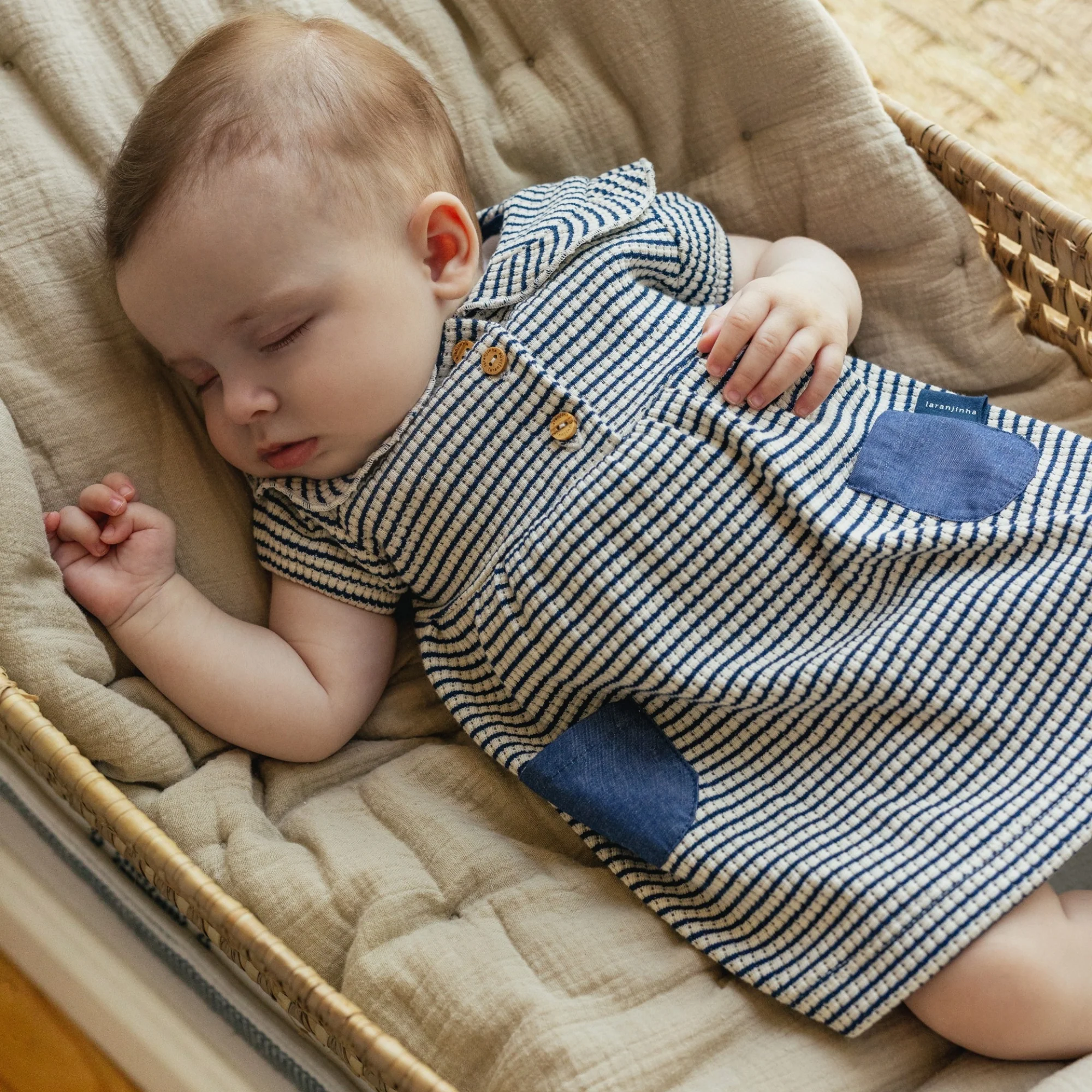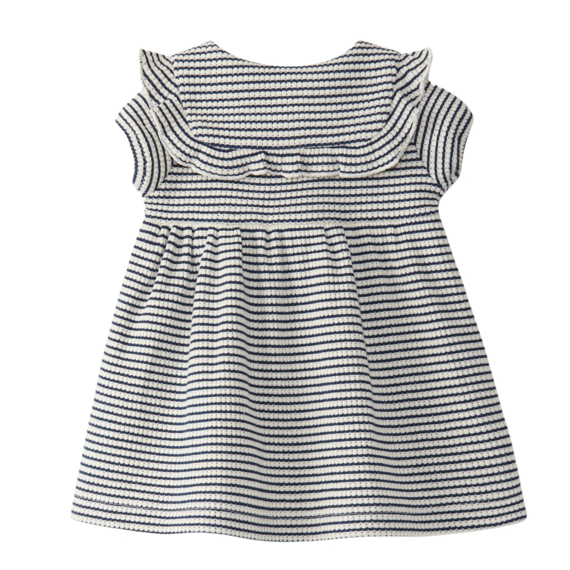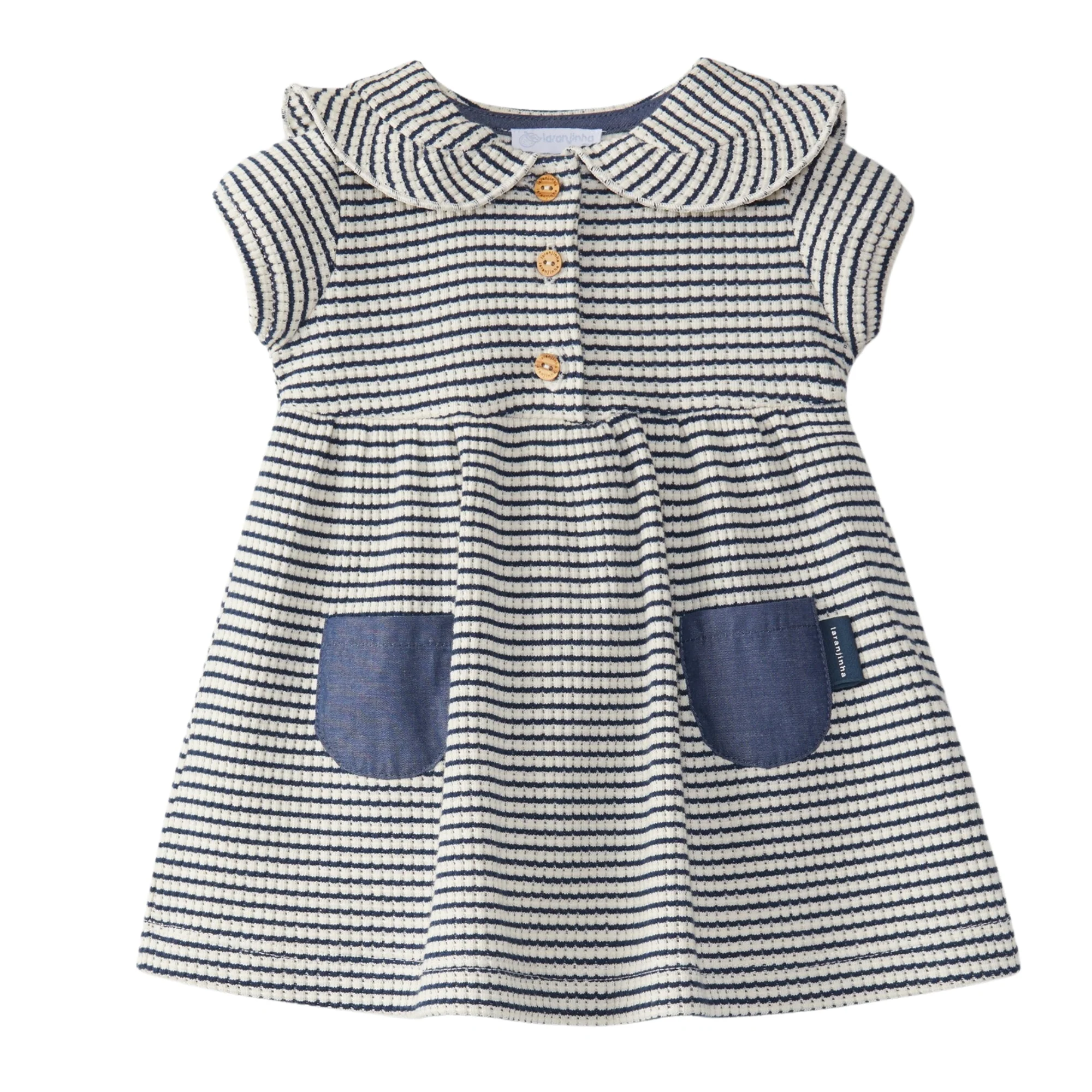 Vestito realizzato in tessuto chambray, grande colletto con dettaglio volant. Si chiude con bottoni in legno sul petto.