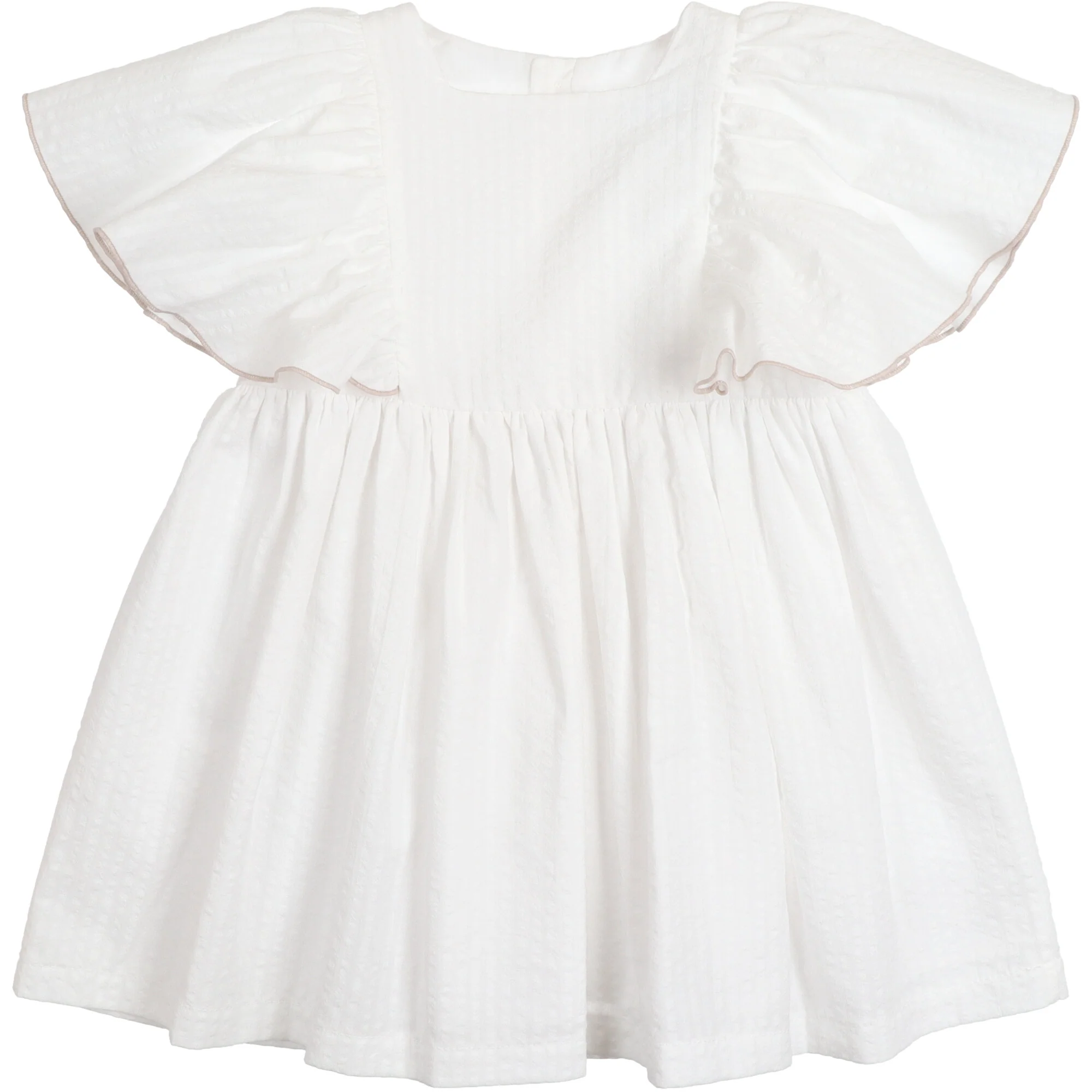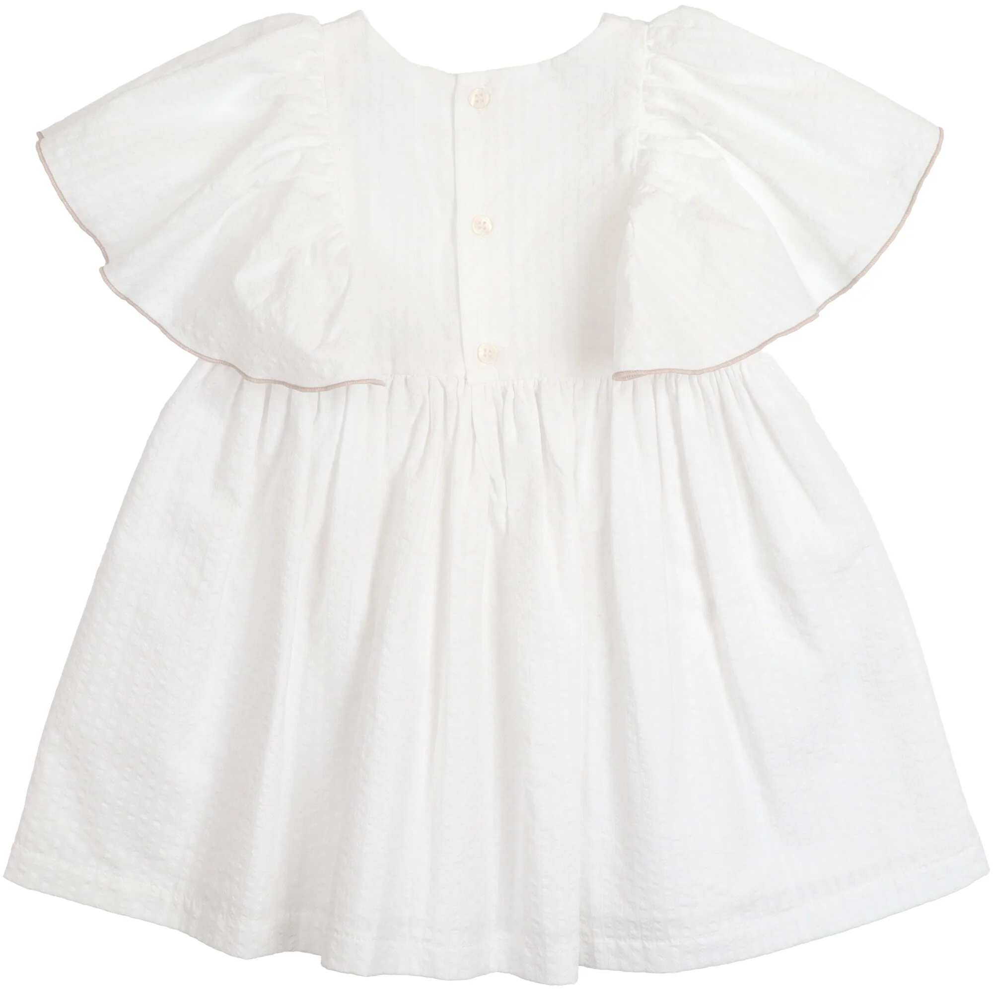 Abito elegante in tessuto 100% cotone lavorato tono su tono. Le maniche a farfalla sono rifinite con un delicato bordo a contrasto color tortora. Il capo รจ completamente foderato internamente e la gonna รจ arricchita da una sottogonna in cotone che dona maggiore ampiezza e struttura. Chiusura posteriore con bottoncini tono su tono. Un vestito raffinato, perfetto per cerimonie, battesimi o occasioni speciali.