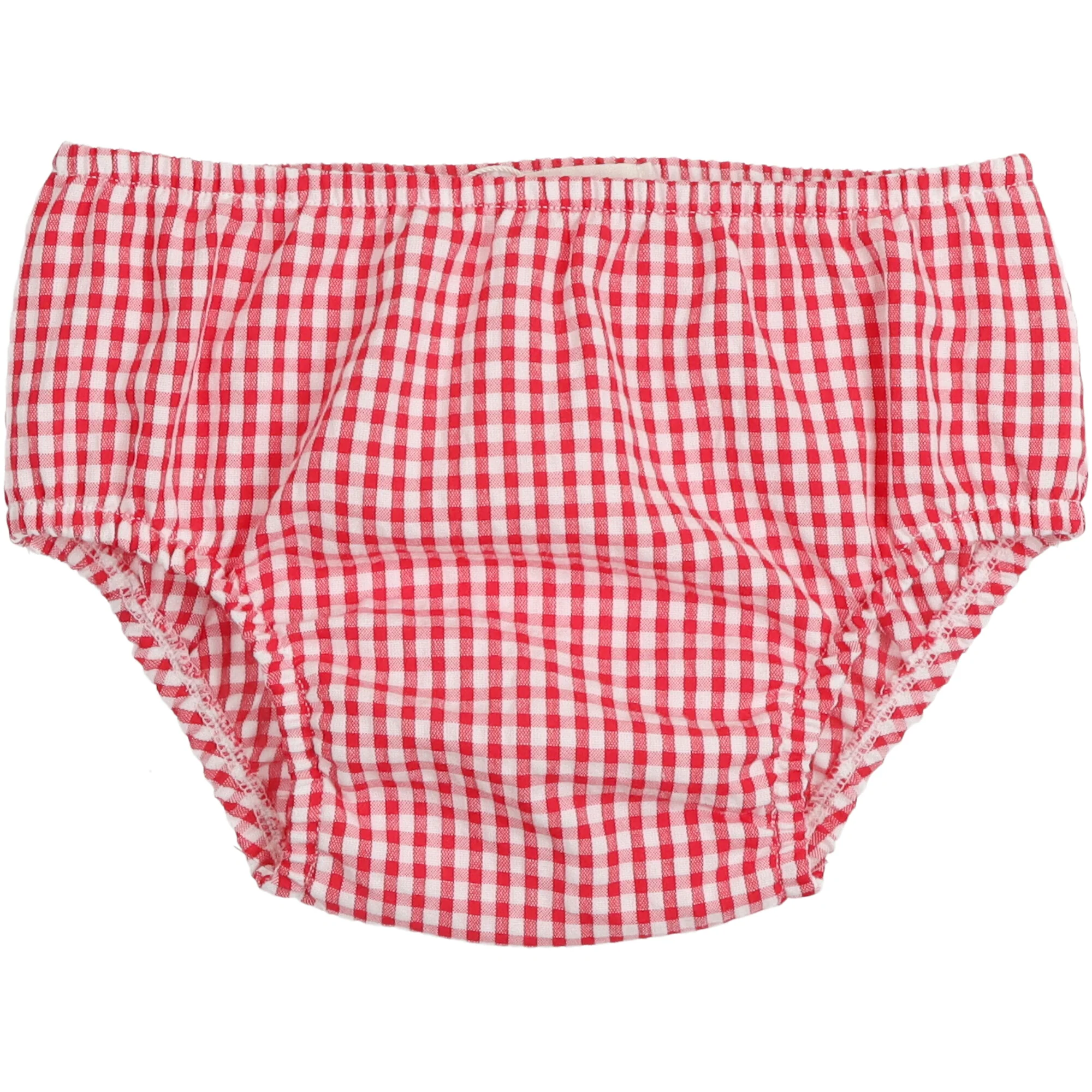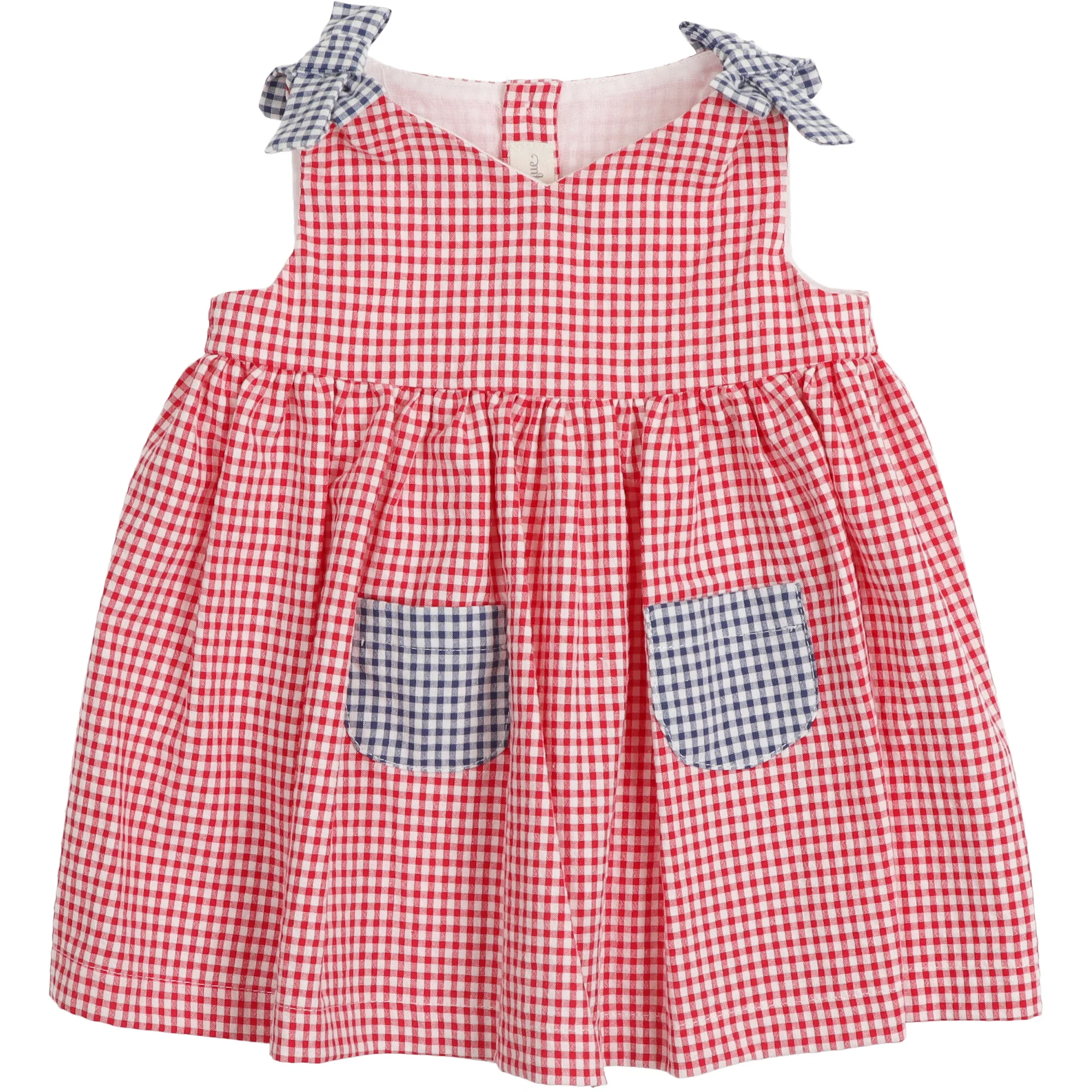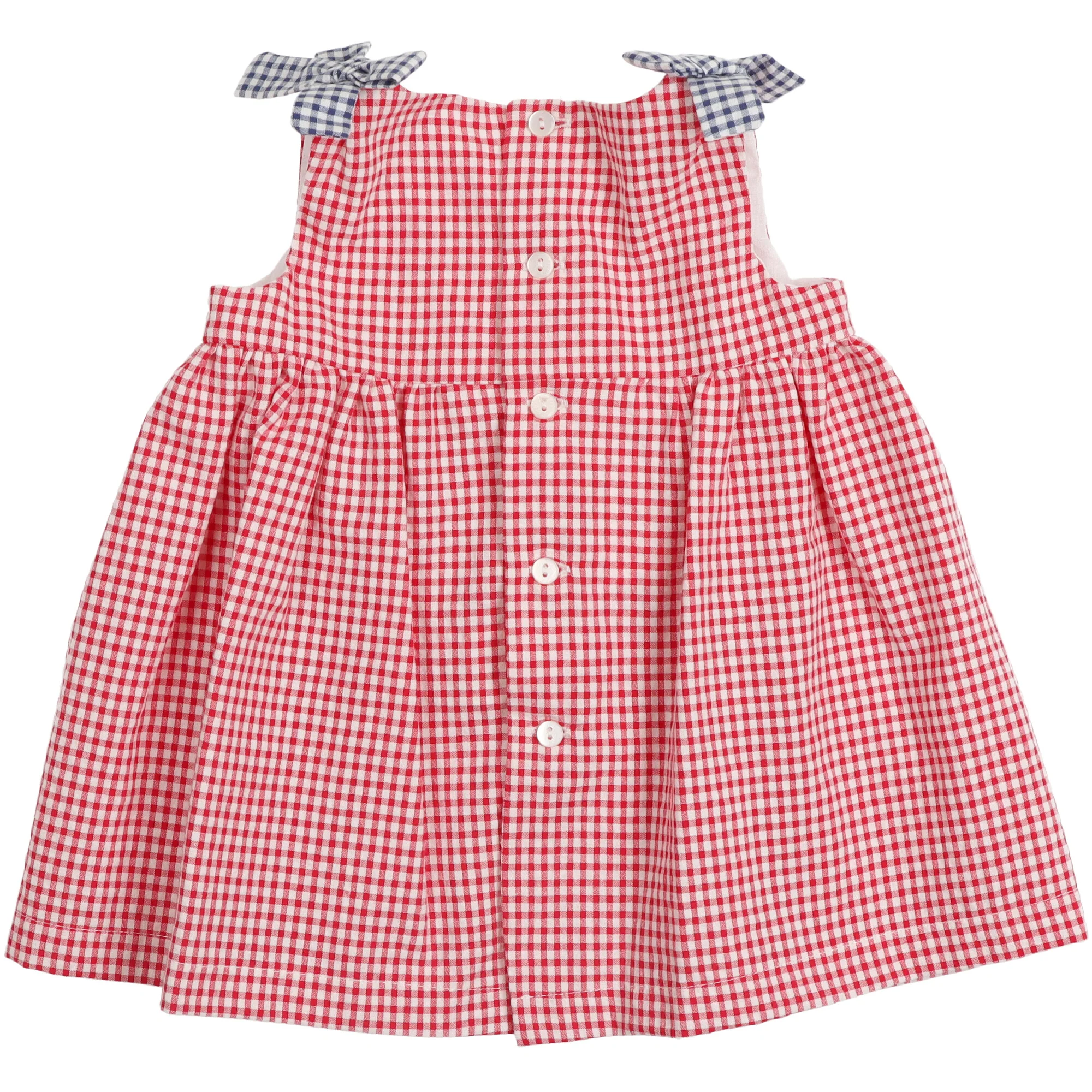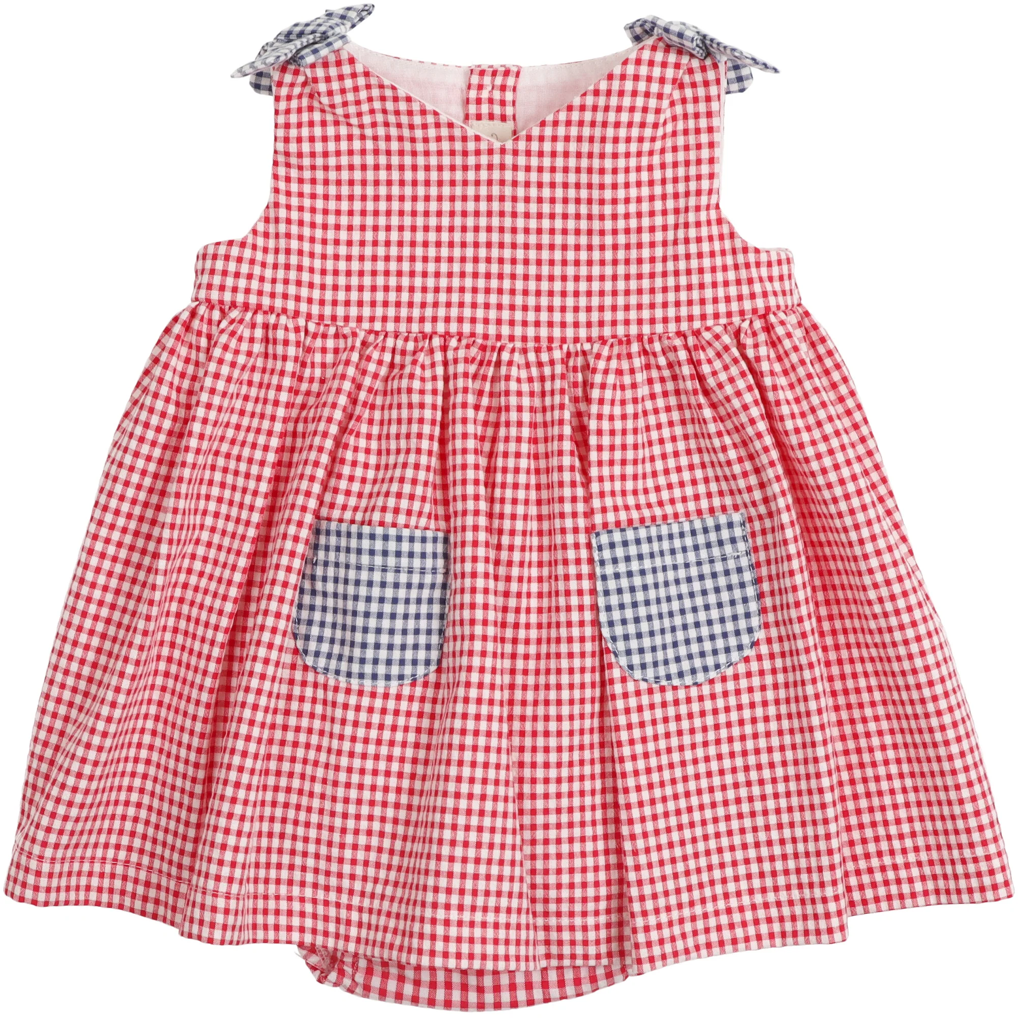 Delizioso abito in cotone a quadretti vichy rossi, con fiocchi blu sulle spalline e taschine frontali in contrasto. Chiusura posteriore con bottoncini. Include culotte coordinata. Fresco, comodo e perfetto per lโestate.