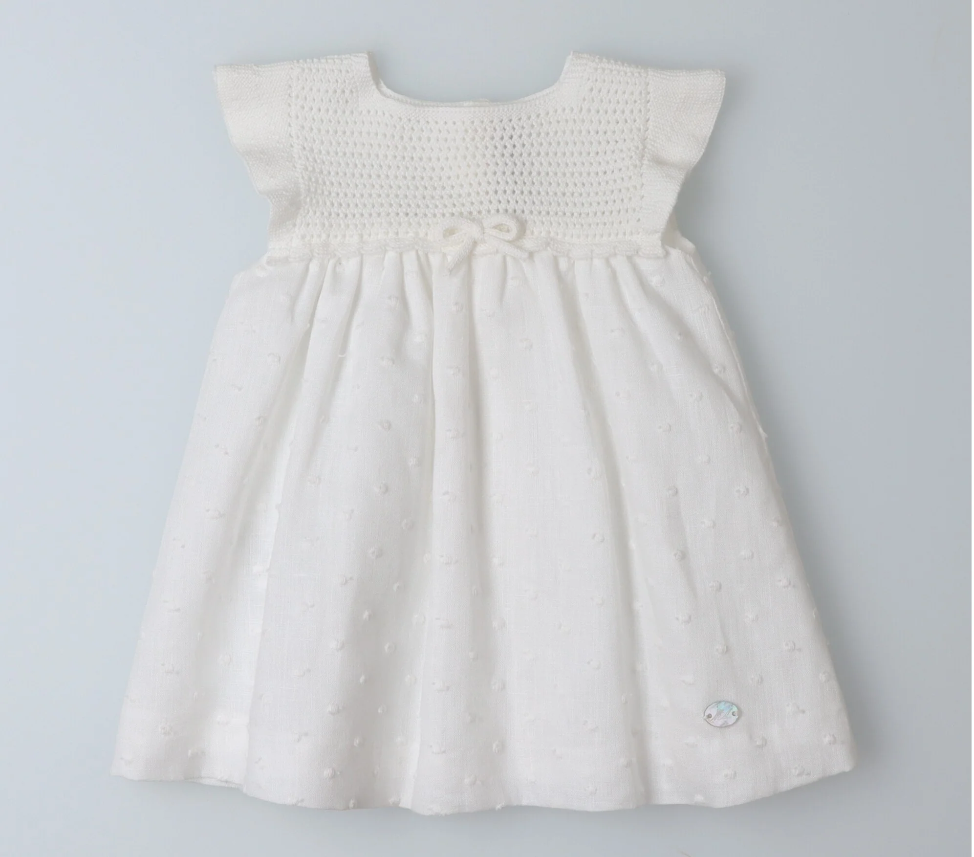 Corpetto in cotone lavorato, rouches sulla spalla, gonna in lino con ricamo pois, morbida sottogonna, chiusura sul retro con bottoni ed asole.