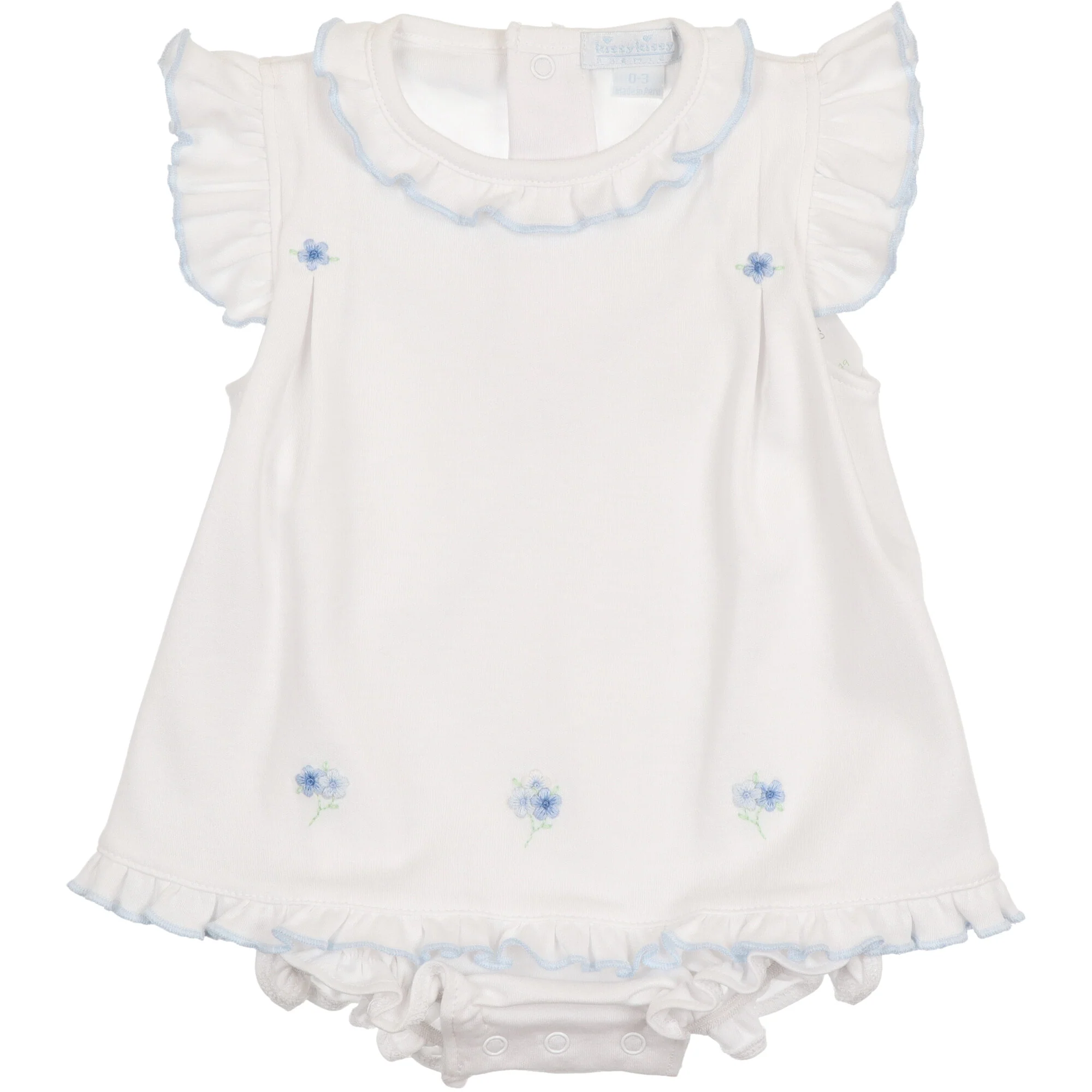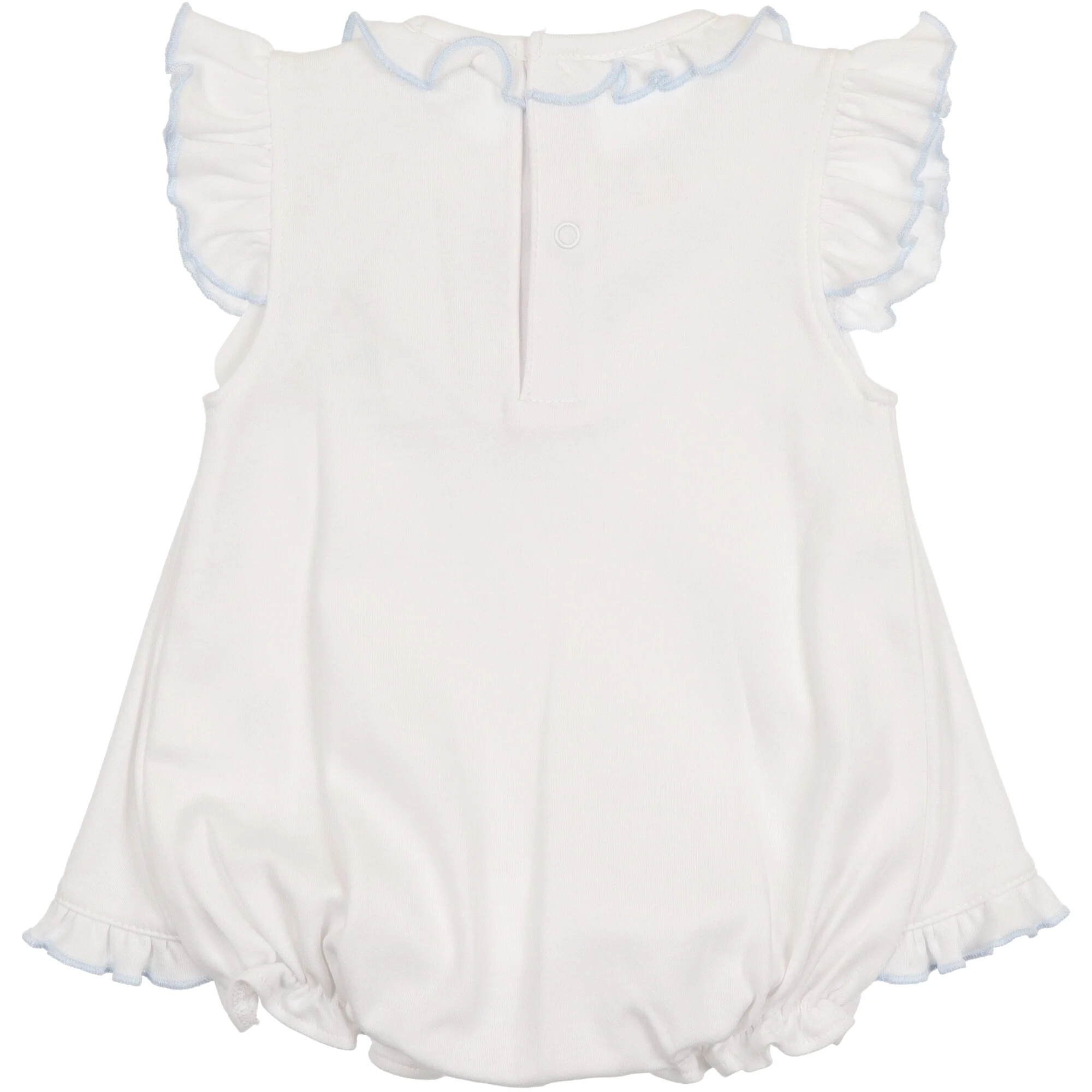 Monopezzo morbido e leggero in cotone pima con delicato ricamo a mano, ampia vestina con volant e body, senza maniche rifinito con rouches, chiusura dietro e sul cavallo con bottoni a pressione, morbido elastico sulle cosce.