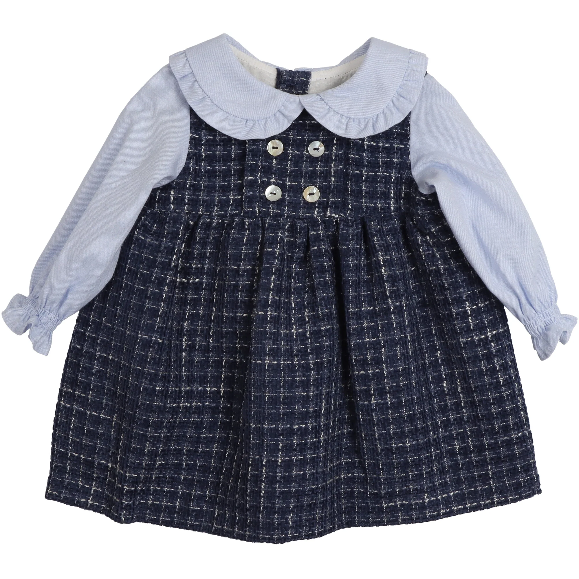 Vestito monopezzo realizzato in blouclรจ colore blu, corpetto definito da bottoni di decorazione, maniche e collo tessuto camicia. Si chiude con bottoni sulla schiena. Fodetato.