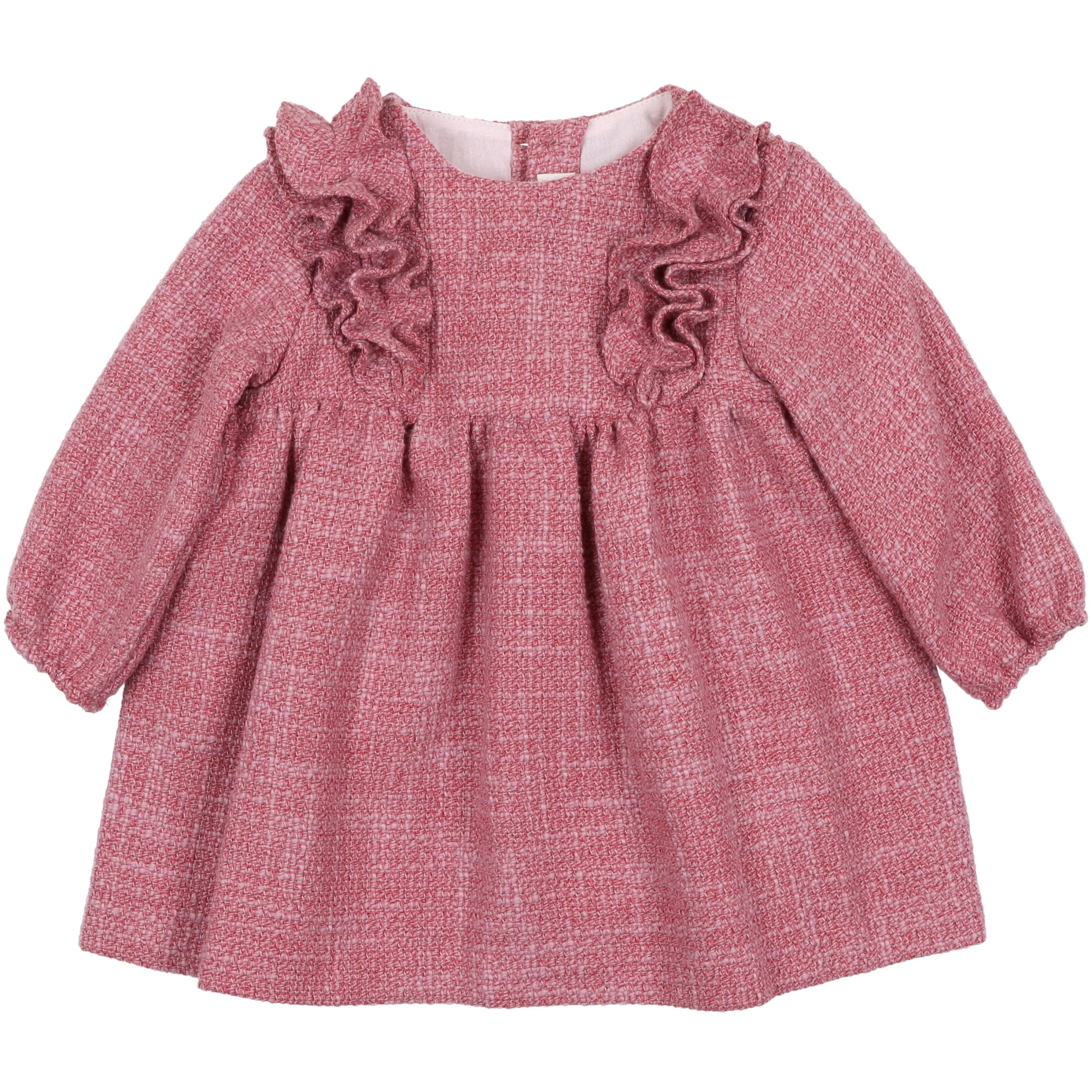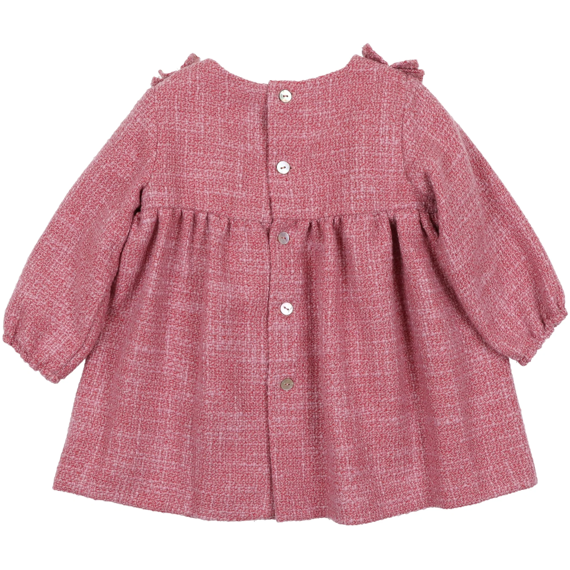 Vestito realizzato in blouclรจ colore rosa, corpetto definito da una doppia rouches. Si chiude con bottoni sulla schiena. Fodetato.