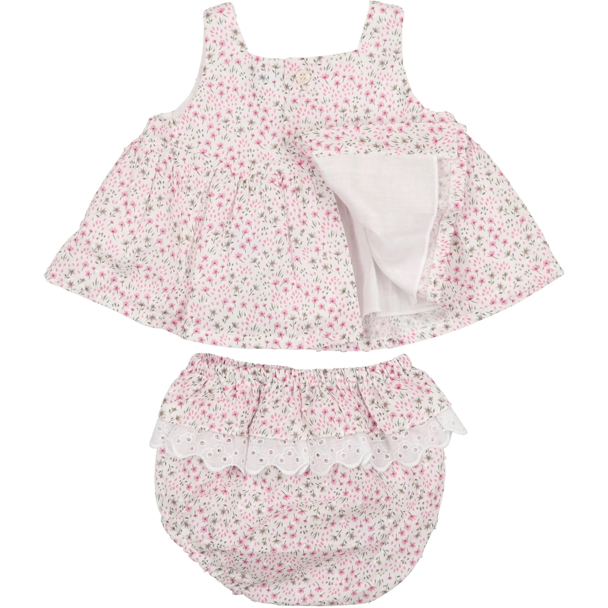 Blusa in tessuto plumetรฌ, foderata e decorata con fiocco bianco, apertura sul retro con bottoni. Coulotte abbinata con morbido elastico in vita e sulle coscie, doppio volant dietro.