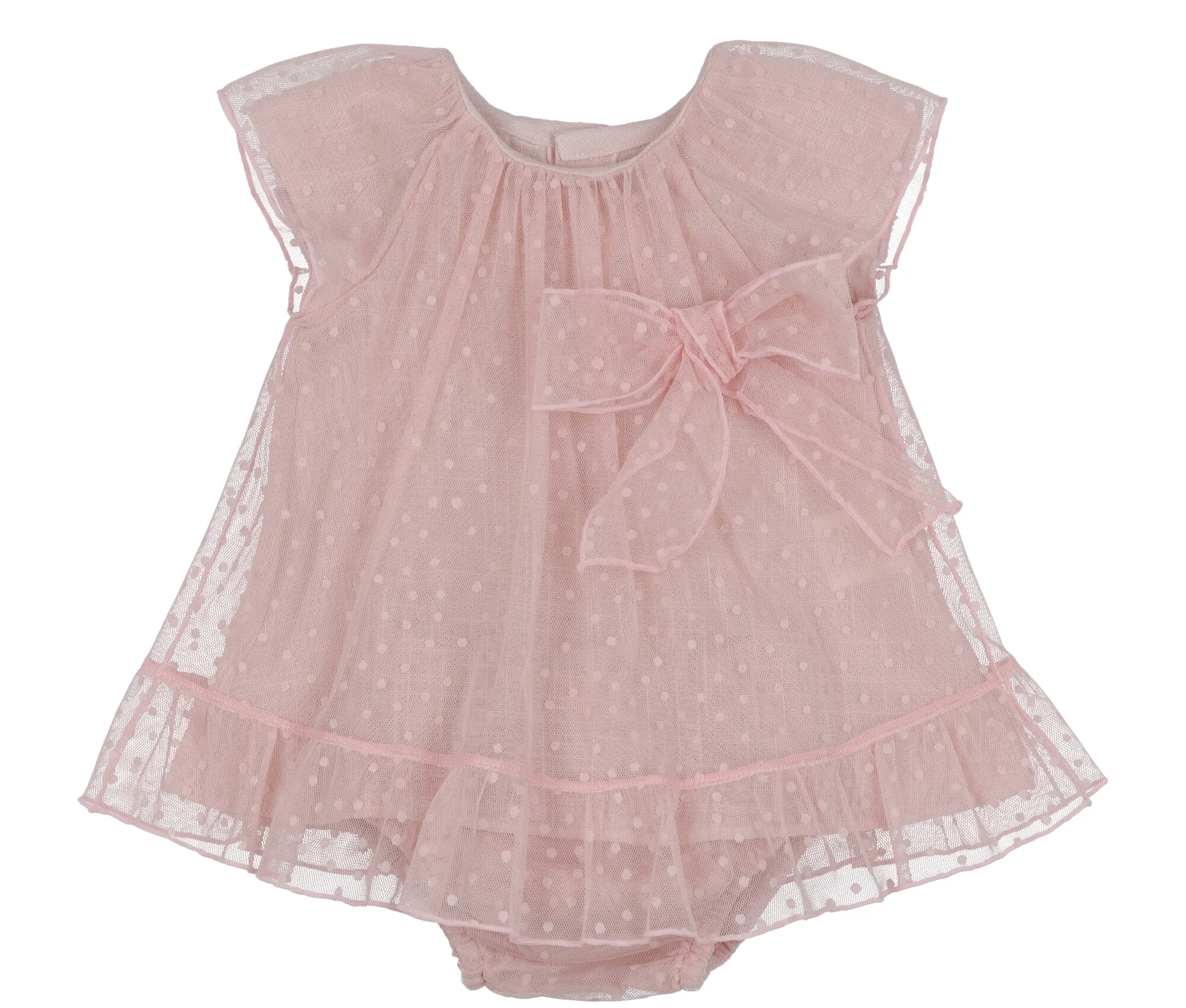 Vestina in tulle rosa ricamato a pois tono su tono con fiocco sul petto, maniche a volant e ampia balza sull’orlo. L’abito e la coulotte sono completamente foderate in cotone. Apertura dietro con bottoni ed asole.