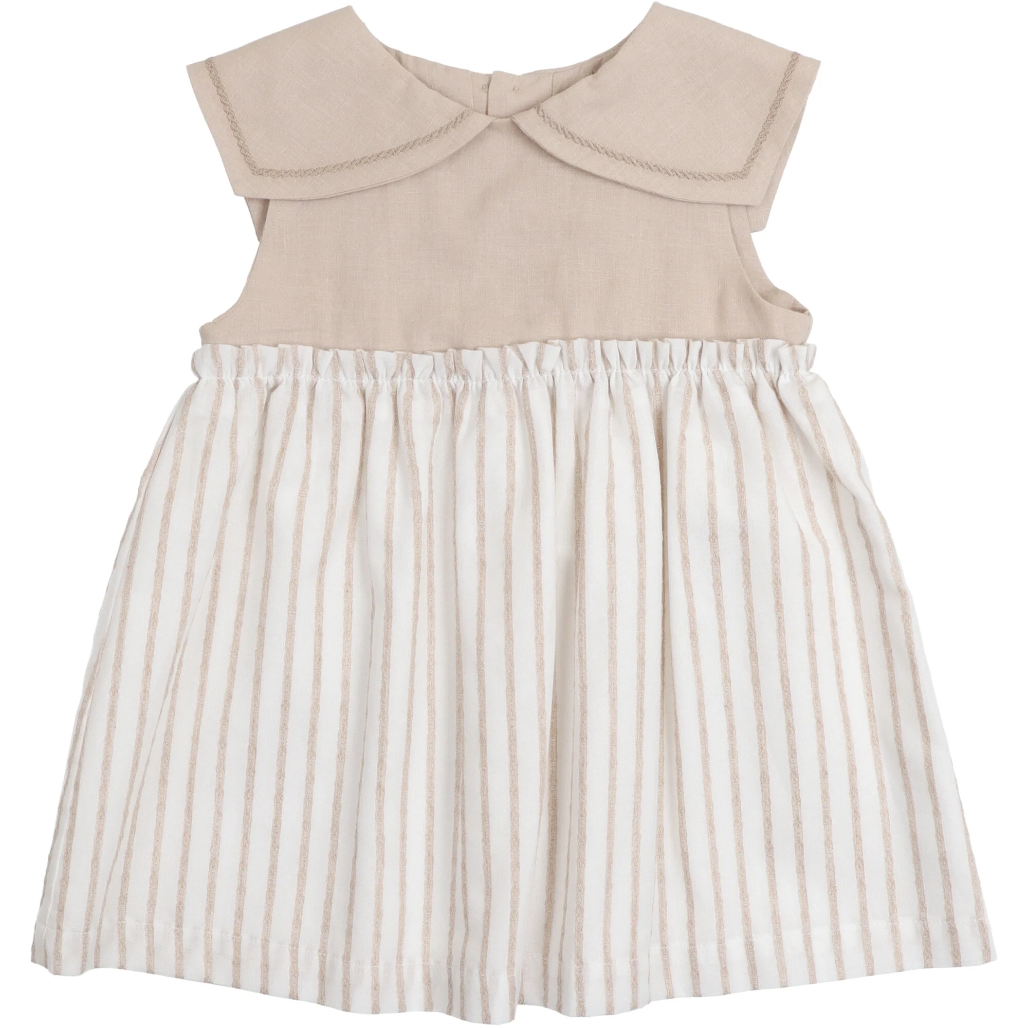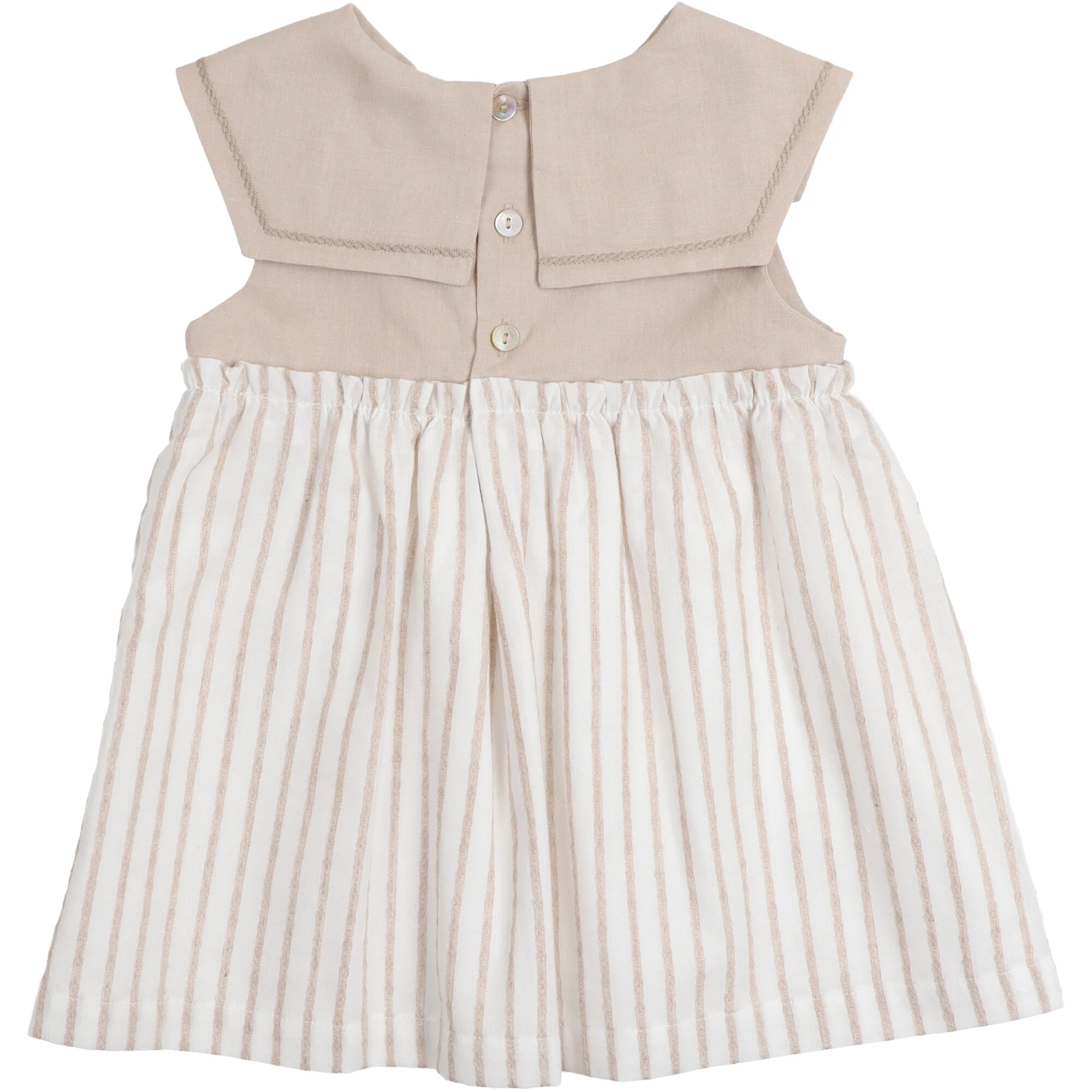 Vestito realizzato in due tessuti, la parte superiore in lino con collo alla marinara e dettaglio ricamato in tinta. Parte inferiore in morbido cotone con righe in rilievo foderata. Si chiude con bottoni in madreperla sul retro.