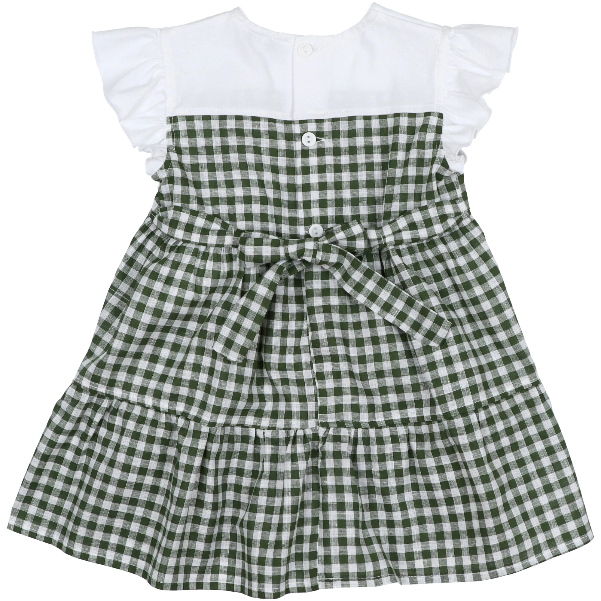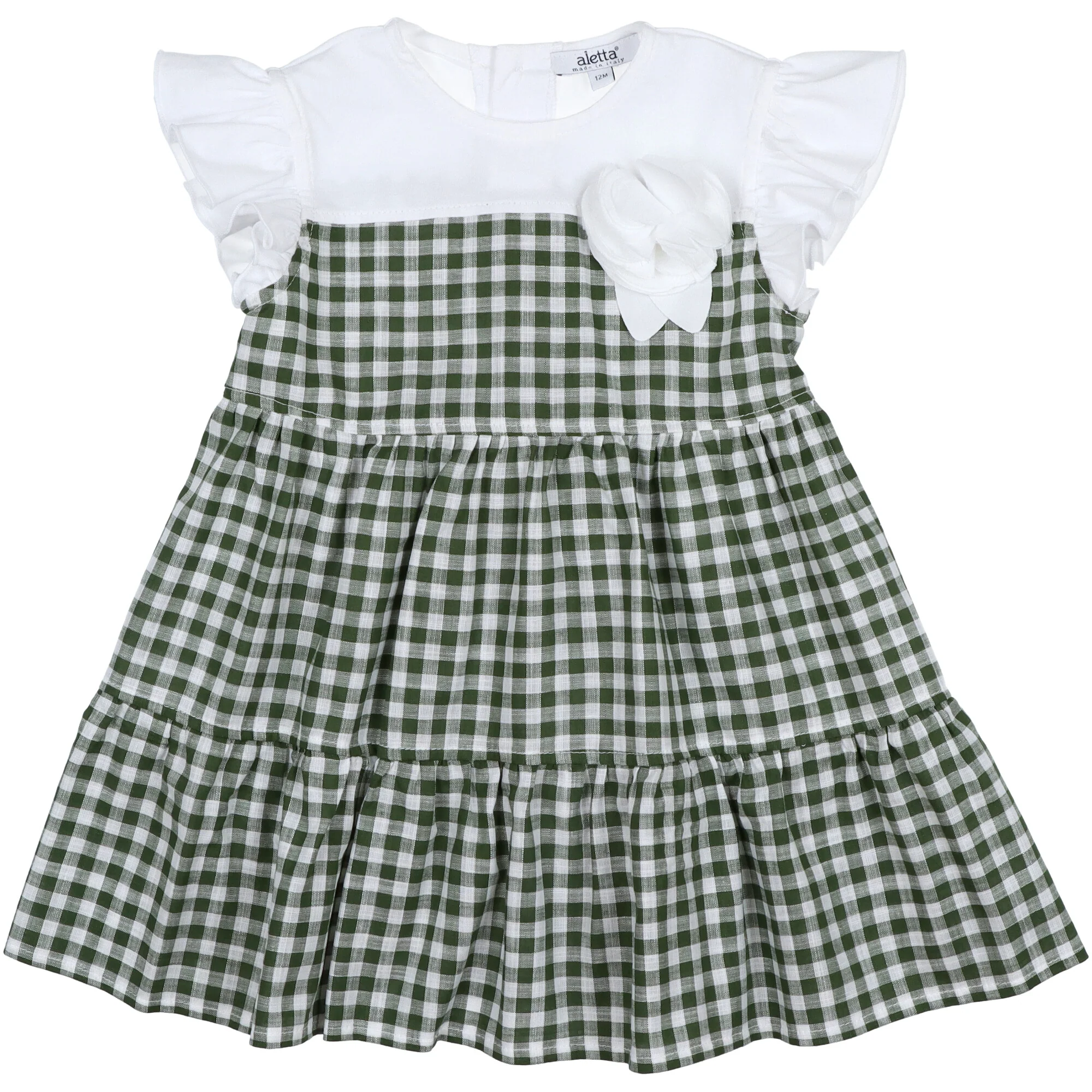La parte alta del corpetto e il volant del giro manica รฉ realizzato in jersey colore bianco il resto dell’abito e in tessuto vicky verde con trama effetto lino, gonna increspata. Decorato con fiore a petali e foglie cuciti a mano. Apertura dietro con bottoni ad asola e nastro con fiocco decorativo dietro. Completo di coulotte realizzate in cotone vicky verde con morbido elastico in vita e sulle cosce. Autentica manifattura italiana.