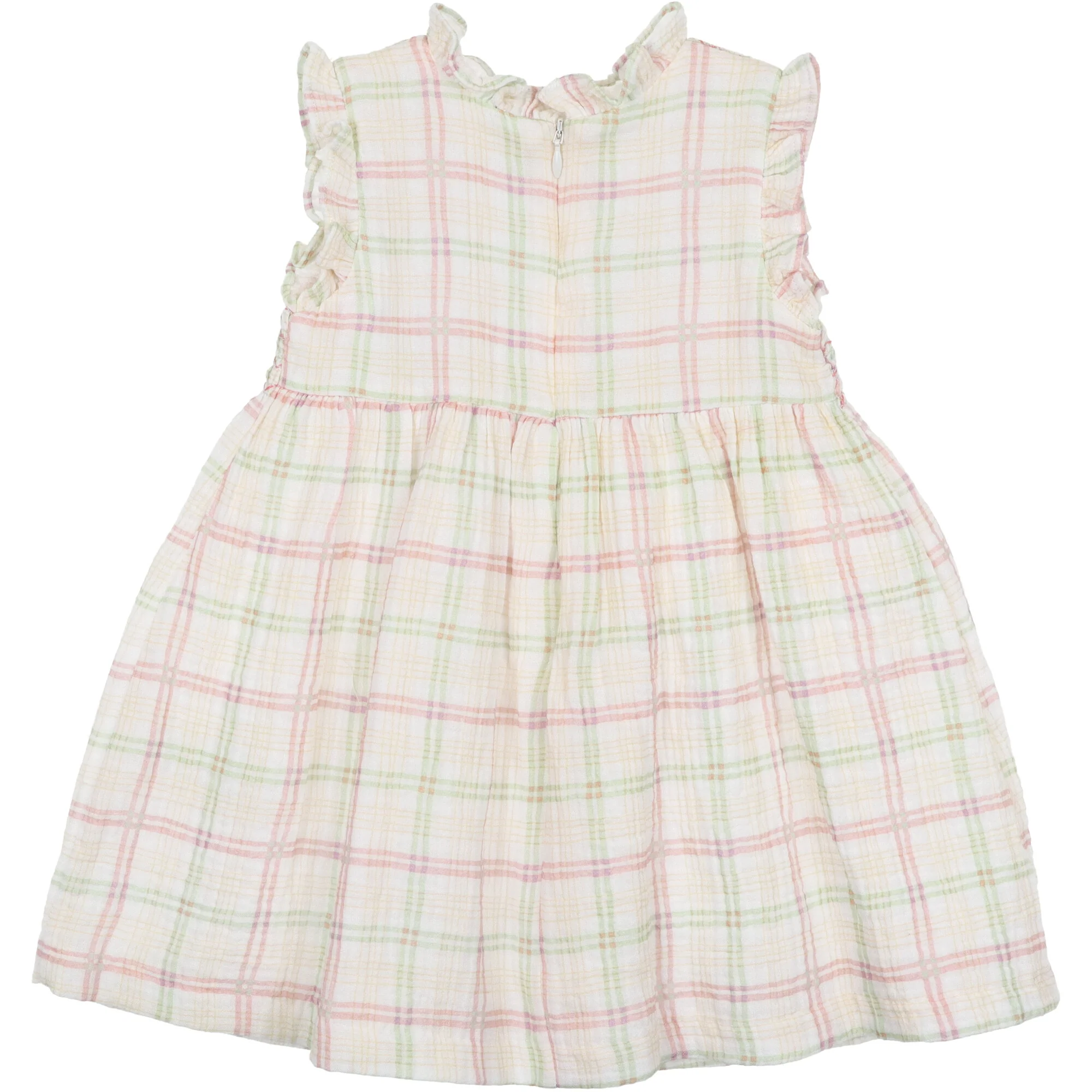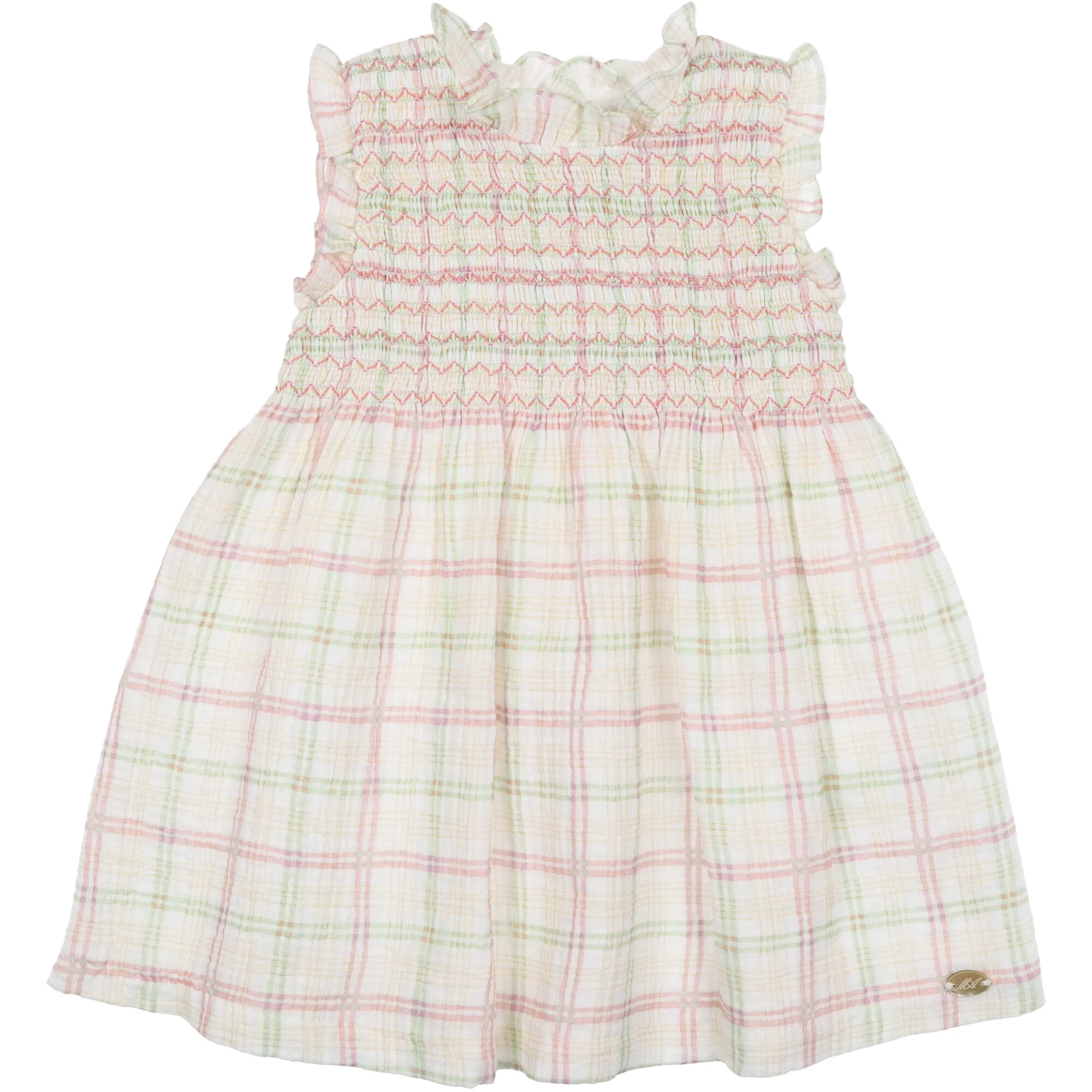 Abito in mussola con stampa a quadretti, corpetto con delicata smockatura, volant sulle spalle e collo. Si chiude con cerniera sulla schiena.