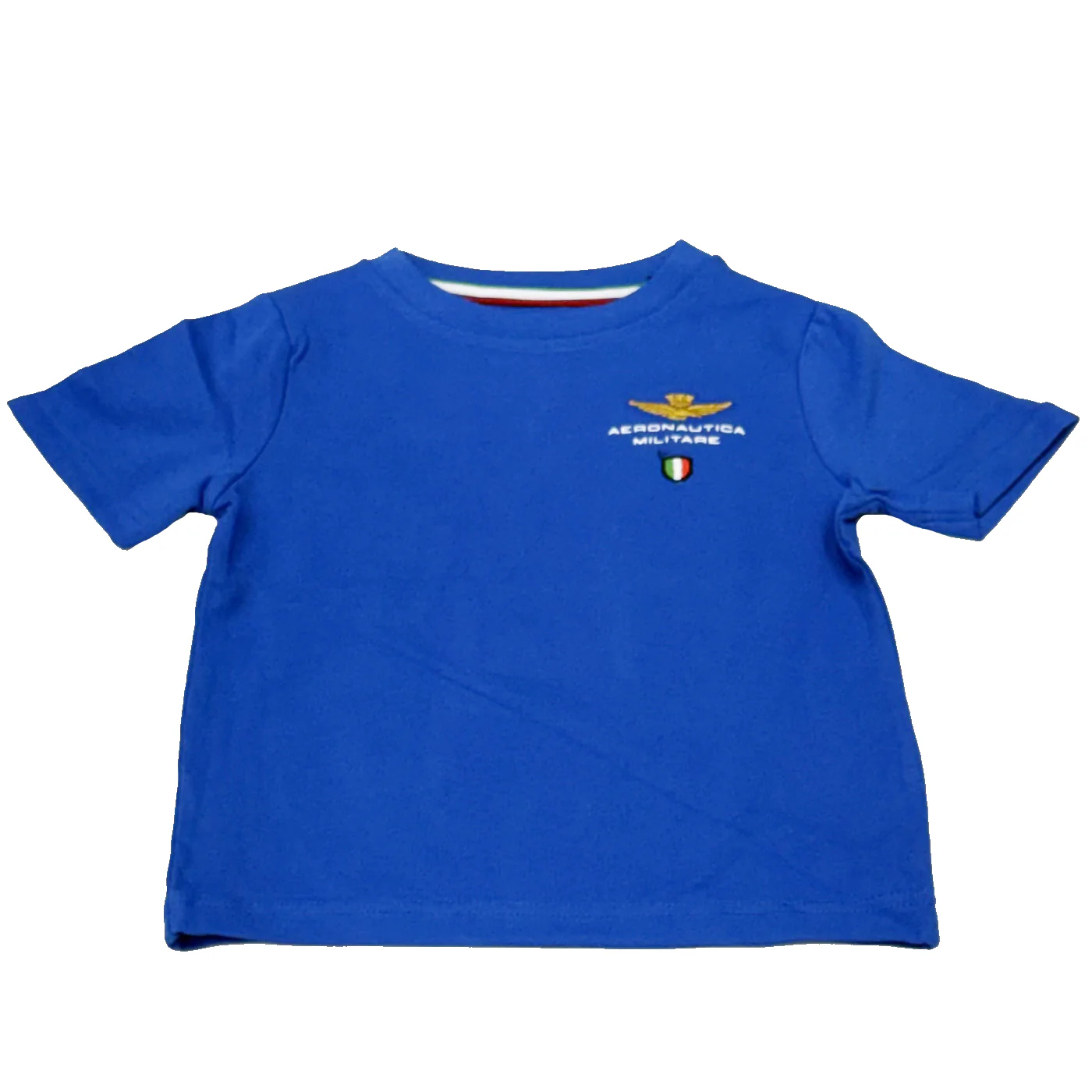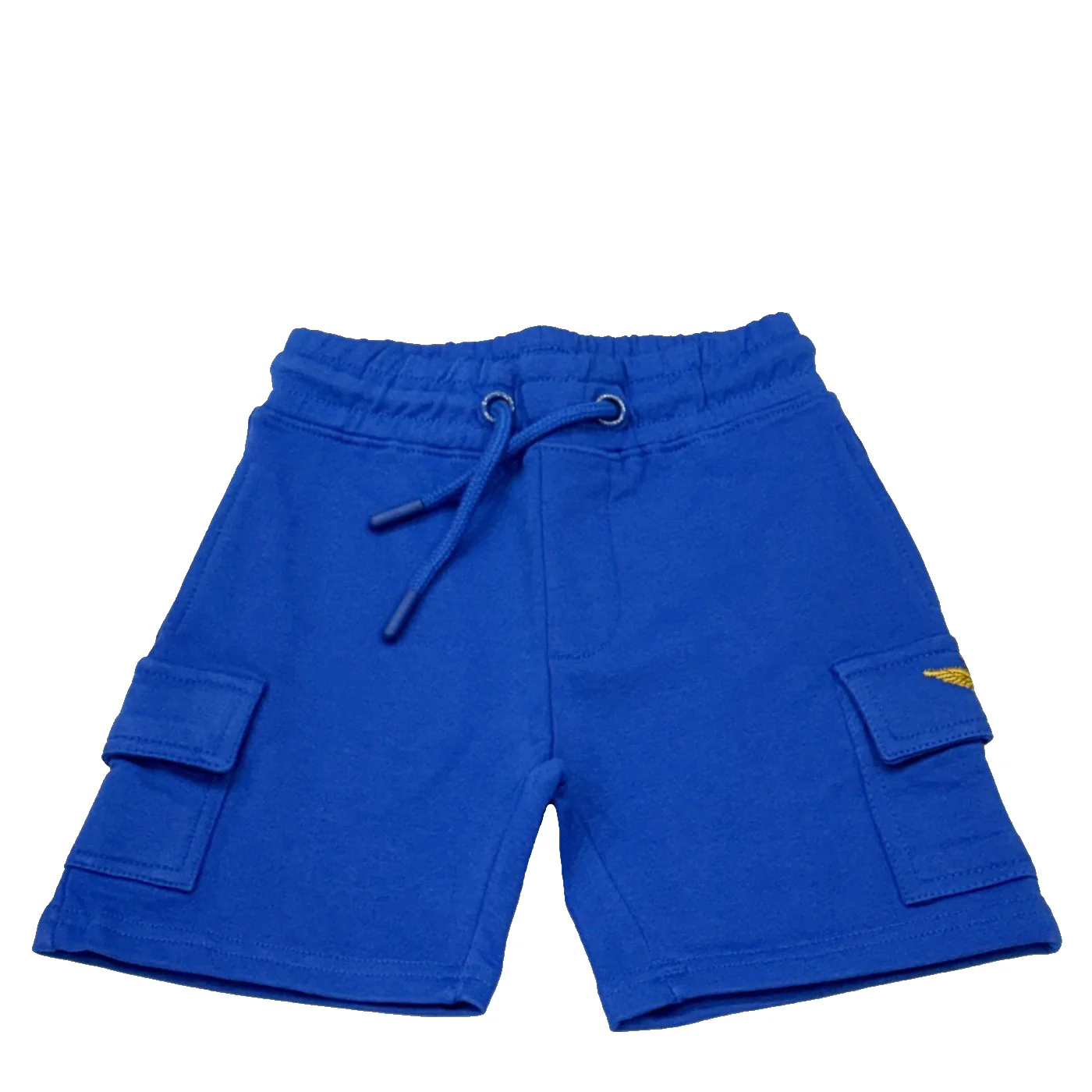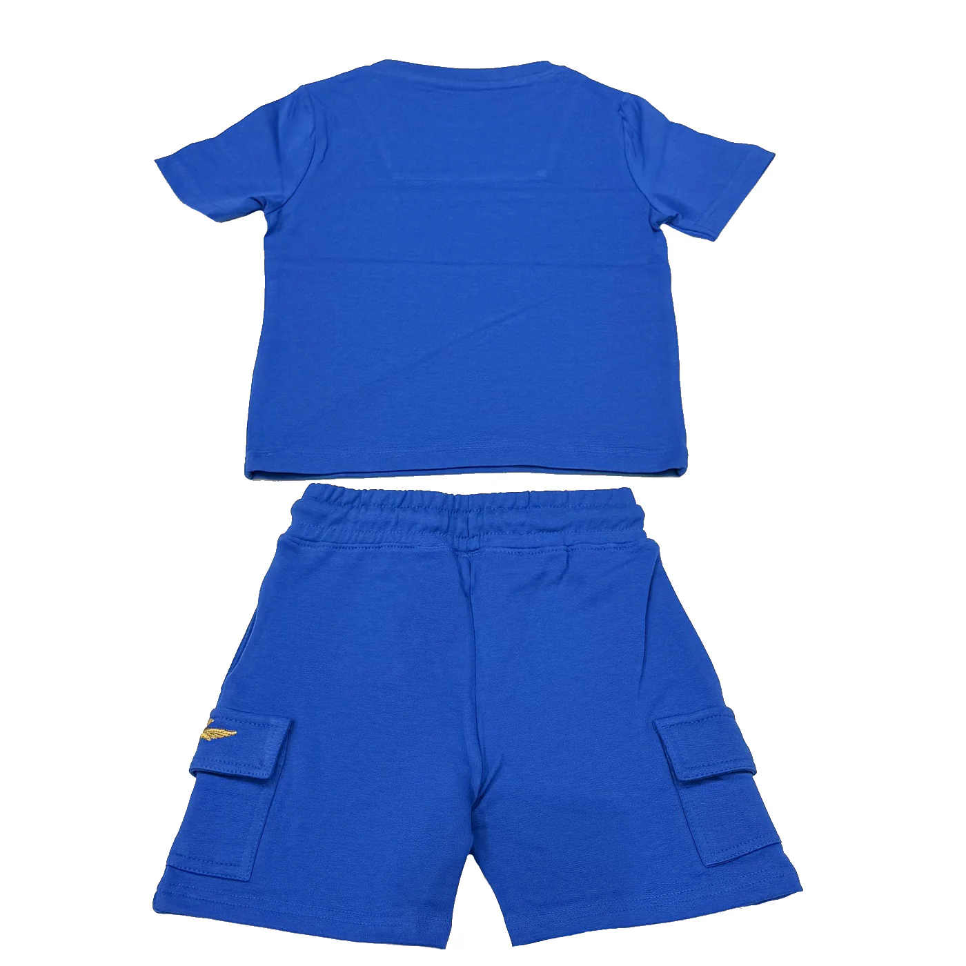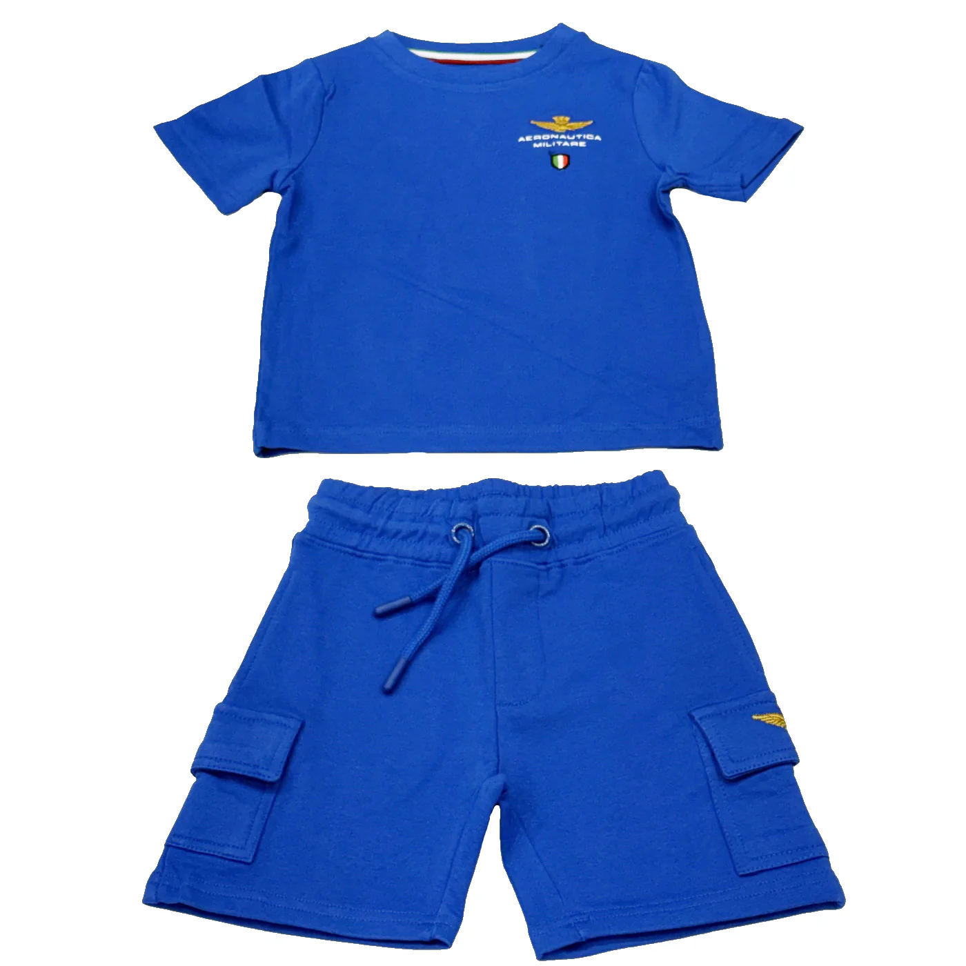 Aeronautica Militare completo due pezzi bambino in cotone blu royal T-shirt girocollo Maniche corte Ricamo logo lato cuore Bermuda in cotone garzato Vita elastica con coulisse regolabile Tasche a filo Tasconi laterali con ricamo logo Composizione: 95% cotone 5% elastanMade in IndiaCollezione Primavera Estate Vestibilitร :Taglia Etร