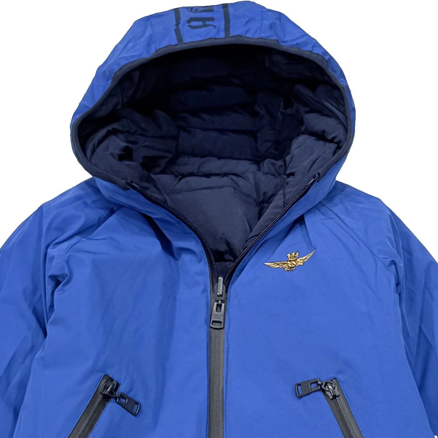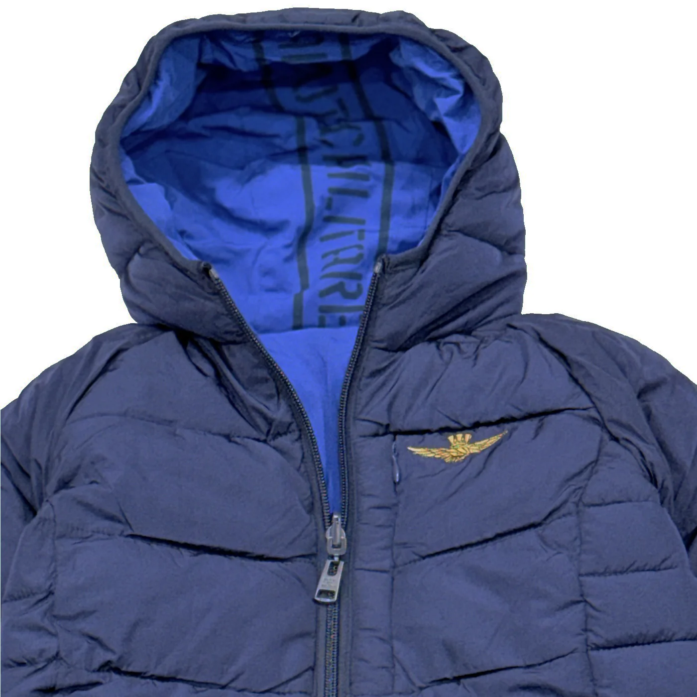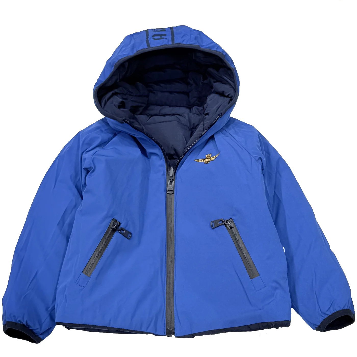 Aeronautica Militare giubbino double-face bambino blu Cappuccio fisso Lato trapuntato blu Lato liscio blu royal Ricamo logo lato cuore Tasche e chiusura con cernieraComposizione: 100% poliestereMade in CinaCollezione Autunno Inverno Vestibilitร :Taglia Etร