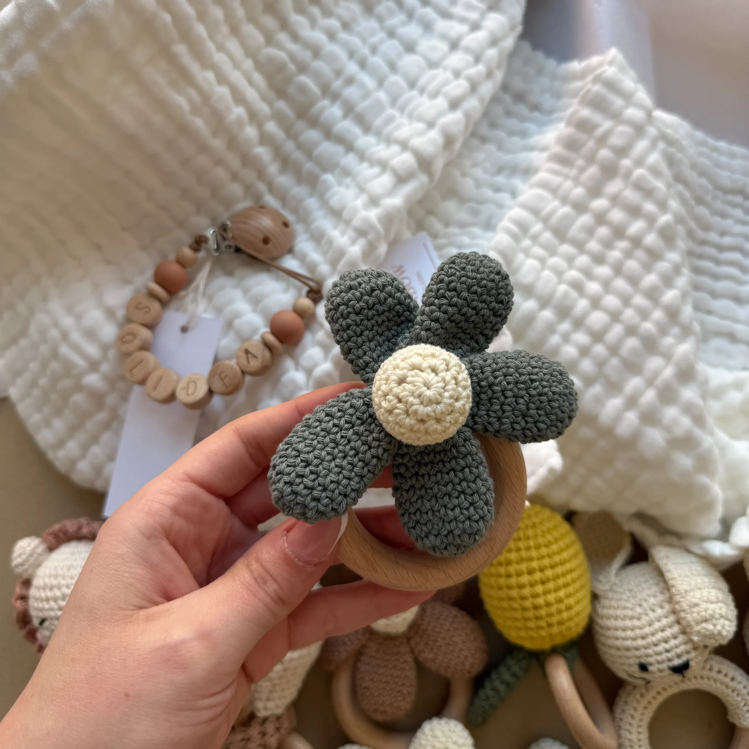 Un Sonaglio a forma di orsetto realizzati in legno di Faggio naturale e cotone all’uncinetto con cura e amore per fornire un bel suono morbido; sono molto leggeri e hanno una forma facile da afferrare per i piรน piccoli. ร indicato come Massaggiagengive per la dentizione ed รจ completamente sicuro per il tuo bambino essendo non tossico e privo di sostanze chimiche.