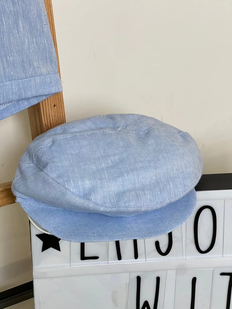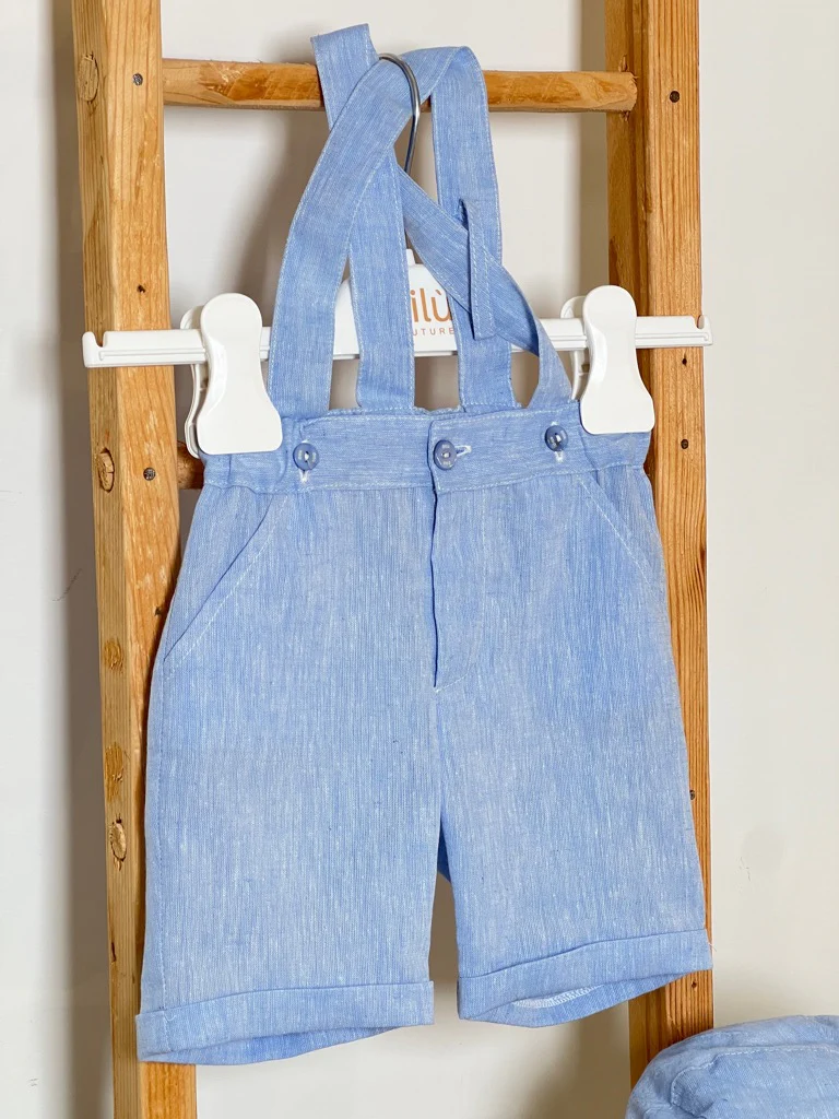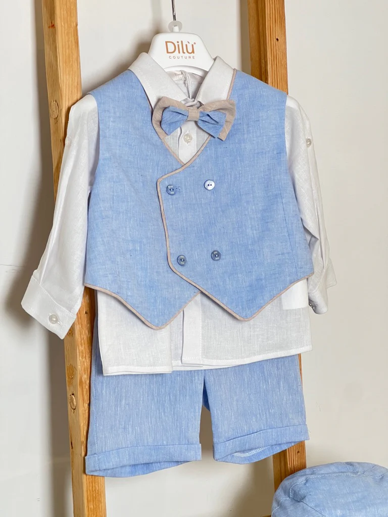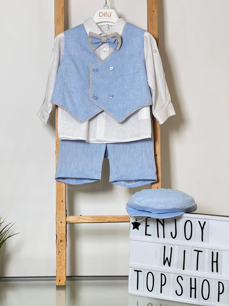 Completo Bimbo Battesimale in 100% lino Panciotto Camicia Salopette e Coppola