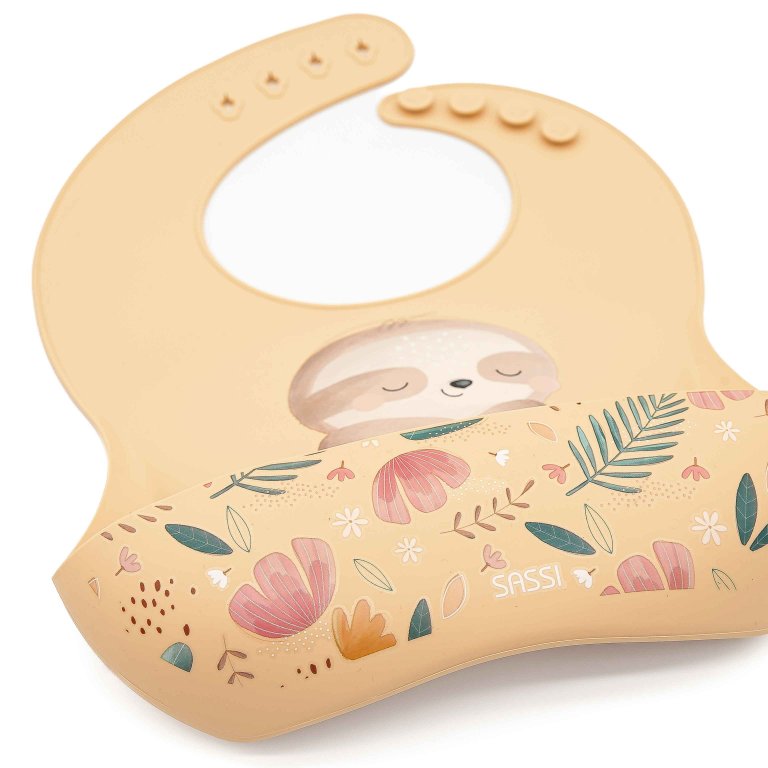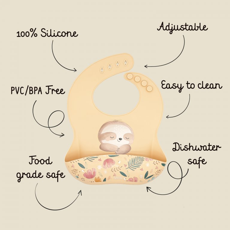 Il bavaglino in silicone con tasca decorato con il paziente bradipo Gnawy è il compagno ideale per rendere l’ora della pappa più serena e ordinata. Pratico, sicuro e facile da pulire, accompagna il tuo bimbo durante tutto il periodo dello svezzamento.