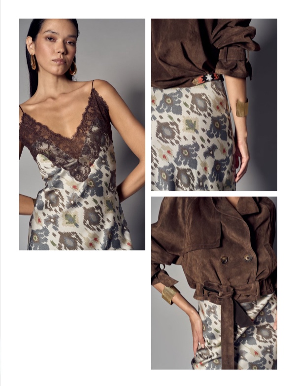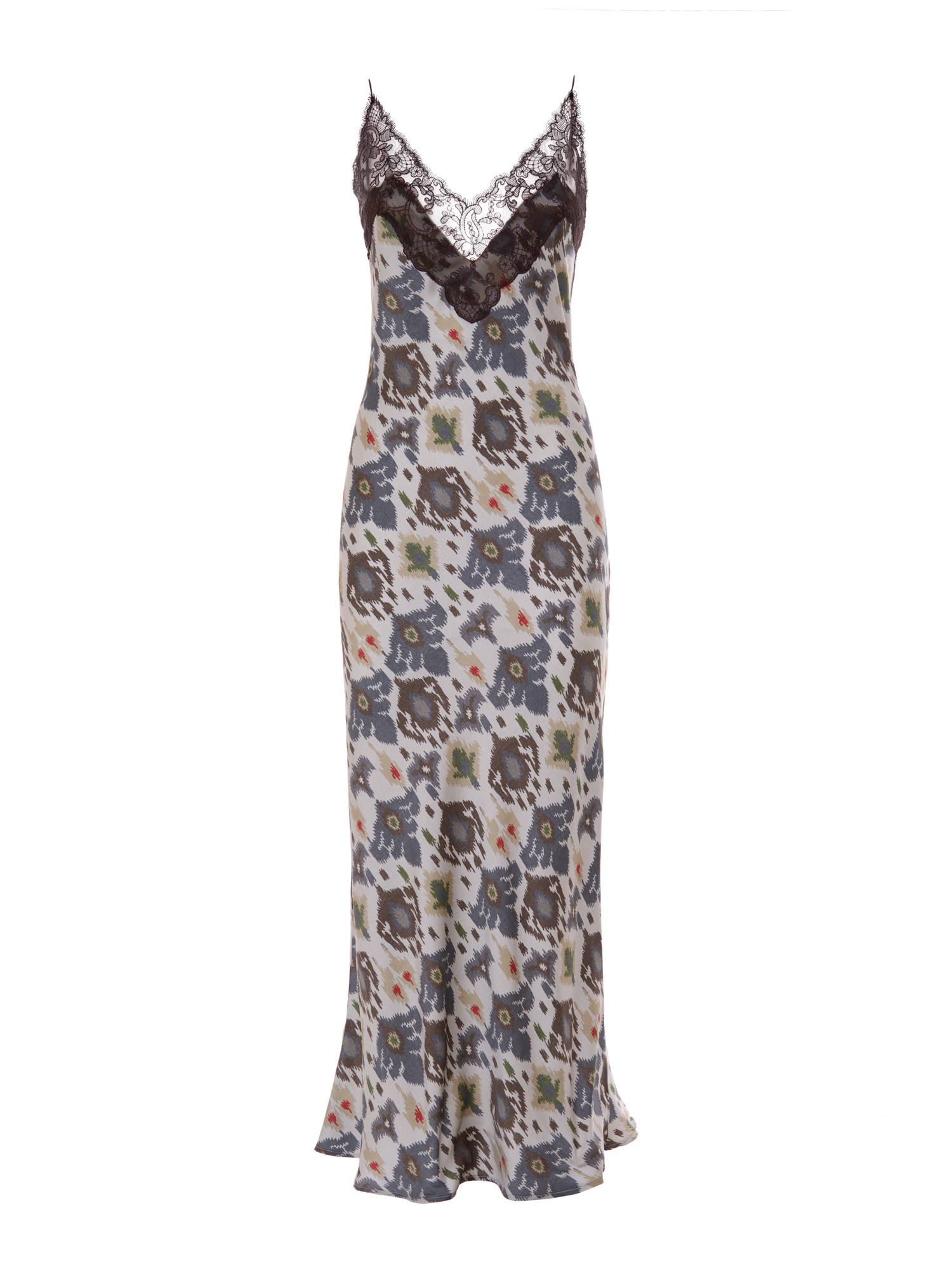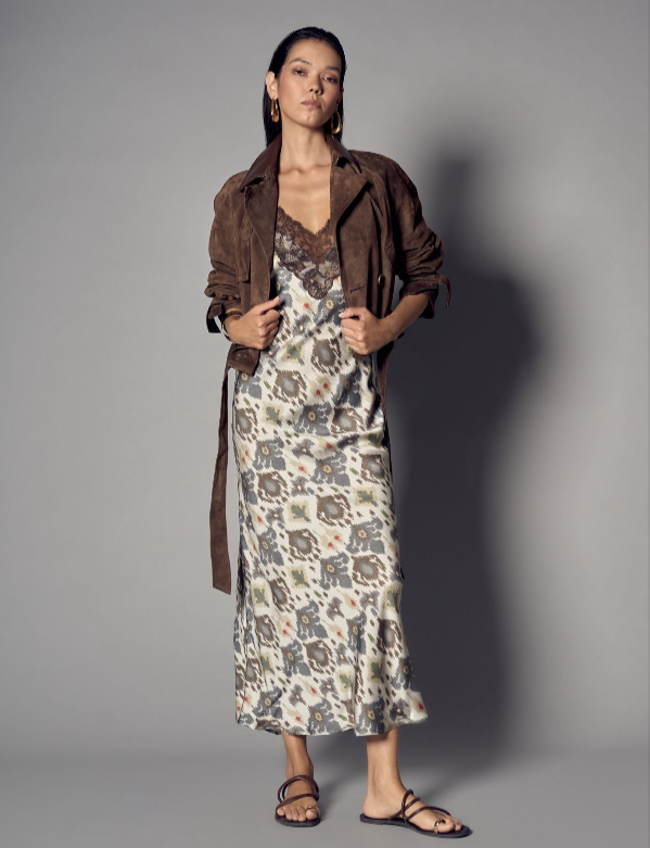 Abito lungo lingerie in viscosa stretch stampa etnica pizzo marrone.