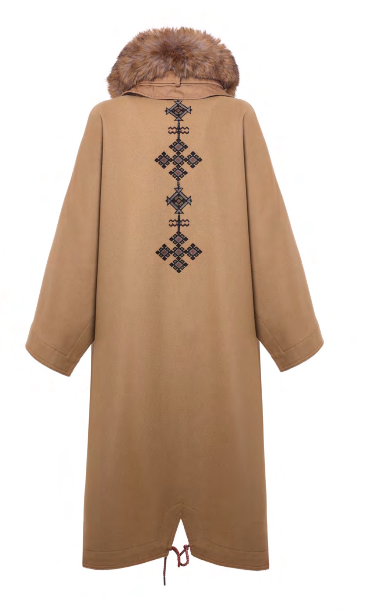 Cappotto lungo a mantella in lana color cammello con dettagli in cotone , ricamo dietro e collo in ecopelliccia.