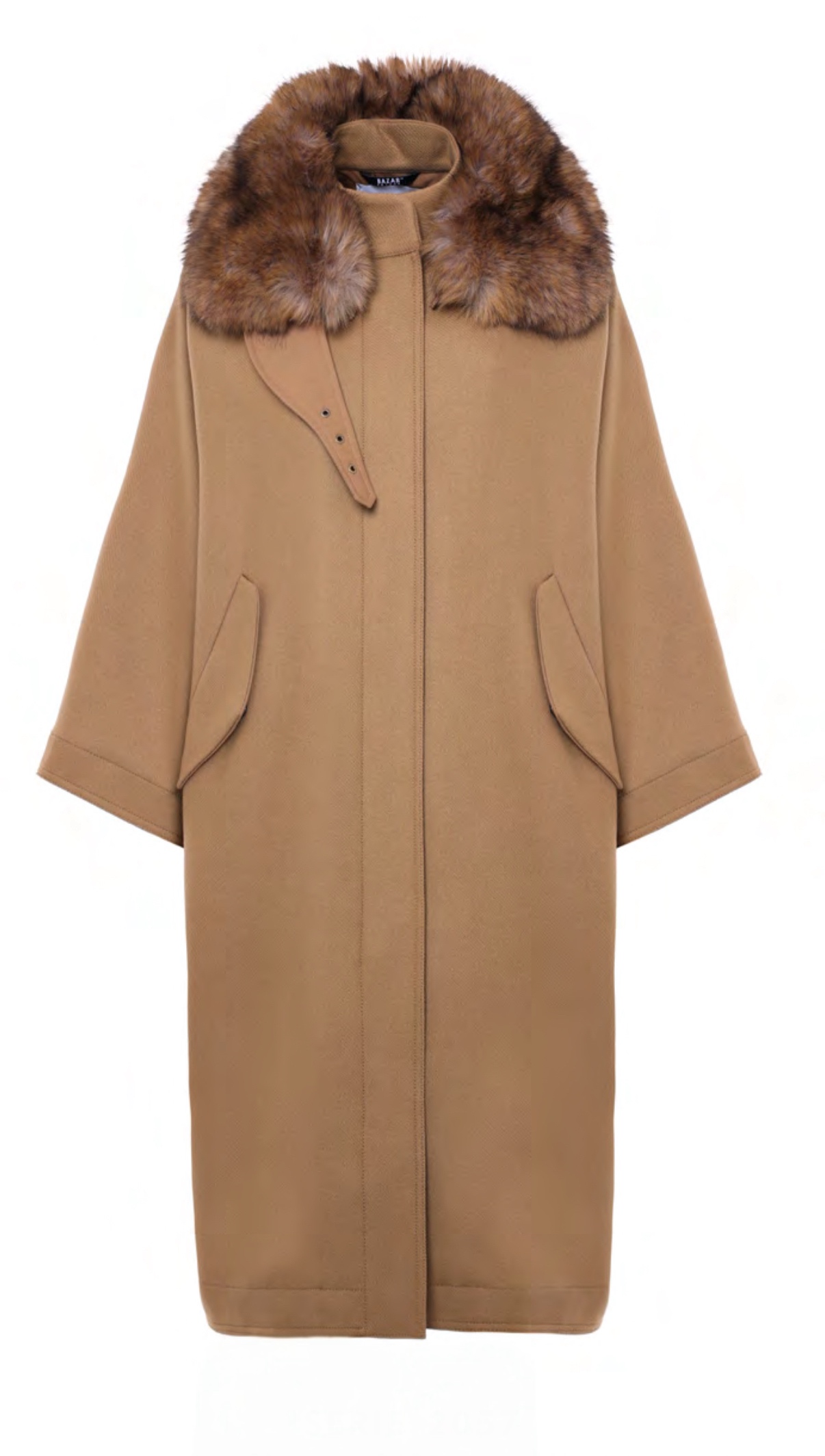 cappotto mantella lungo in lana cammello, con collo in eco-pelliccia.