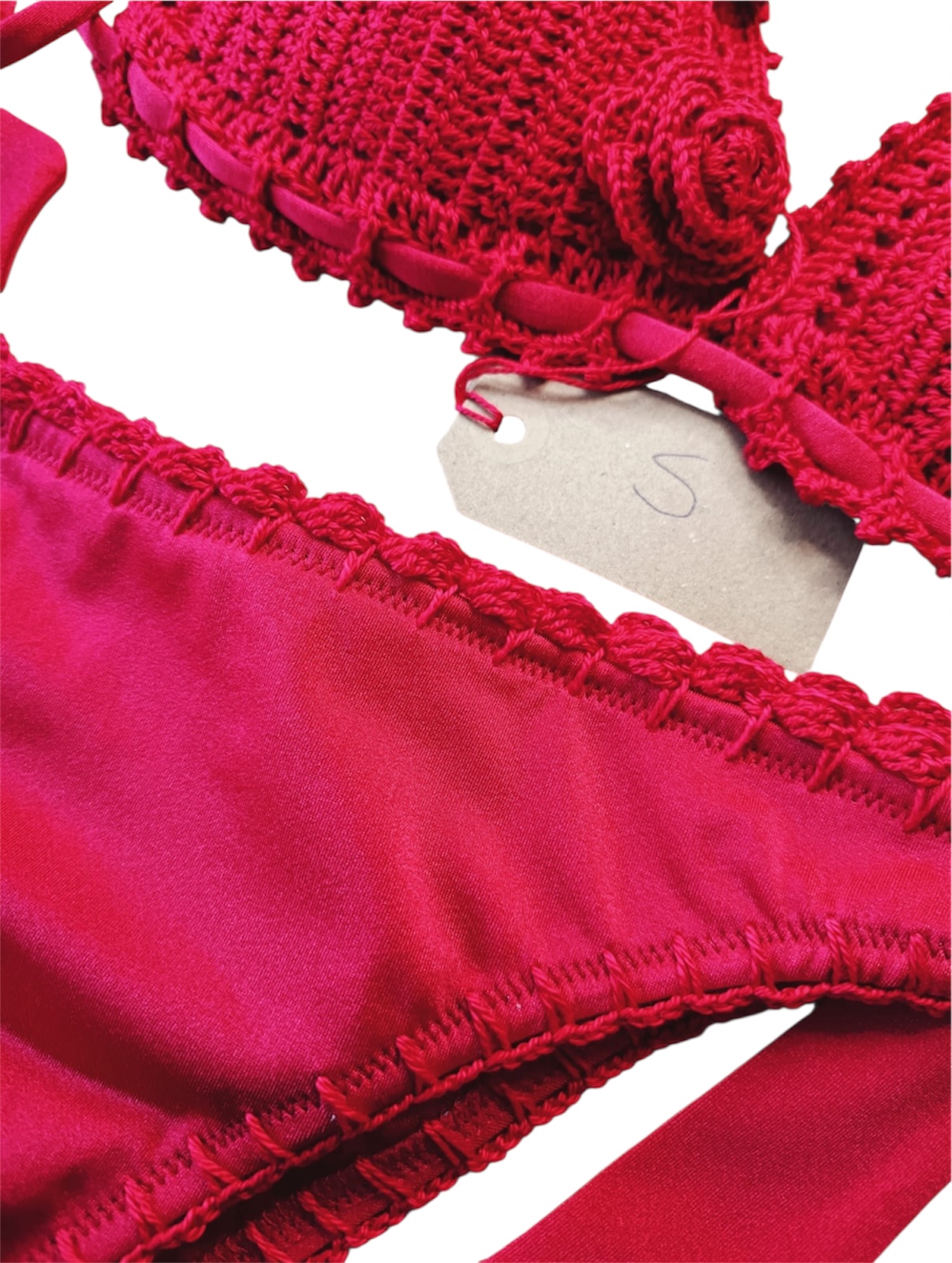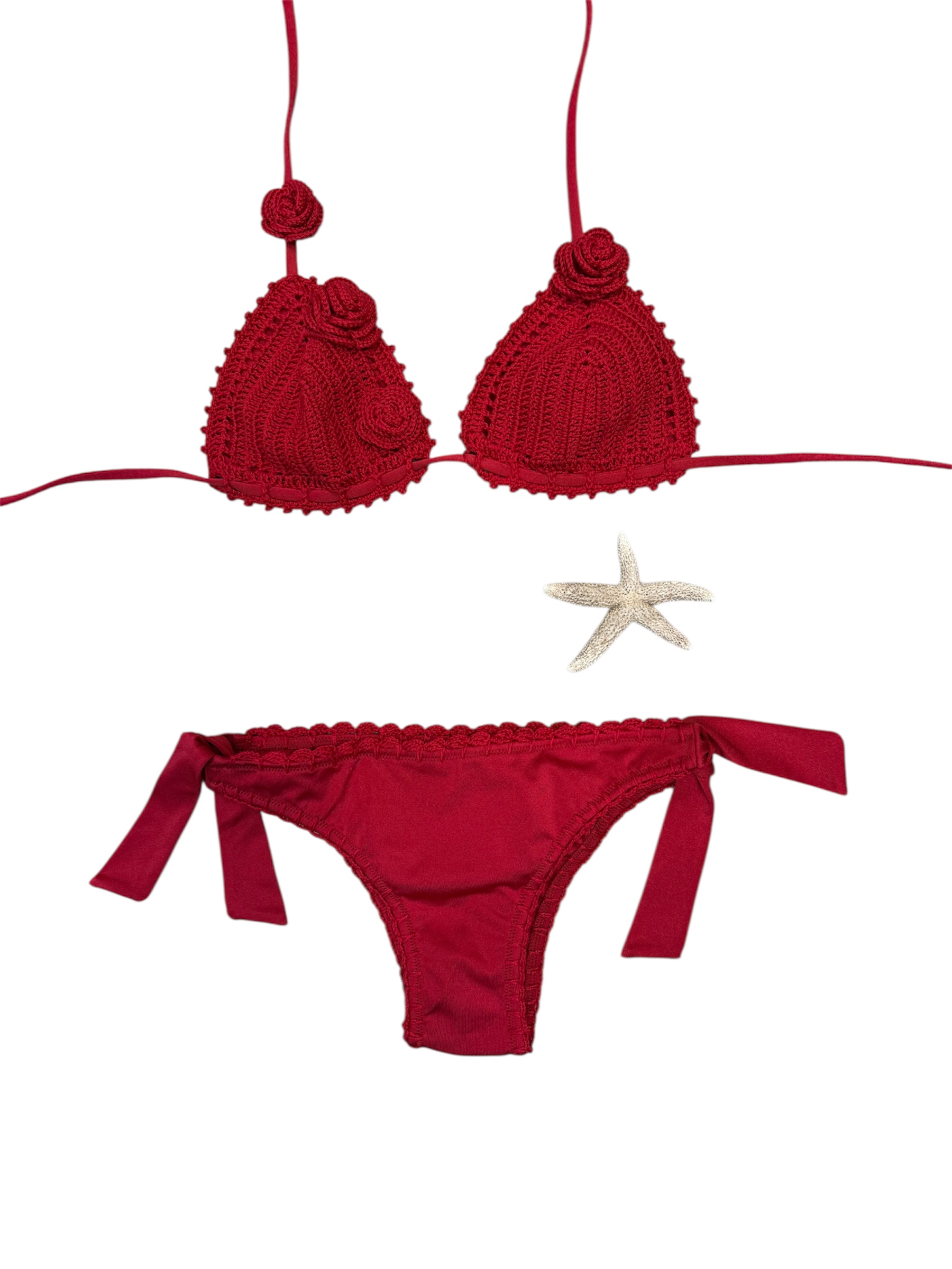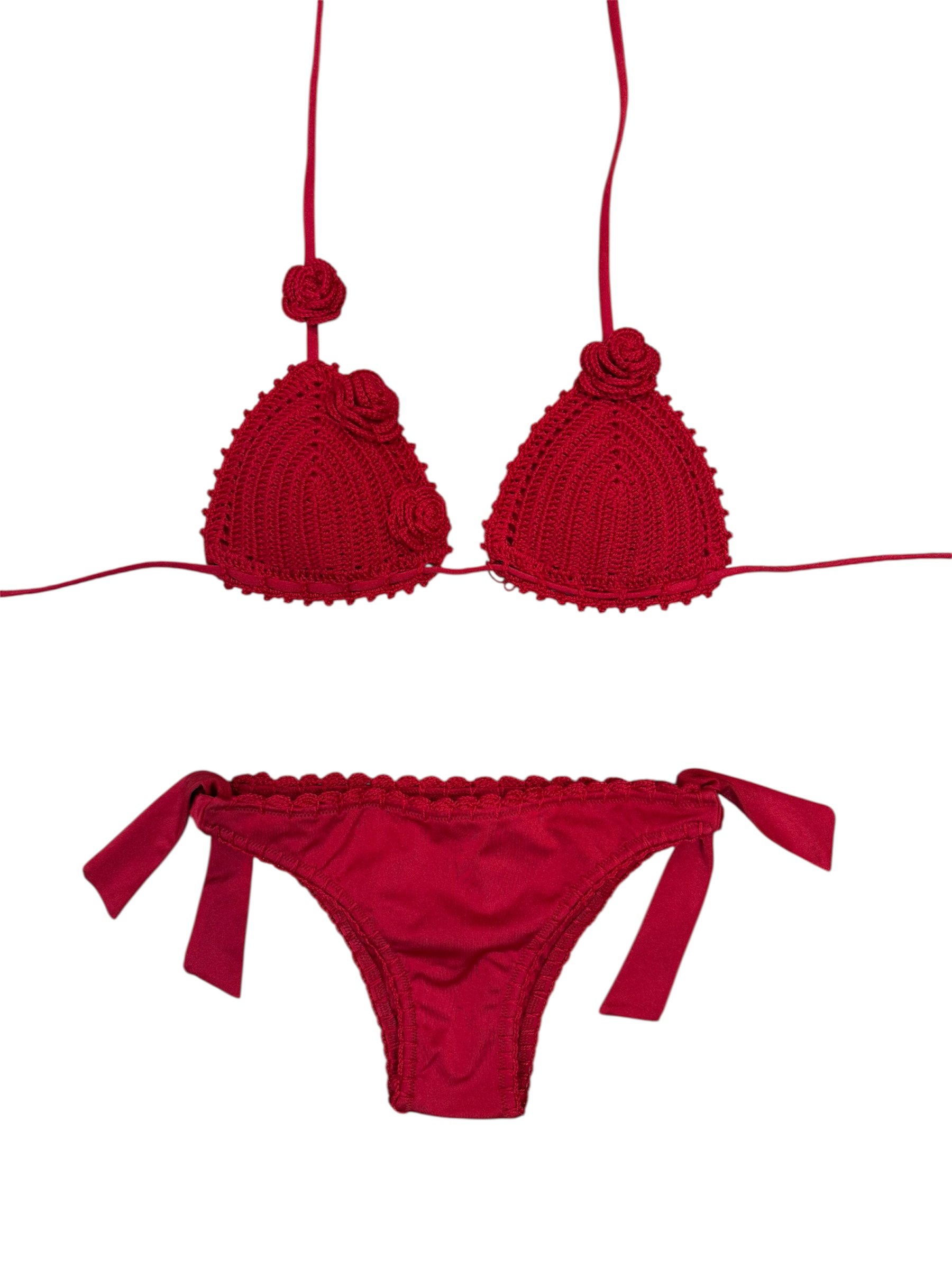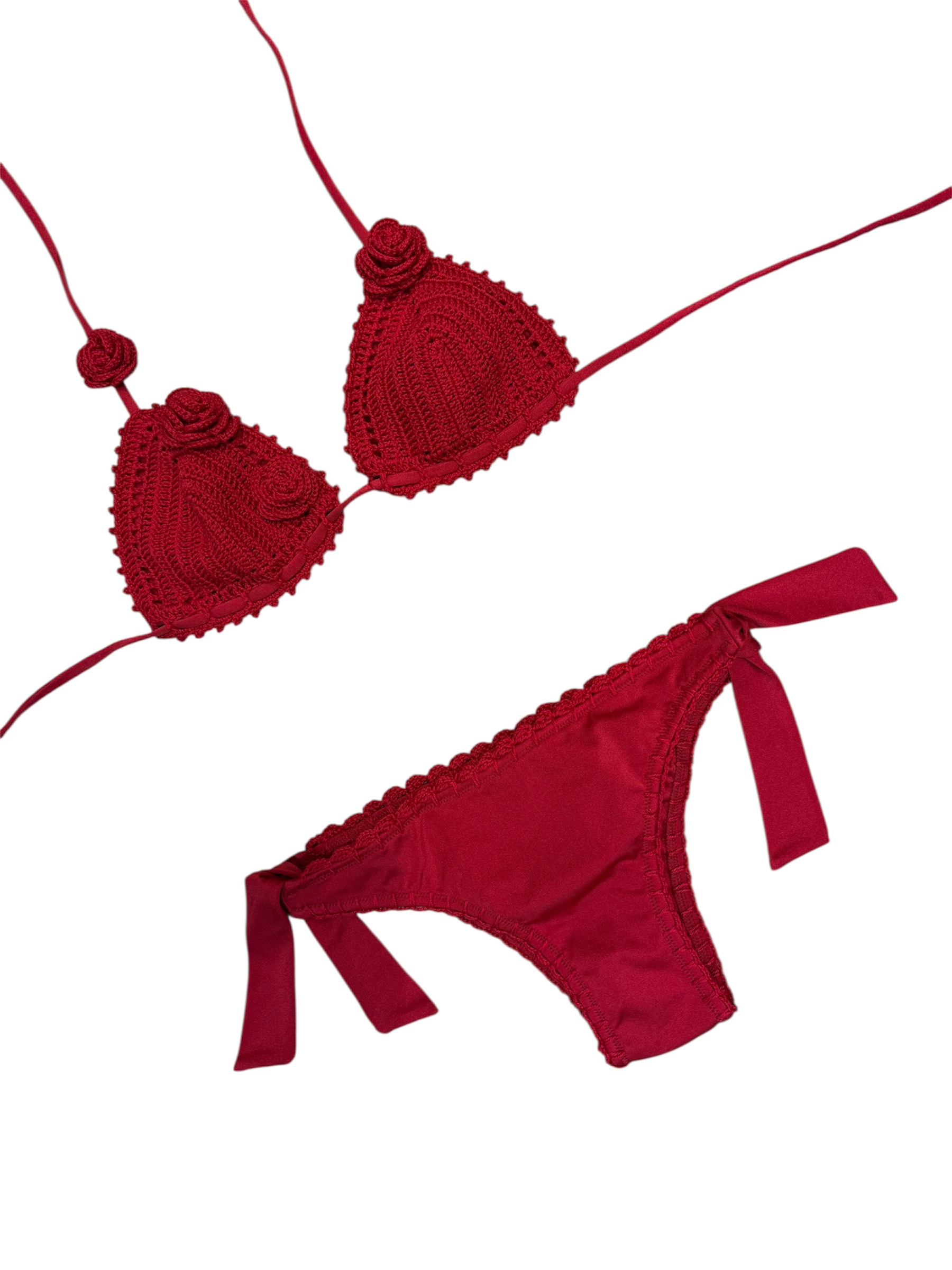 Bikini rosso crochet con rose.