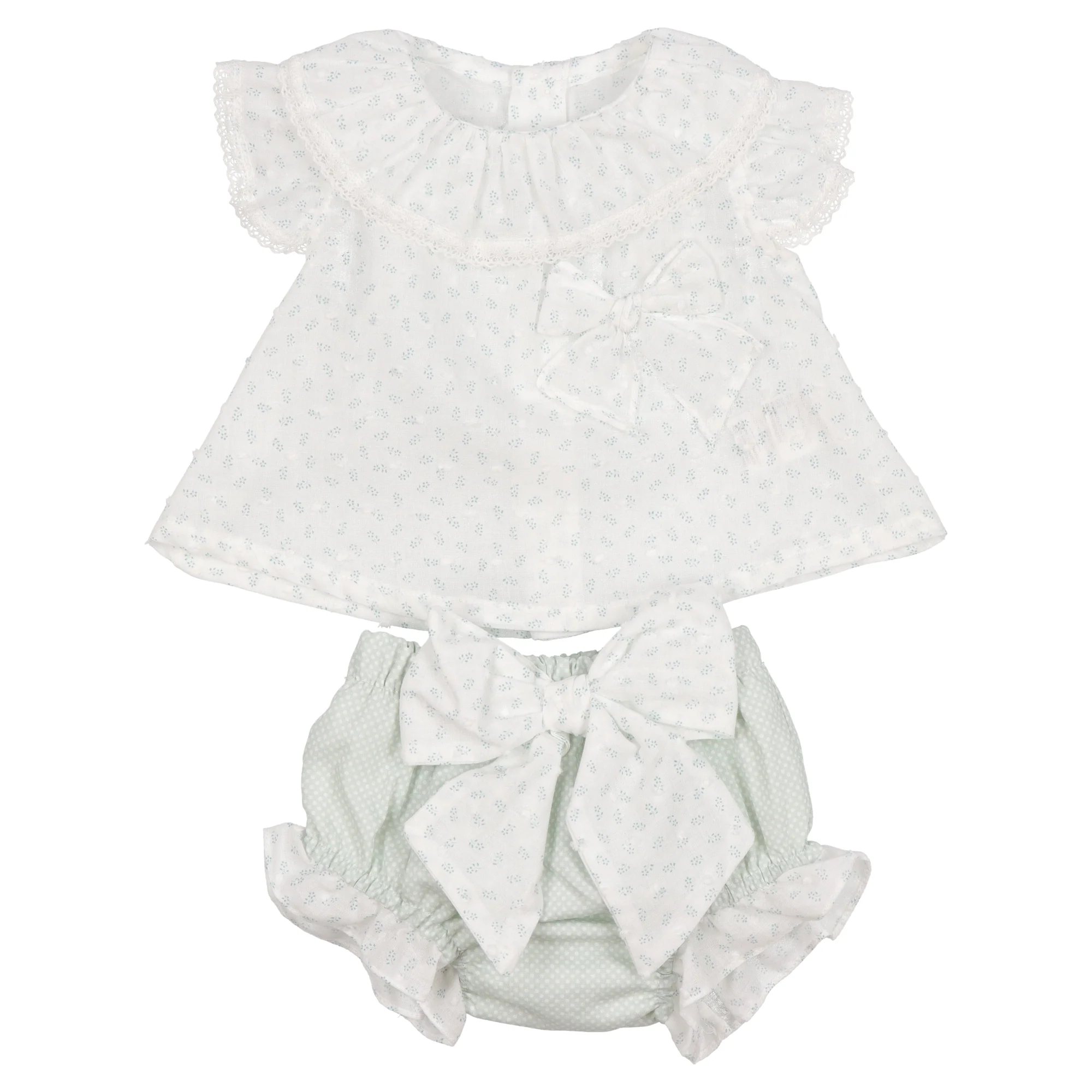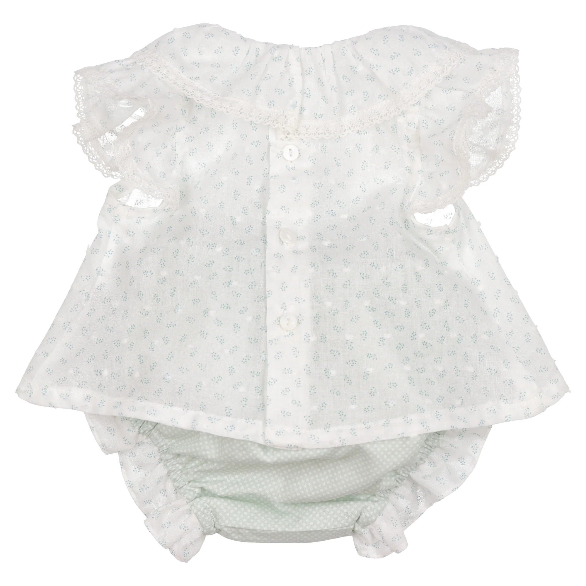 Morbida e leggera blusa in plumetis stampa fiori, girocollo e spalle decorato con rouches, chiusura dietro con bottoni ed asole. Coulotte in cotone stampa micro pois foderata, decorata con fiocco e rouches sulle cosce. Morbido elastico in vita e sulle cosce.