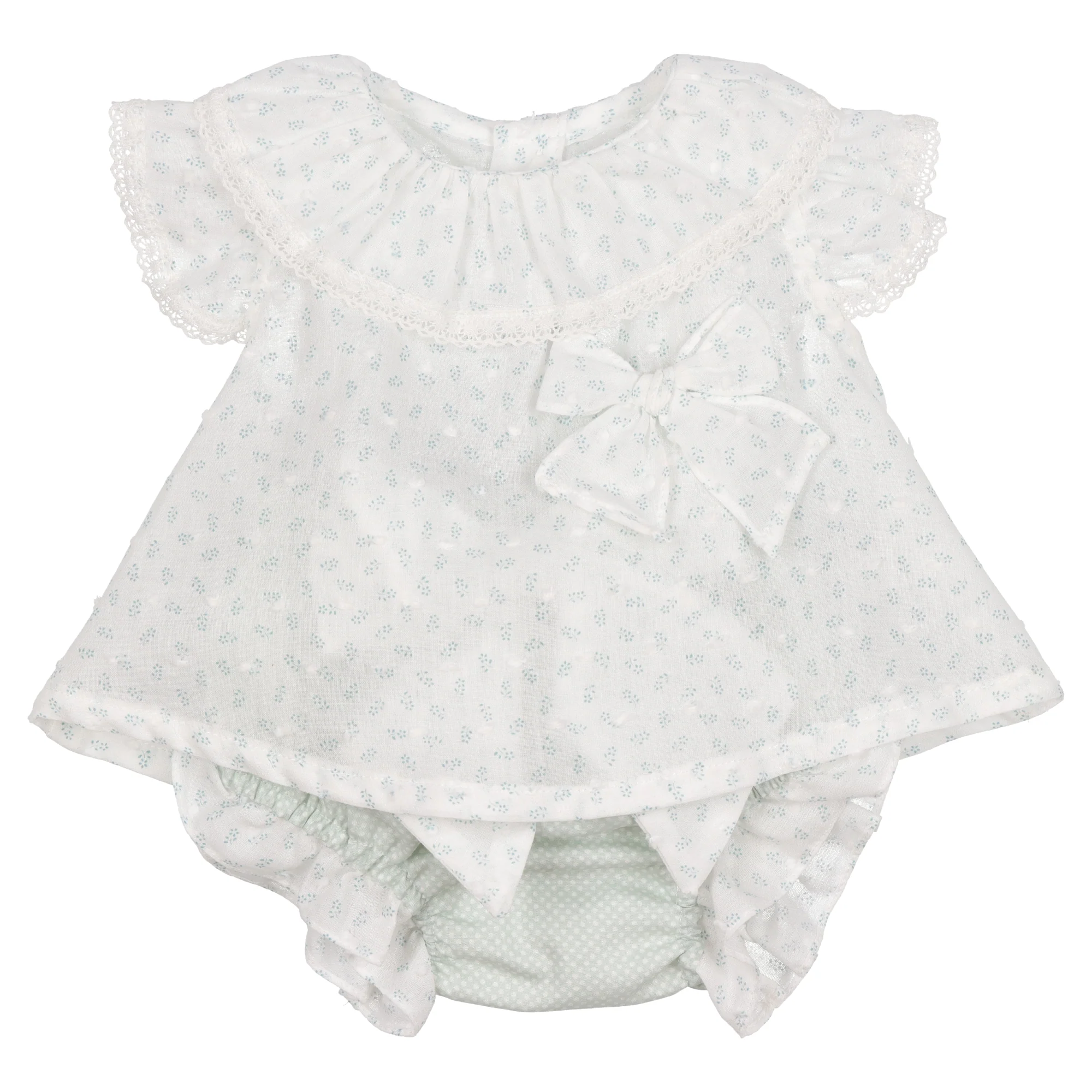 DESCRIZIONEMorbida e leggera blusa in plumetis stampa fiori, girocollo e spalle decorato con rouches, chiusura dietro con bottoni ed asole. Coulotte in cotone stampa micro pois foderata, decorata con fiocco e rouches sulle cosce. Morbido elastico in vita e sulle cosce. Composizione: 100% cotone.Cura: lavaggio a mano o in lavatrice, non candeggiare, si puรฒ stirare, […]