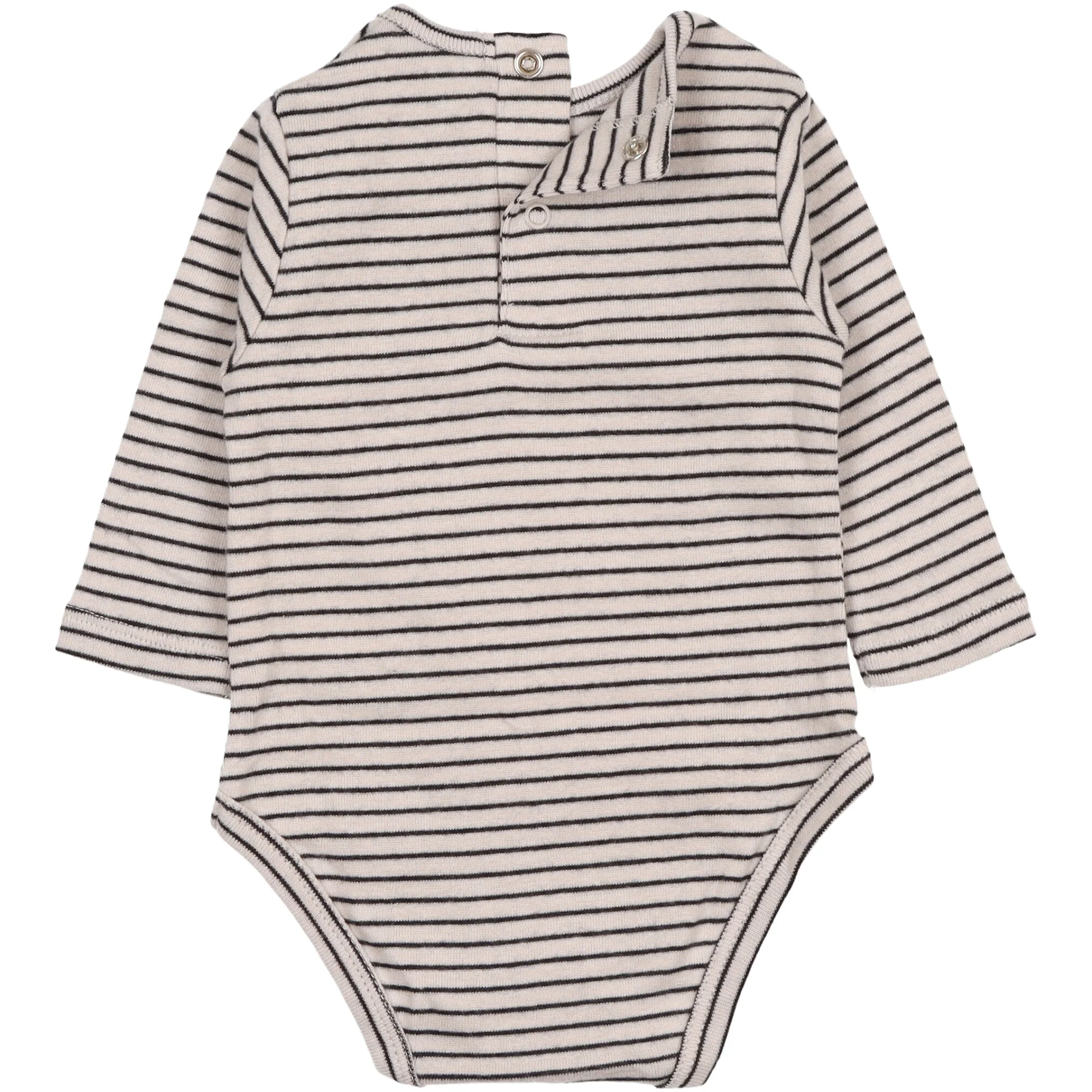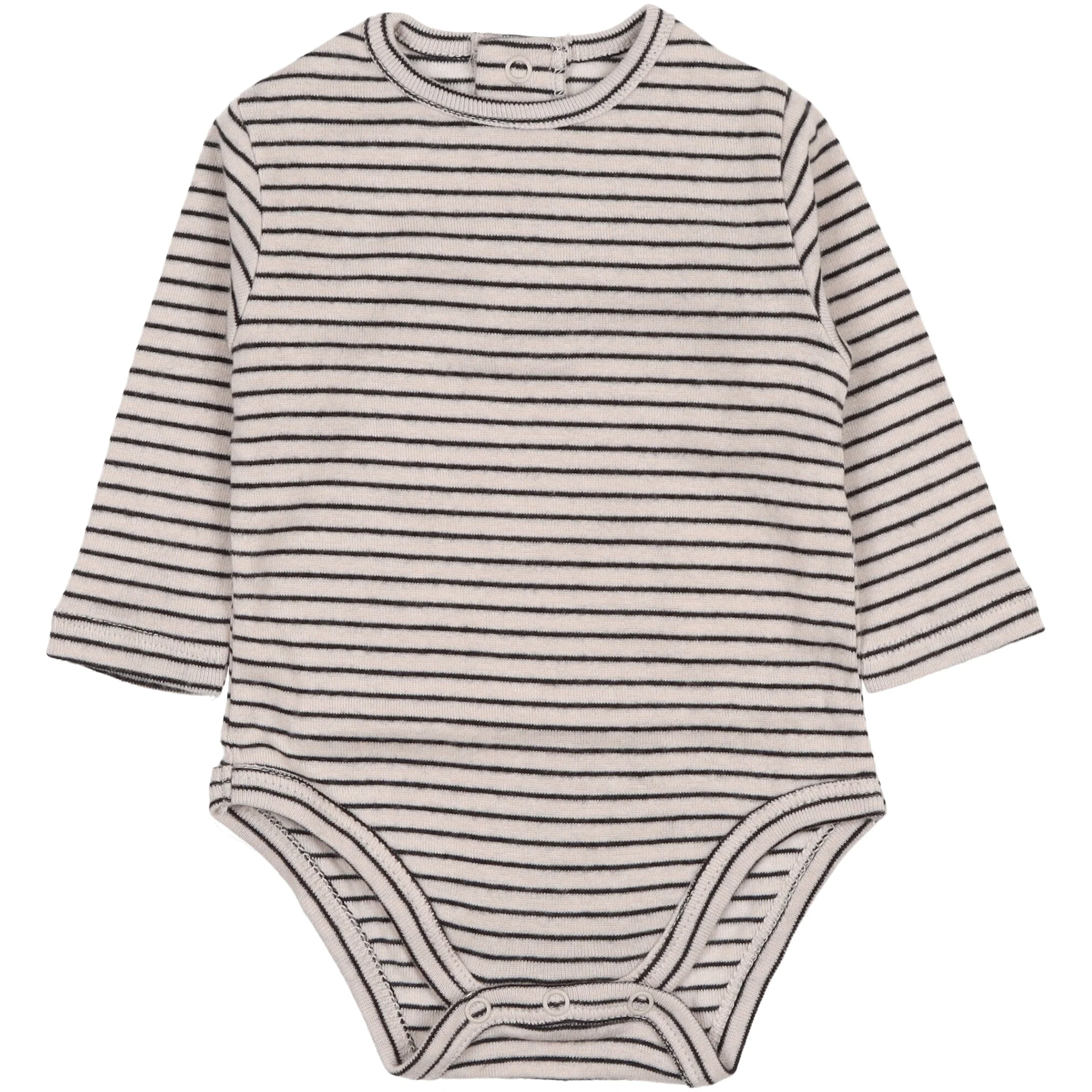 Realizzato in maglina di cotone fantasia a righe, manica lunga, collo rotondo, un’apertura dietro e sul cavallo con bottoni a pressione in metallo senza nichel.