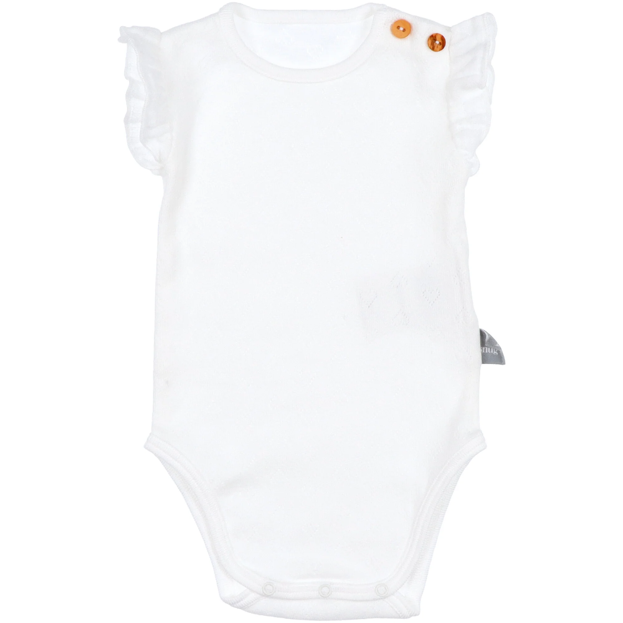 DETTAGLIO Body in cotone organico con motivo a cuore traforato. Chiusura davanti con bottoni in legno e con bottoni a pressione tra le gambe. Volant sulle maniche e tasca.Composizione: 100% cotone.Cura: si consiglia lavaggio a mano, non candeggiare, no asciugatrice, stirare a bassa temperatura 110ยฐC, si puรฒ lavare a secco.