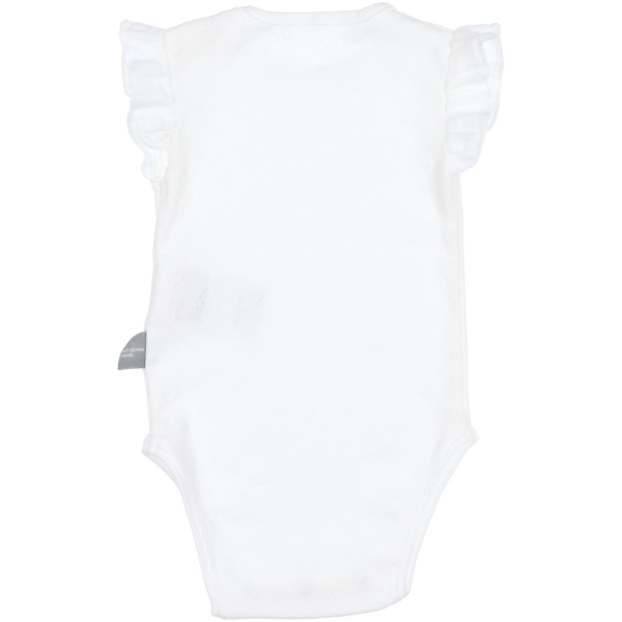 Body in cotone organico con motivo a cuore traforato. Chiusura davanti con bottoni in legno e con bottoni a pressione tra le gambe. Volant sulle maniche e tasca.