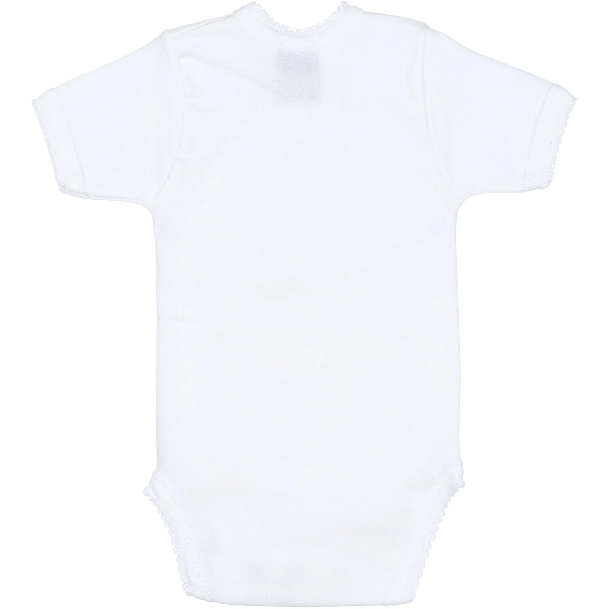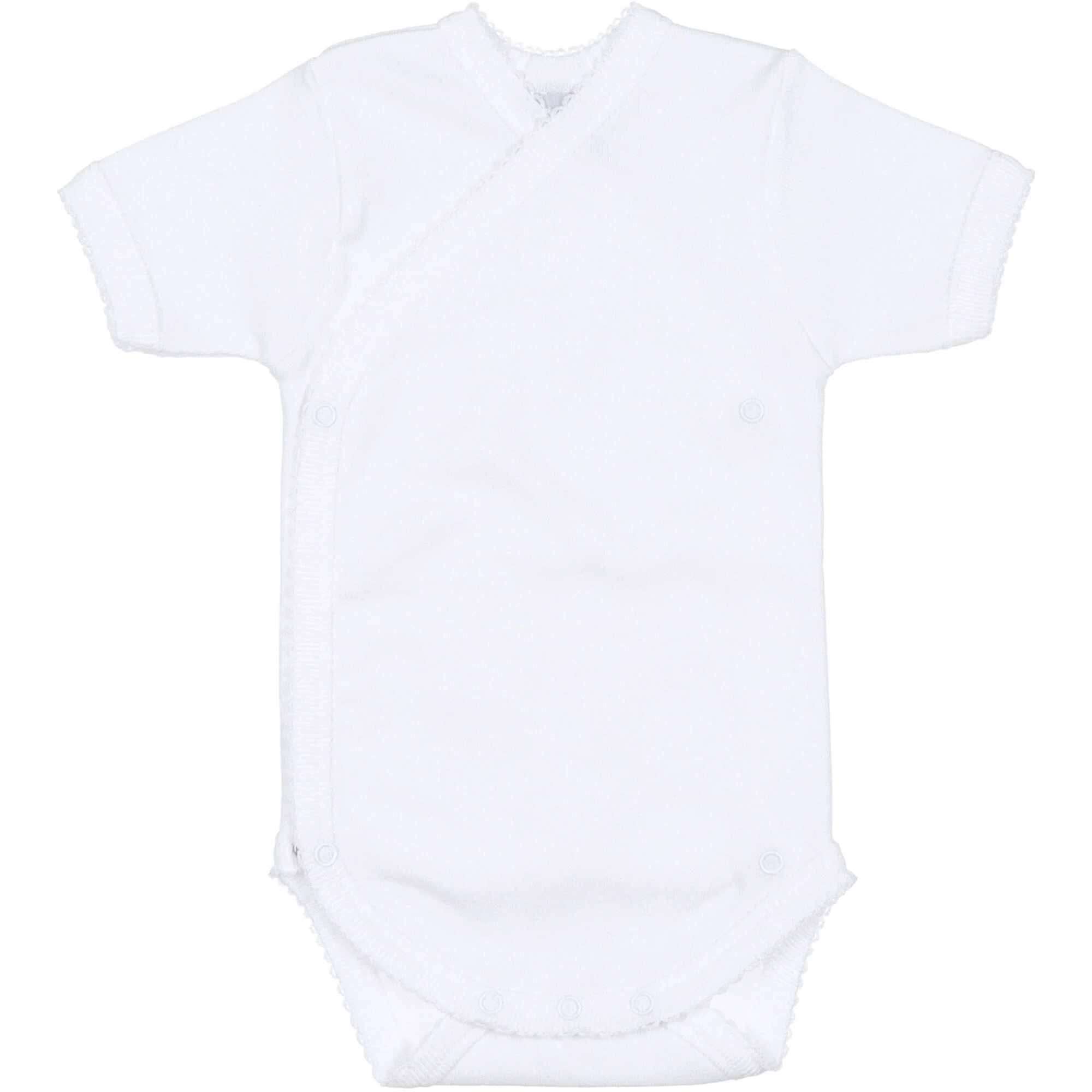 Body realizzato in morbido jersey di cotone colore bianco. Modello mezza manica, chiusura a incrocio con bottoni a pressione sul fianco e sul cavallo, l’apertura laterale permette di infilare il body al neonato in modo delicato senza passare dalla testa. Vestibilitร  attillata, come una seconda pelle. Perfetto per tutte le stagioni.