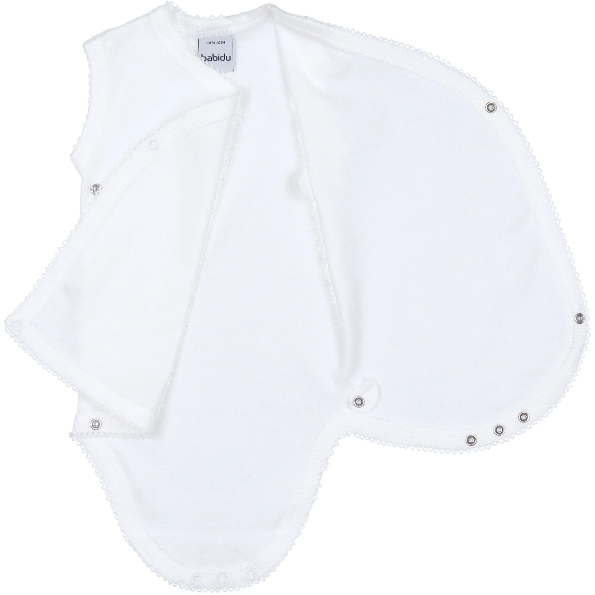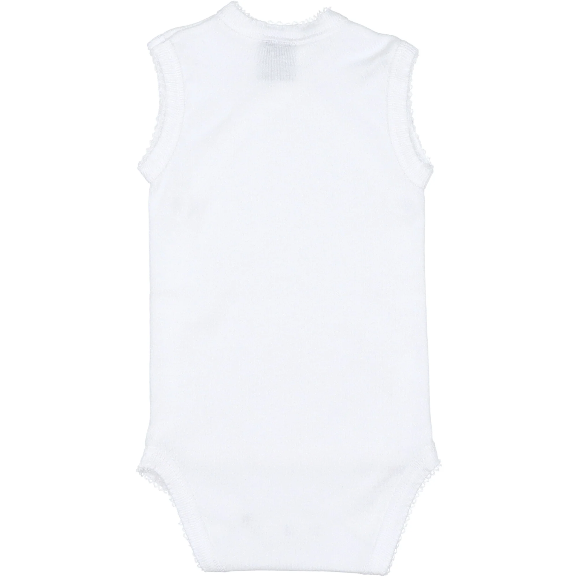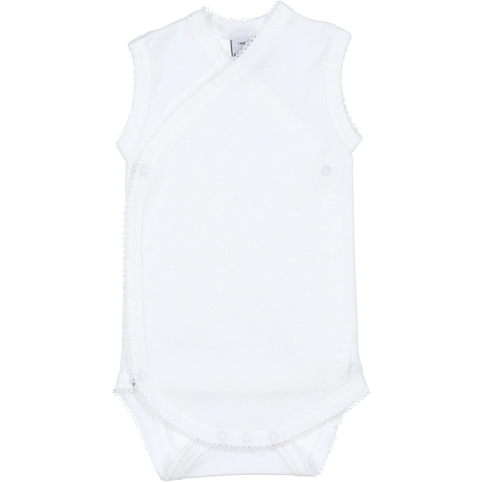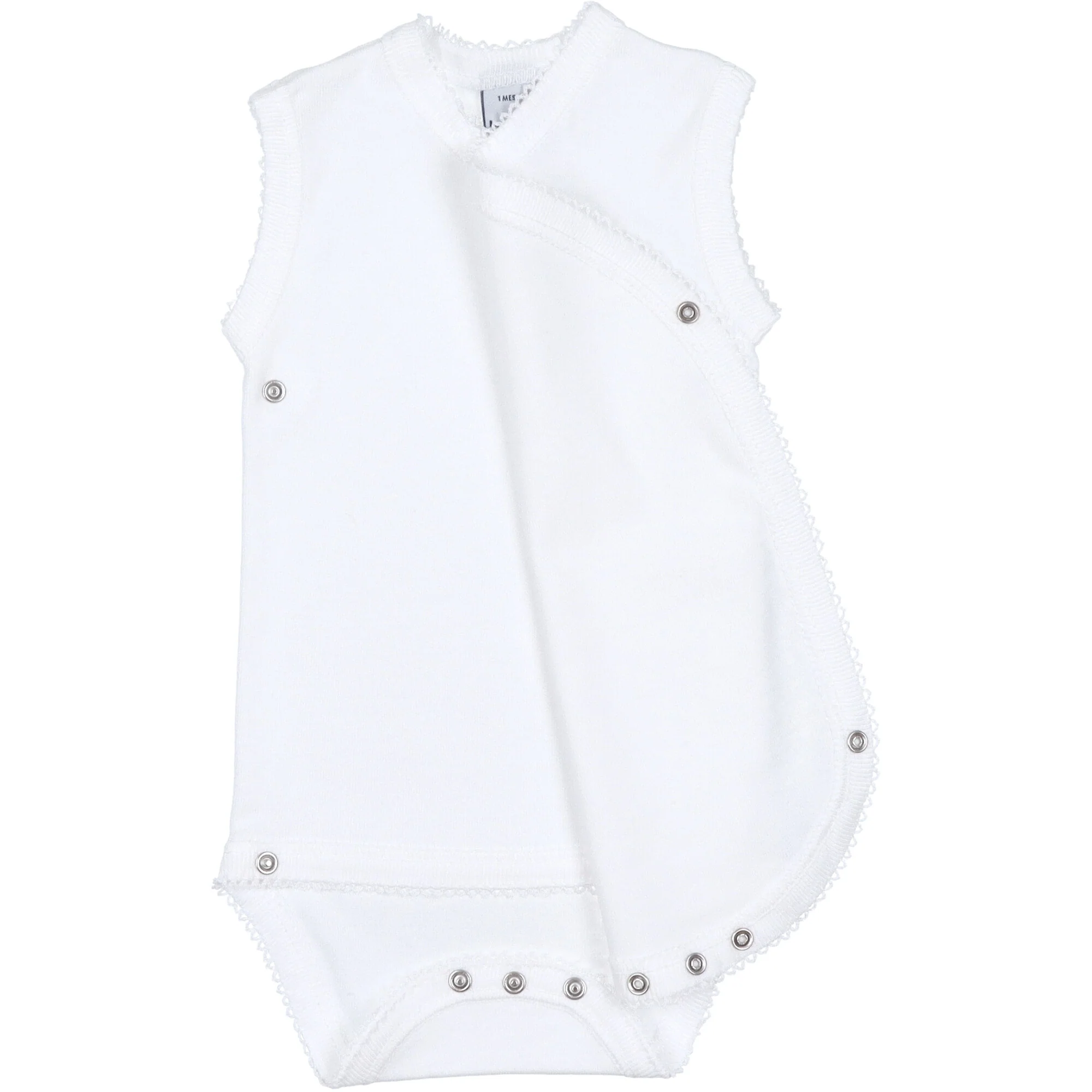 Body realizzato in morbido jersey di cotone colore bianco. Senza maniche, chiusura a incrocio con bottoni a pressione sul fianco e sul cavallo, l’apertura laterale permette di infilare il body al neonato in modo delicato senza passare dalla testa. Vestibilitร  attillata, come una seconda pelle. Perfetto per tutte le stagioni.