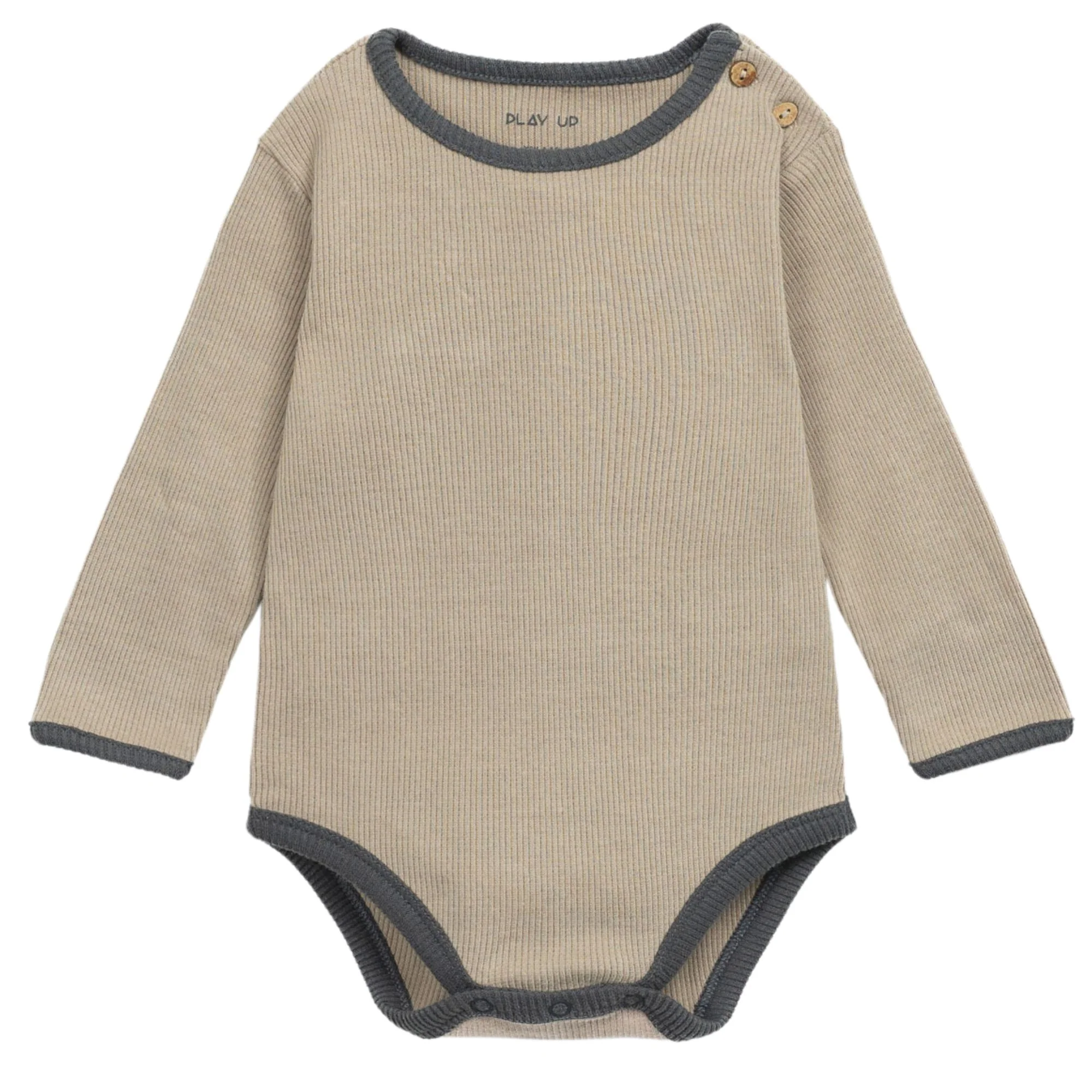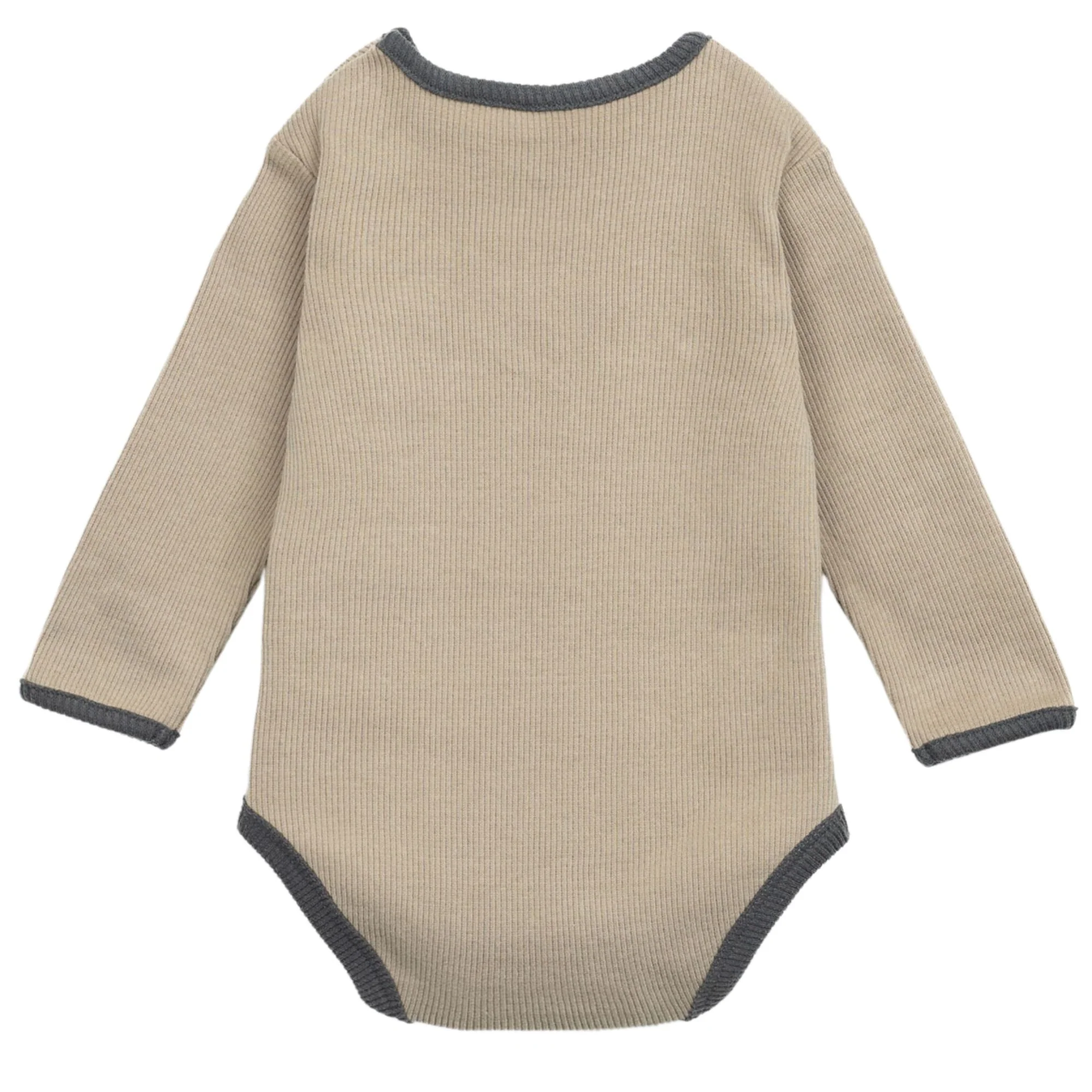 Body realizzato in maglina misto cotone biologico e cotone. ร un modello a manica lunga con colletto, apertura sulla schiena e al cavallo con molle in metallo senza nichel e motivo a righe.