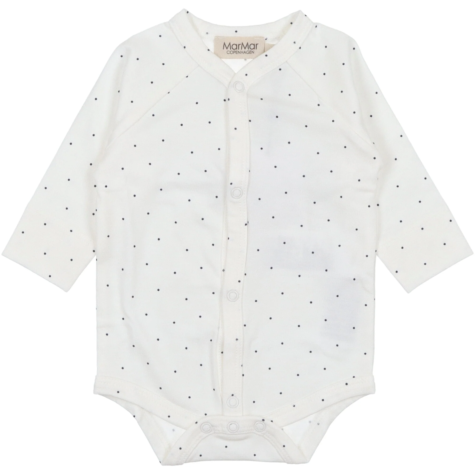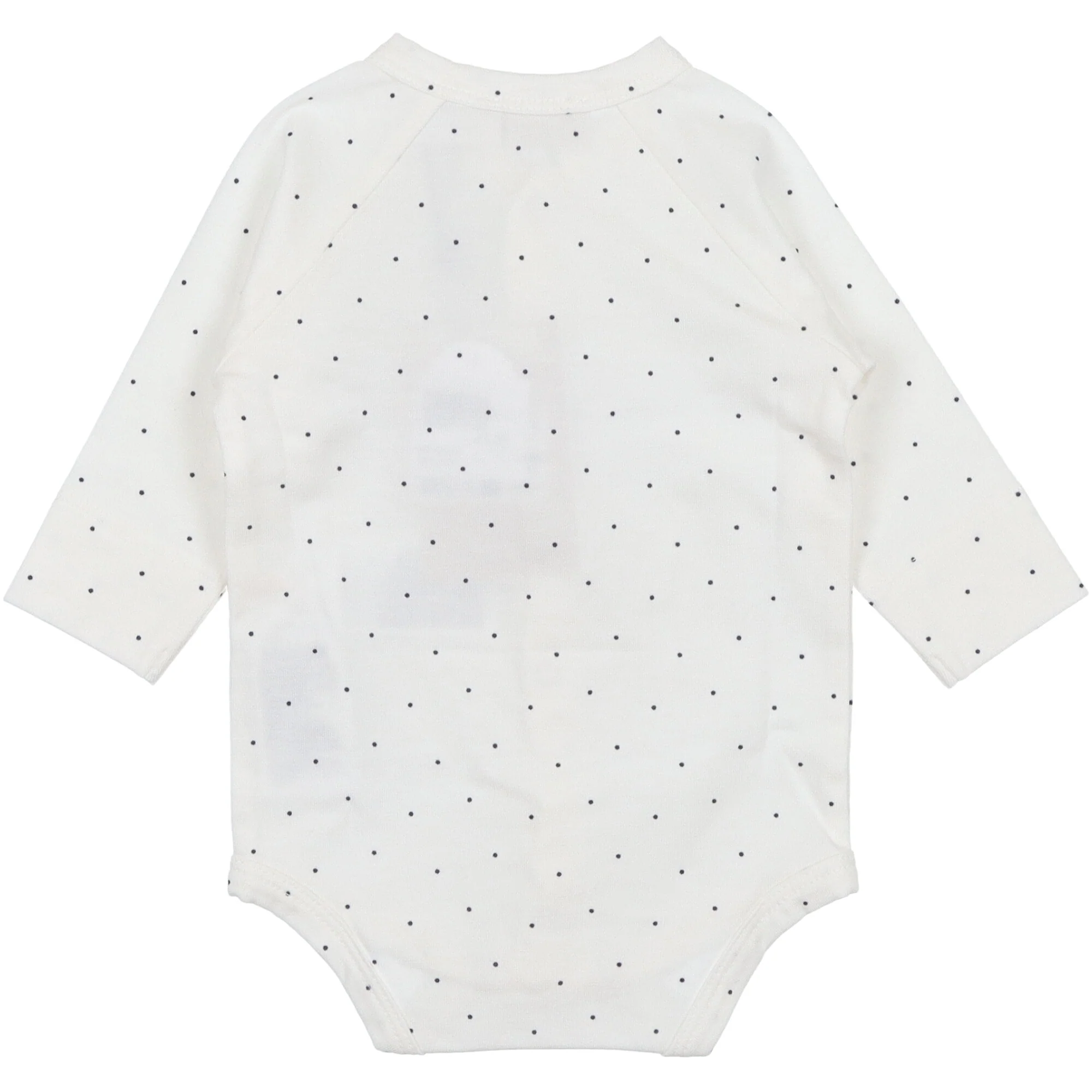 Body a maniche lunghe si chiude con bottoni automatici sul davanti e tra le gambe per facilitare il cambio del pannolino. Il body รจ morbido, elastico e comodo da indossare. Colore bianco con piccoli pois colore nero Certificato Standard 100 da OEKO-TEXยฎ . Contiene cotone biologico e TENCELโข Modal