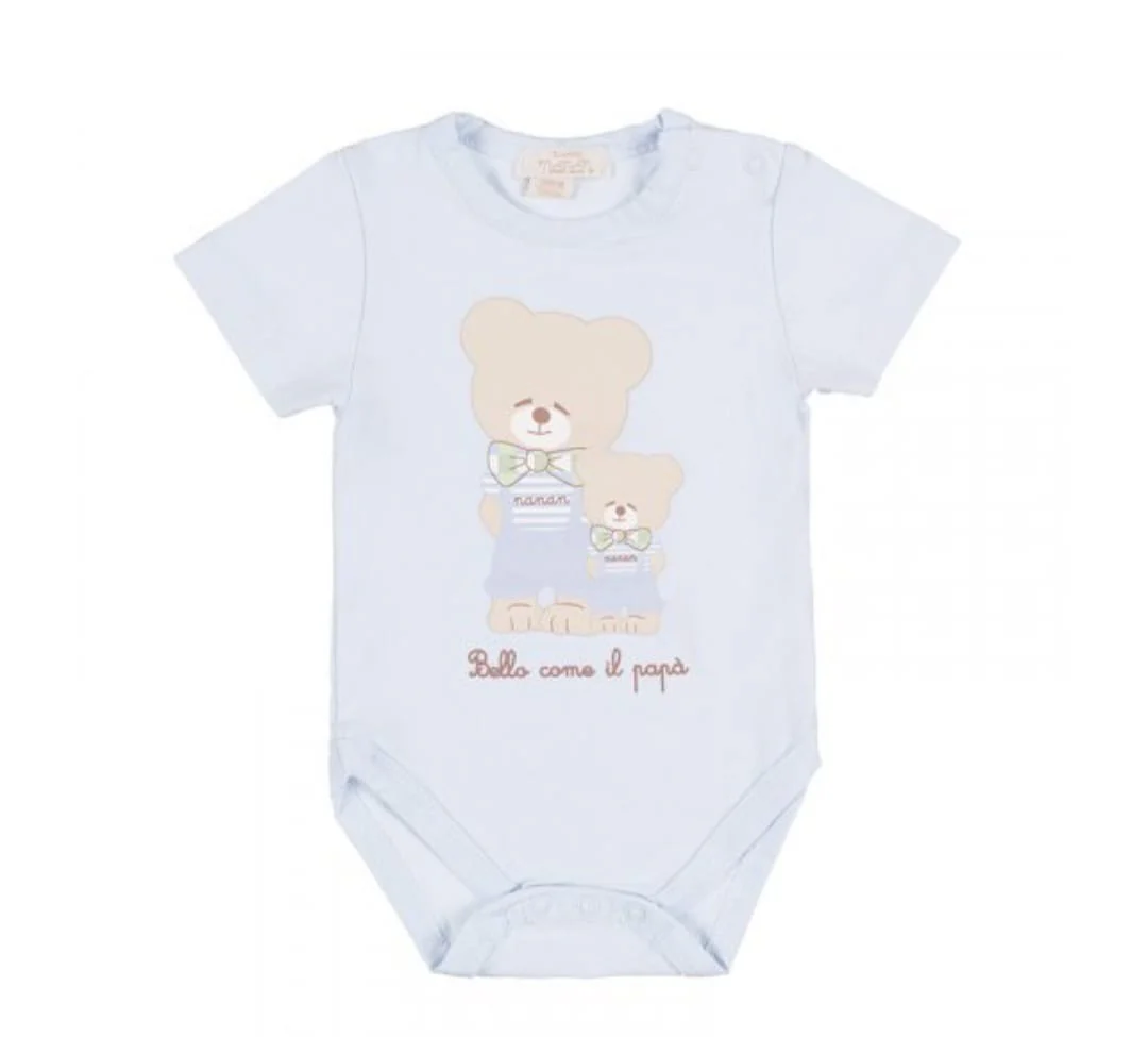 Graziosi body azzurri impreziositi da dolci orsetti e dediche. Abbottonatura inferiore. 100% Cotone