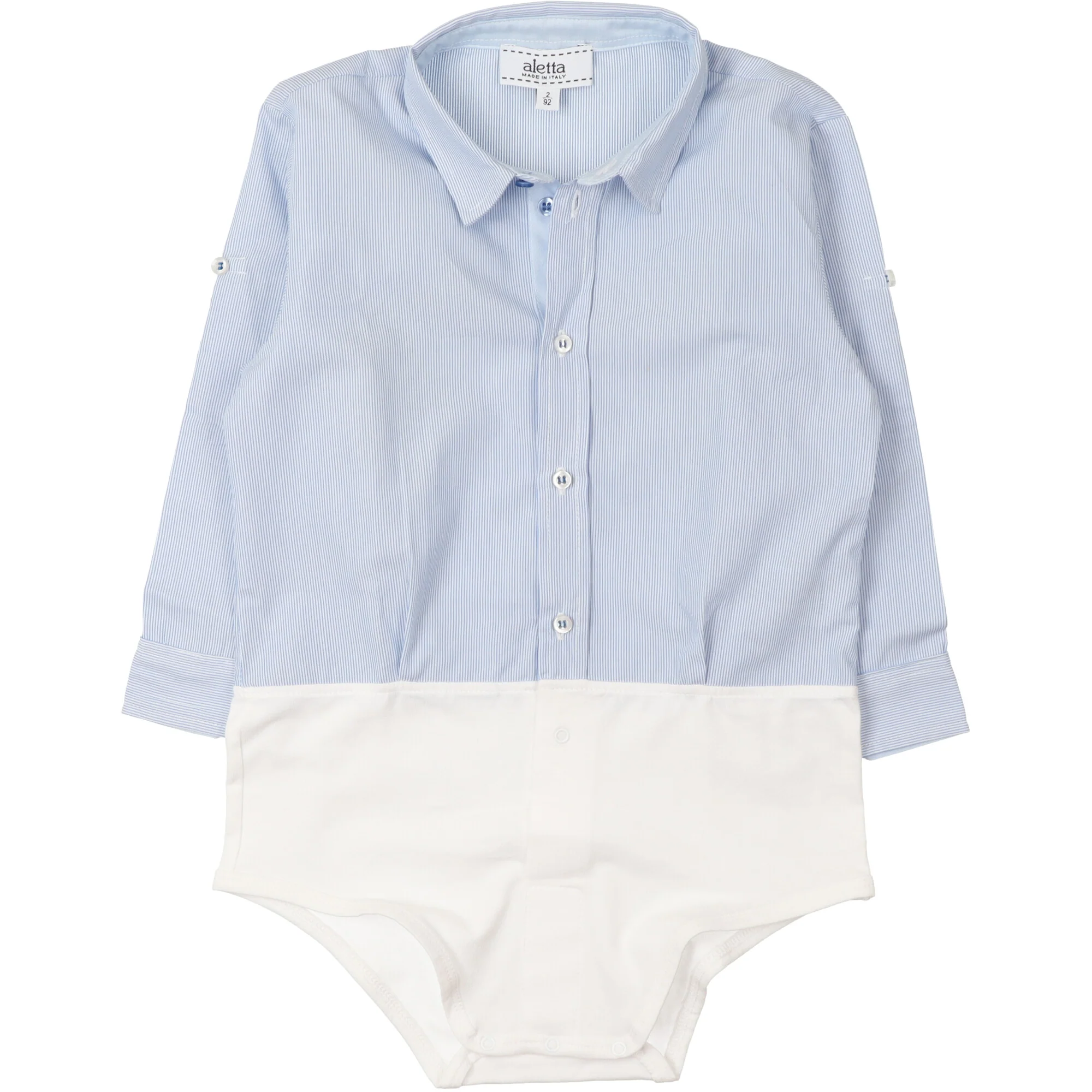 Body camicia in cotone fantasia riga azzurra, maniche lunghe, apertura davanti con bottoni in madreperla, apertura con bottoni a pressione tra le gambe. Made in Italy.