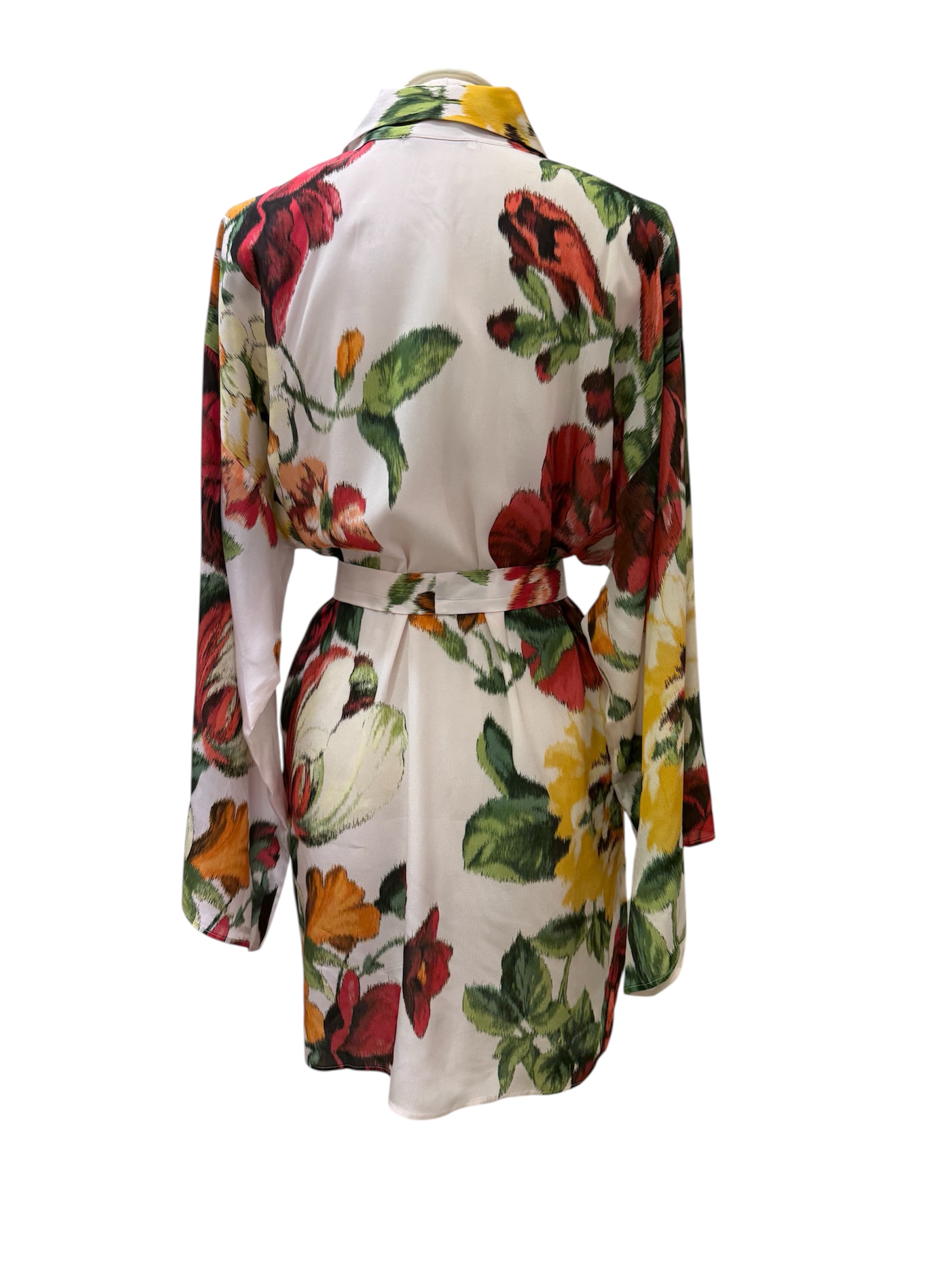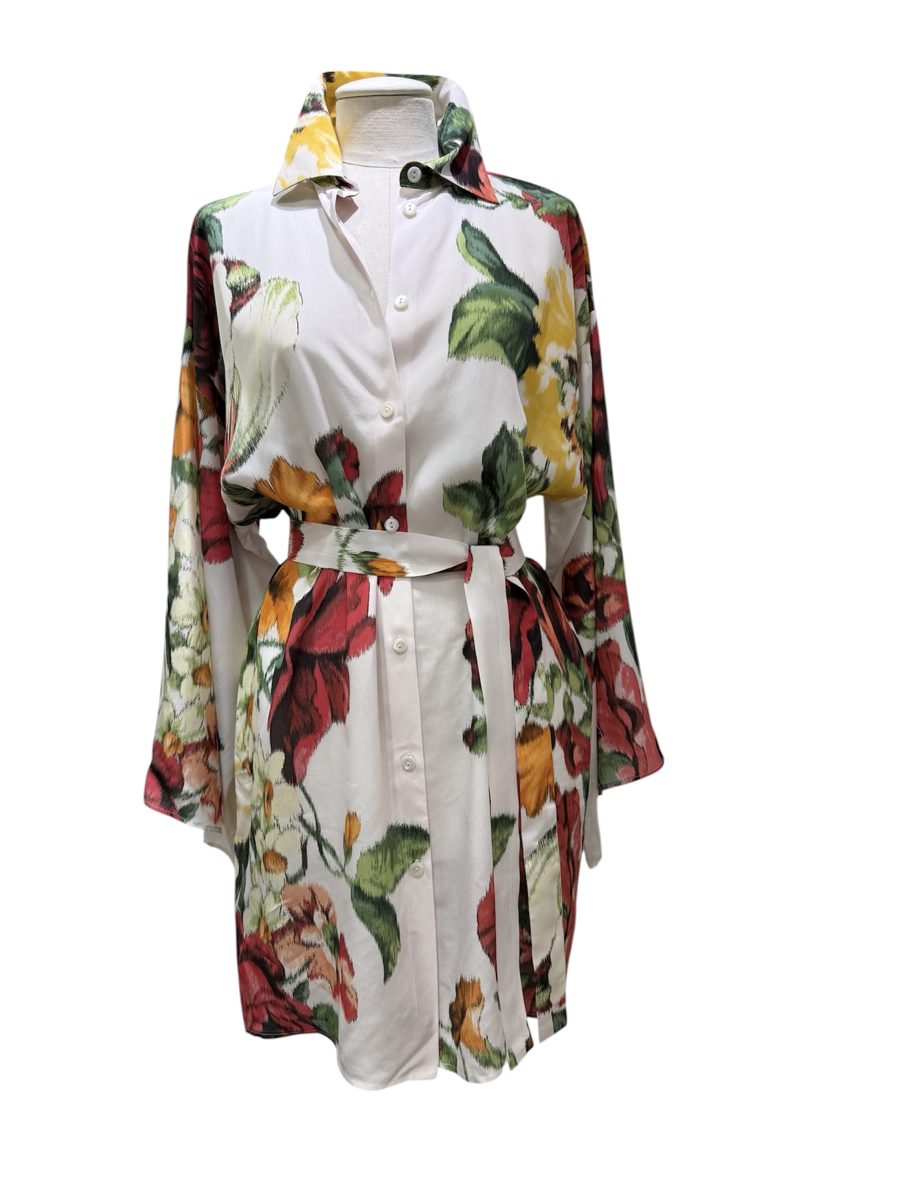 Camicia con manica ampia e cintura, abbottonatura frontale stampa floreale su fondo panna.