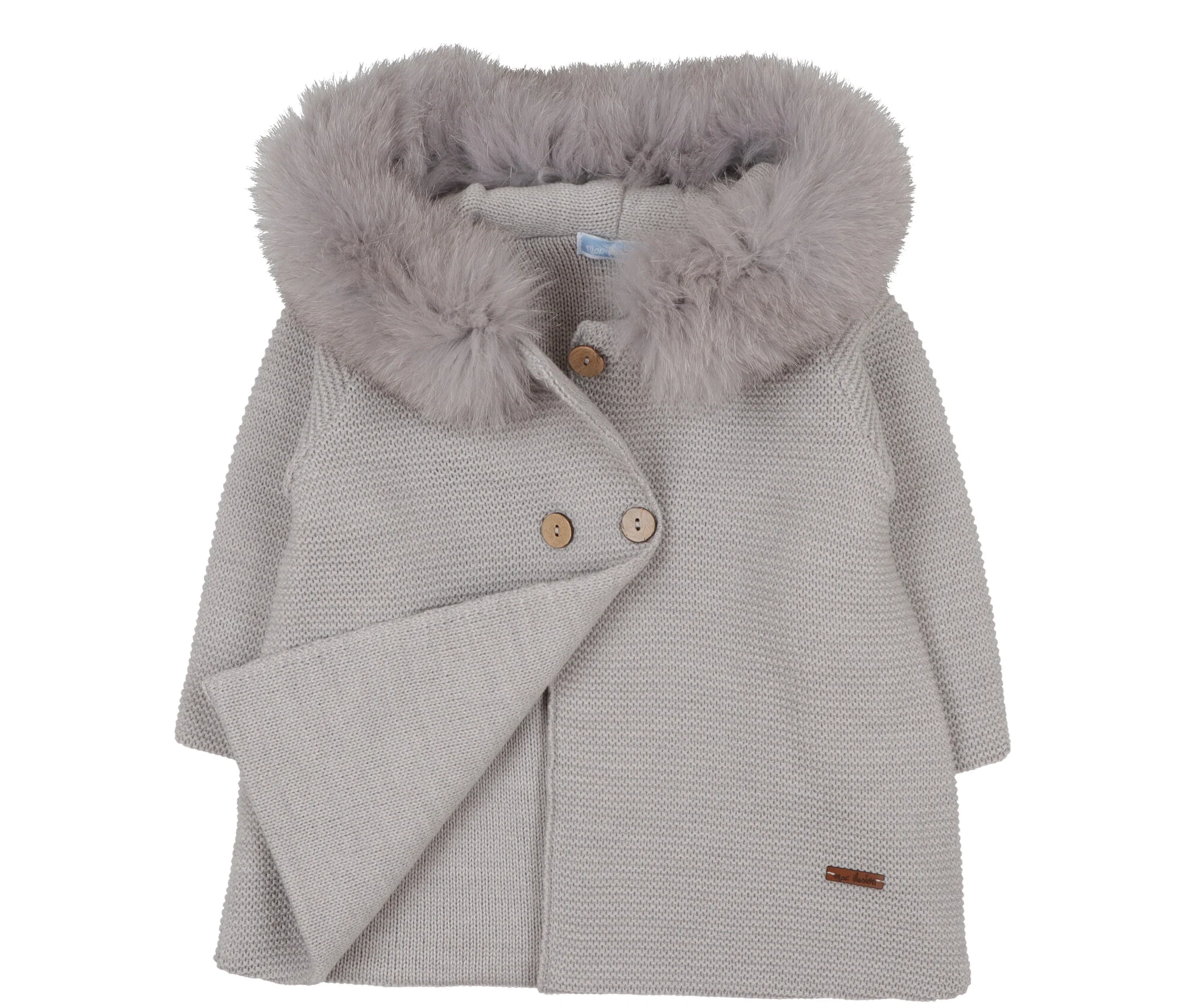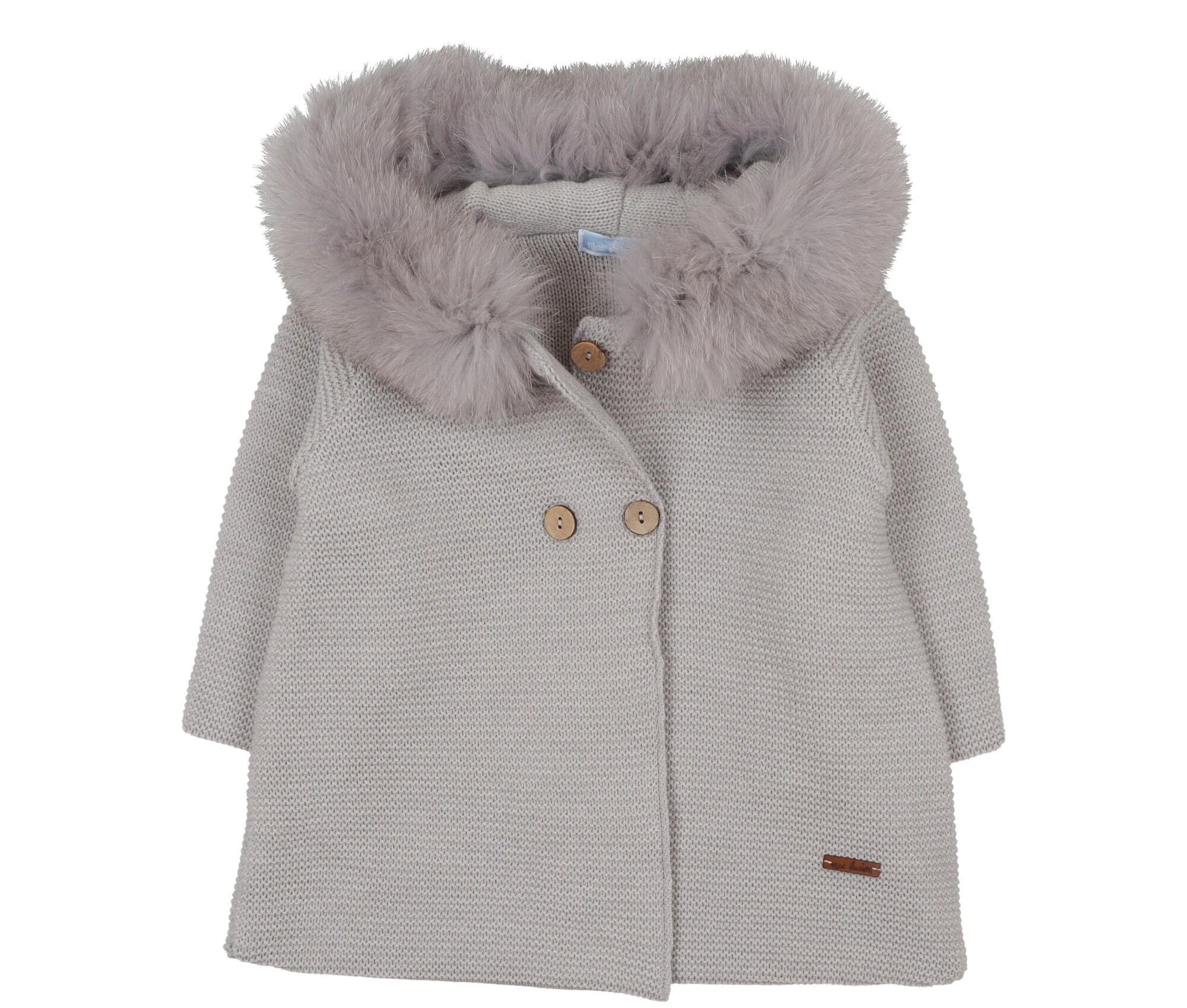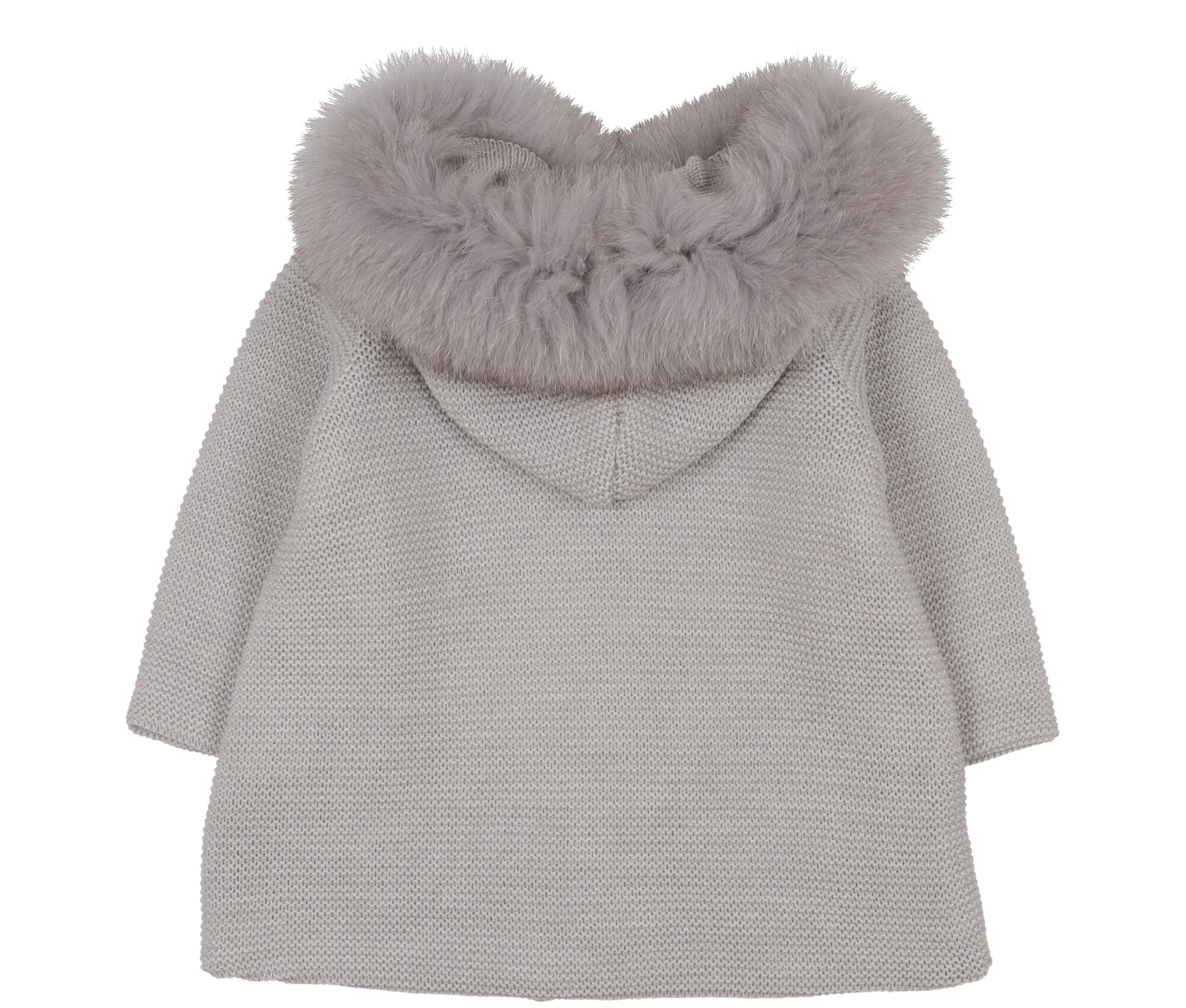 Descrizione: lavarato a maglia colore grigio perla, grande cappuccio con largo bordo in pelliccia rimovibile con bottoni a pressione, chiusura doppio petto con bottoni ad asola.