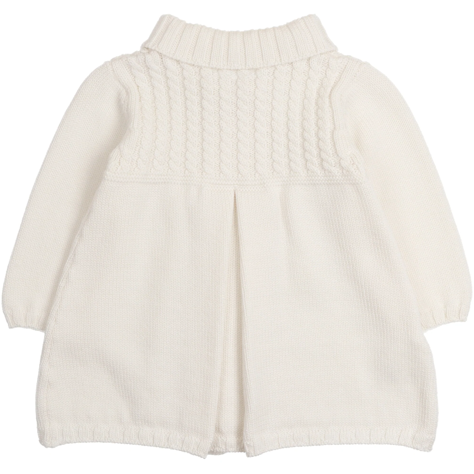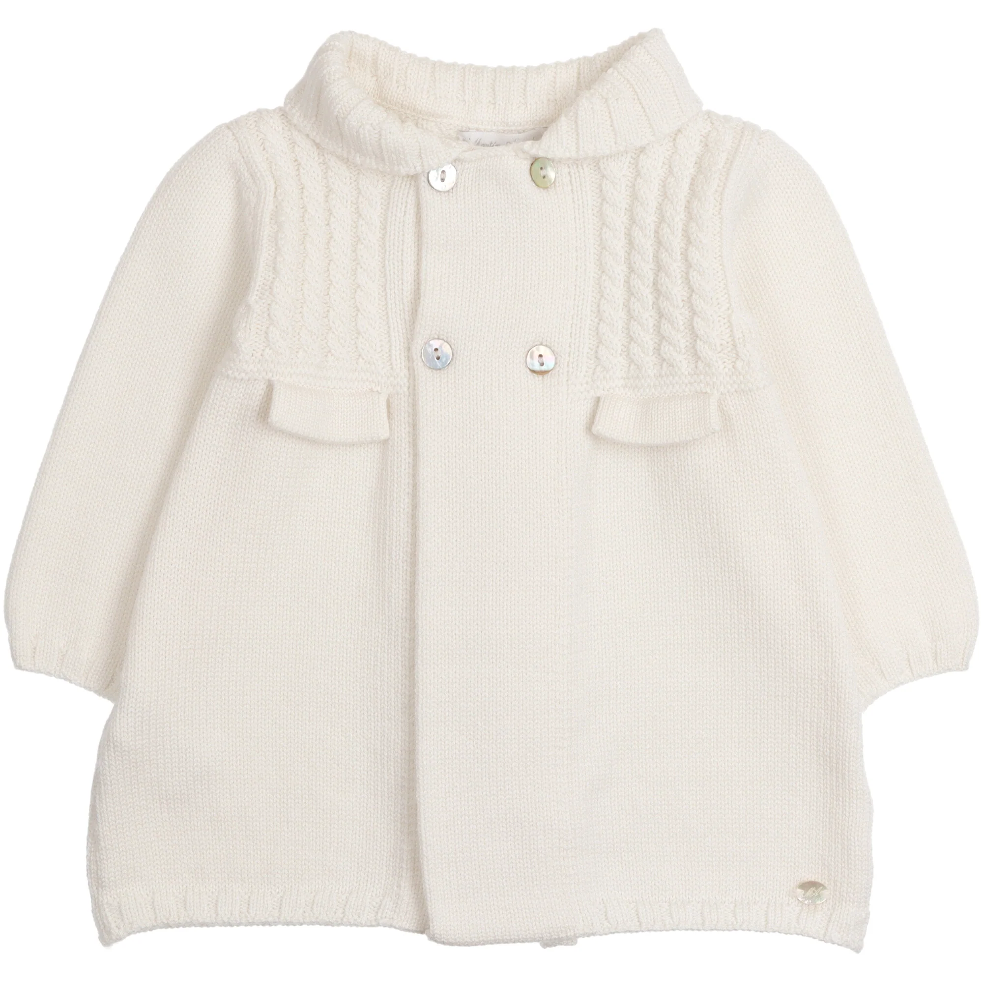 Lavarato a maglia colore bianco, grande collo lavorato a coste sciallato, chiusura doppio petto con bottoni.Composizione: 100% lana.Cura: si consiglia un lavaggio a mano con detersivo delicato, no candeggio, no asciugatrice.