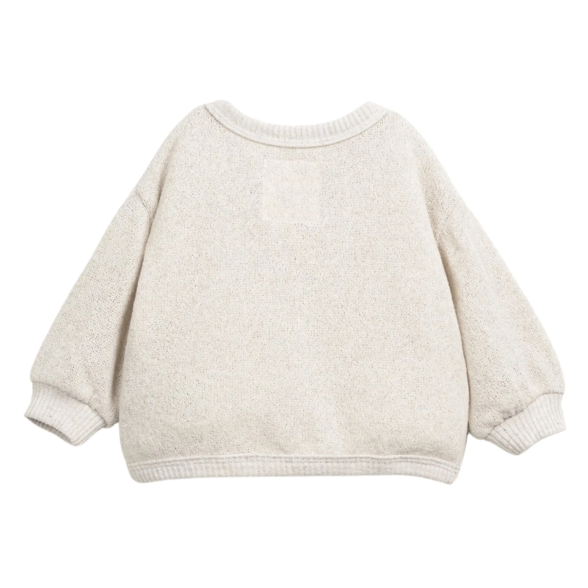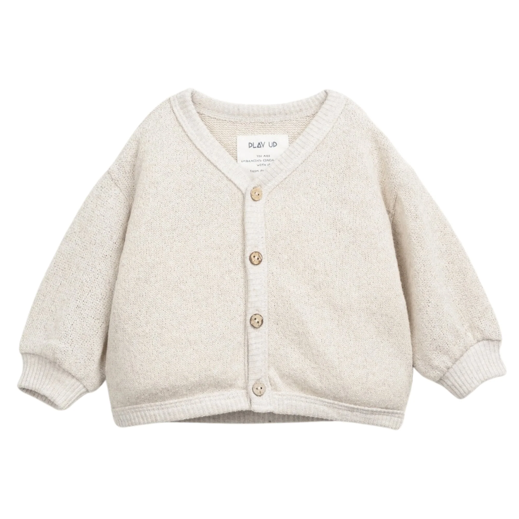 Cardigan realizzato in maglia con una miscela di cotone, poliestere riciclato e cotone riciclato, maniche lunghe, scollo a V, polsini elastici e apertura frontale con bottoni in cocco.