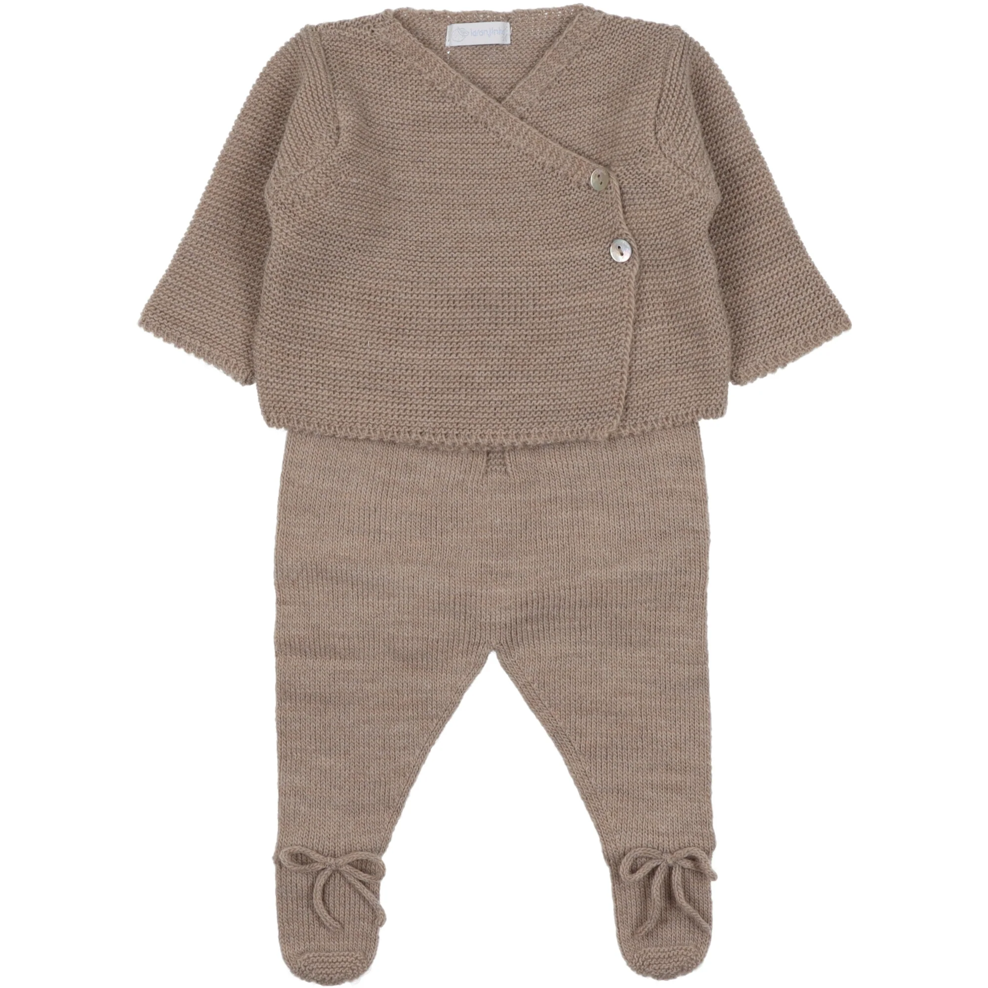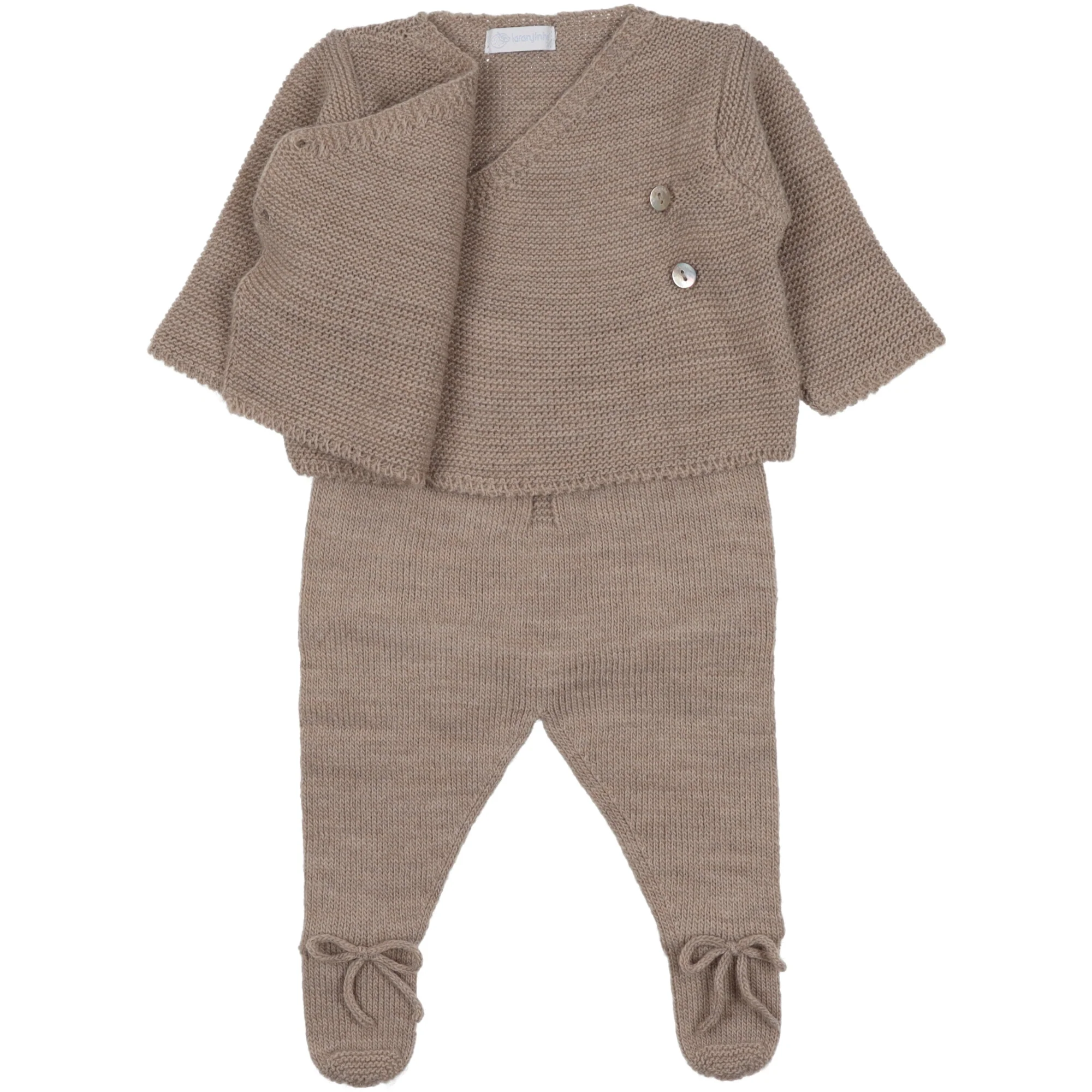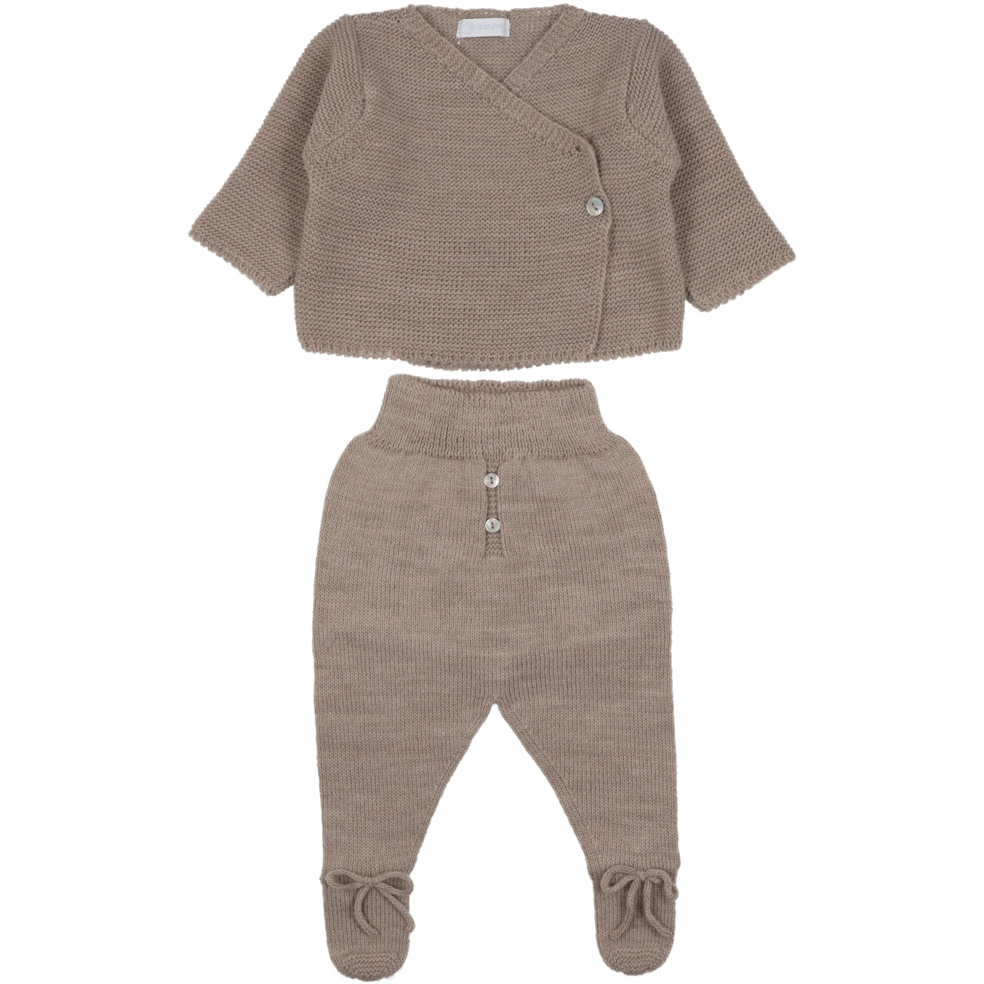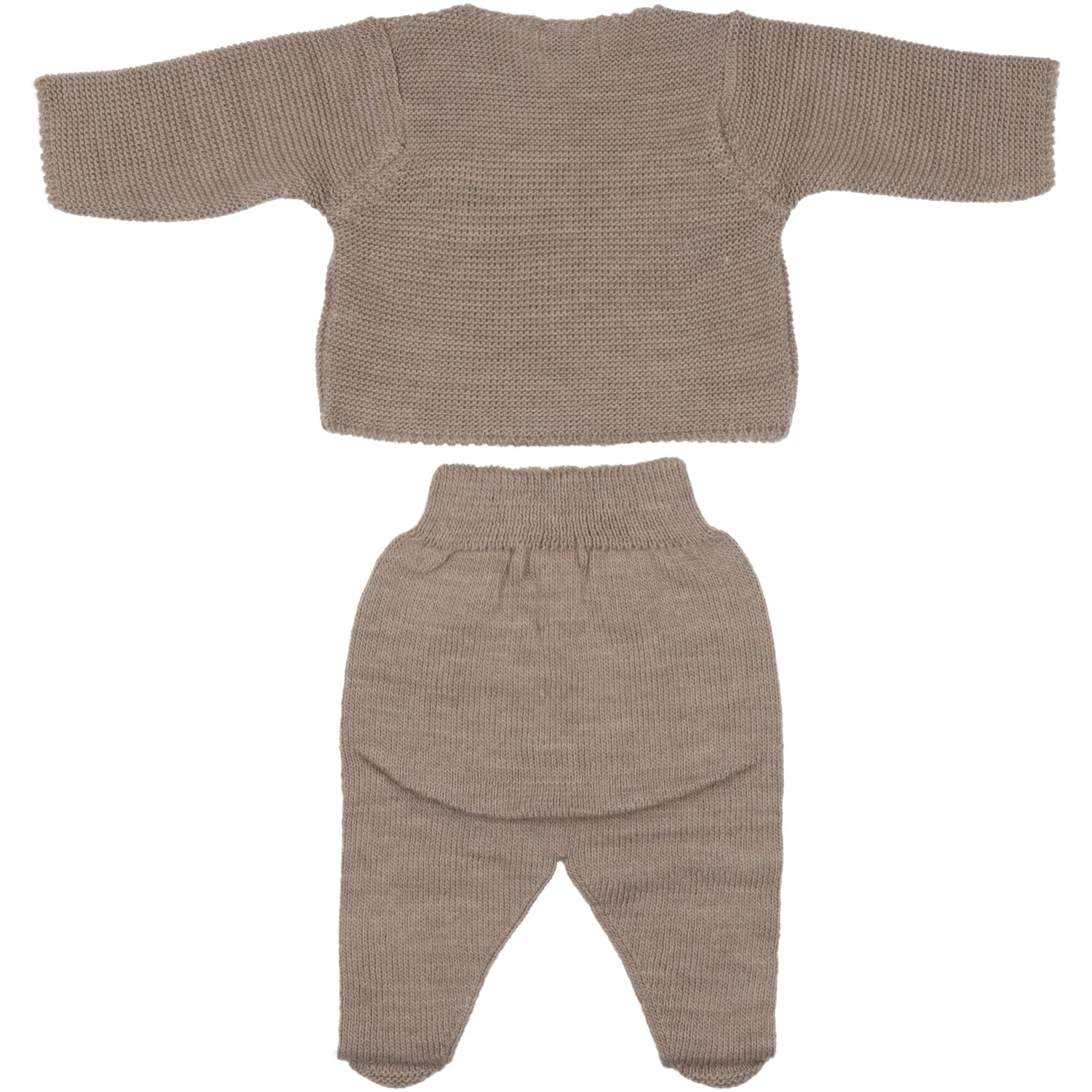 Completo per neonato realizzato in morbida lana. Cardigan chiusura a kimono con bottoni ed asole. Ghettine abbinate delicatamente elasticizzata con fiocco sul piede in lana.
