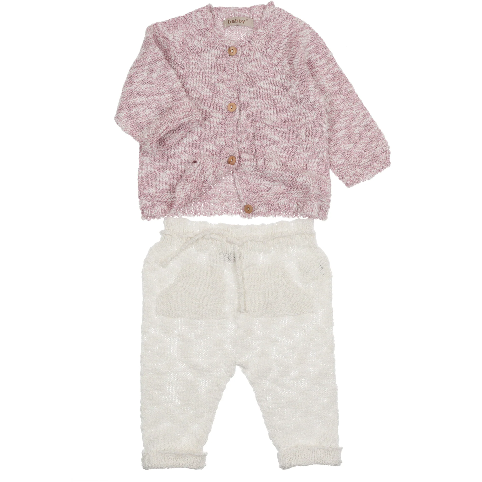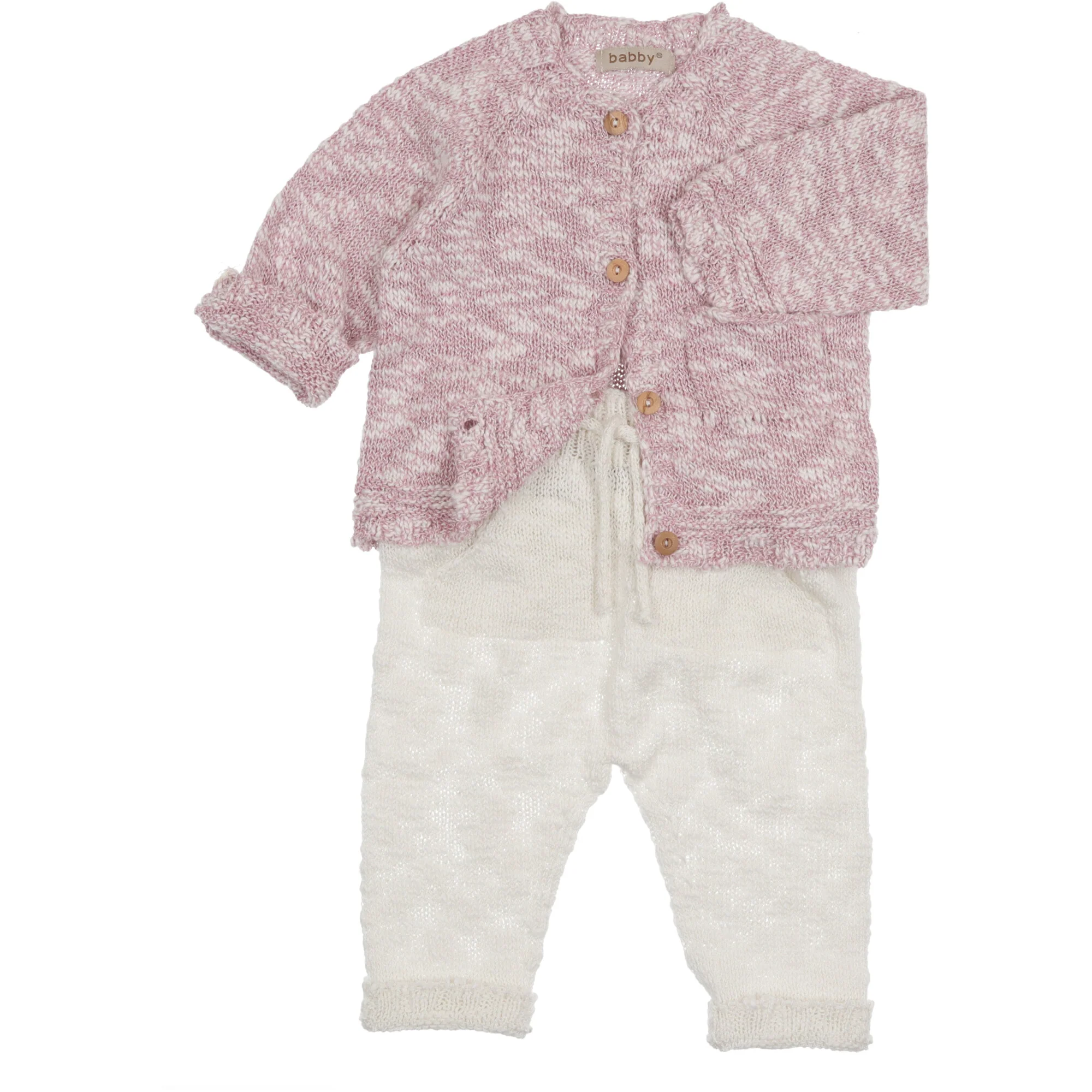 Maglione in filo di cotone rosa melangรจ, si chiude con bottoni, pantalone senza piede, vita morbida con nastro utile.