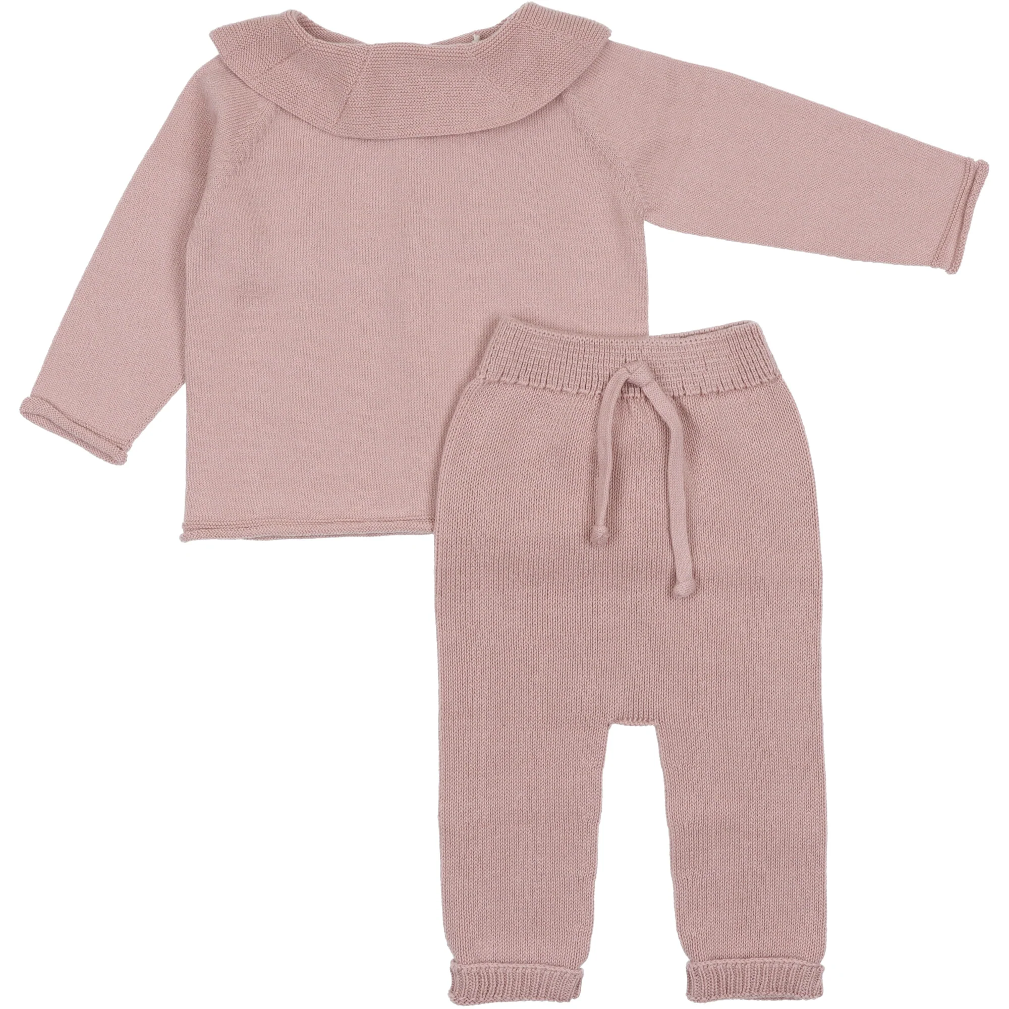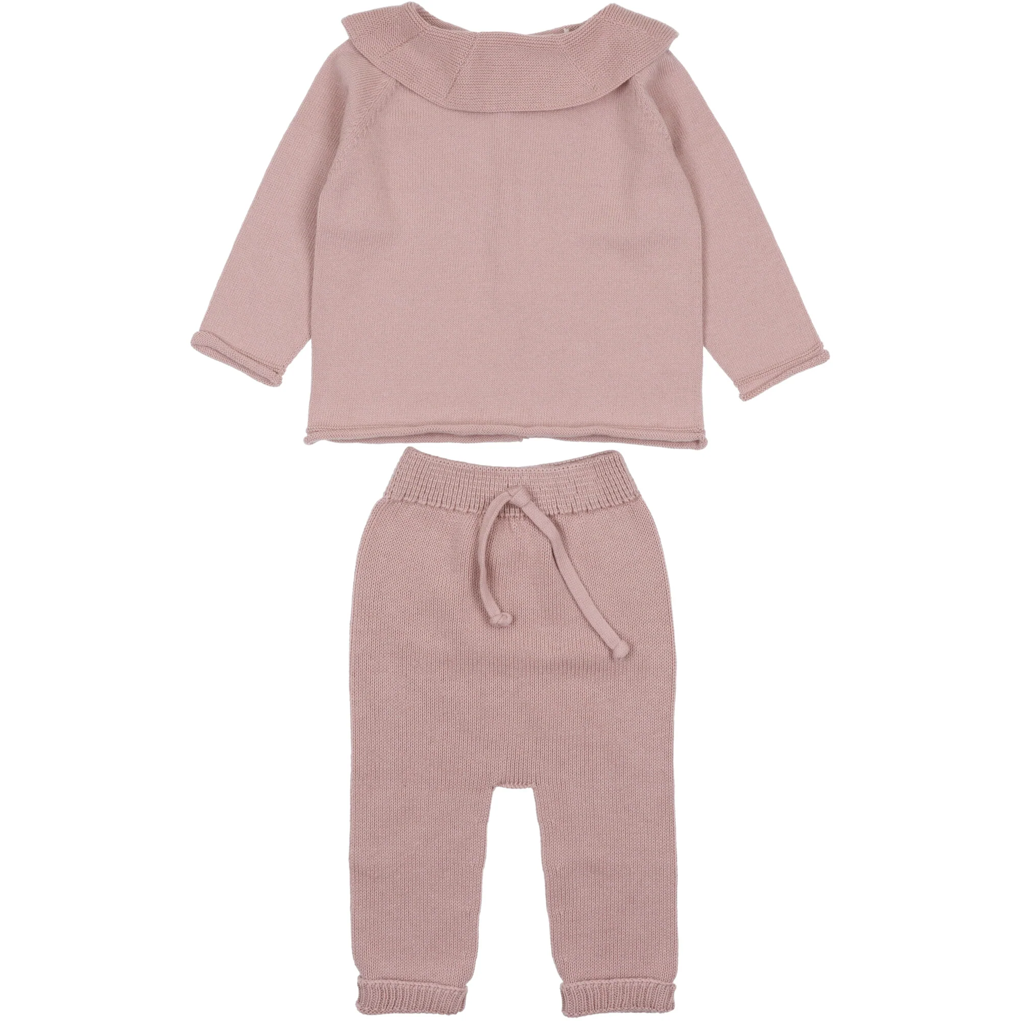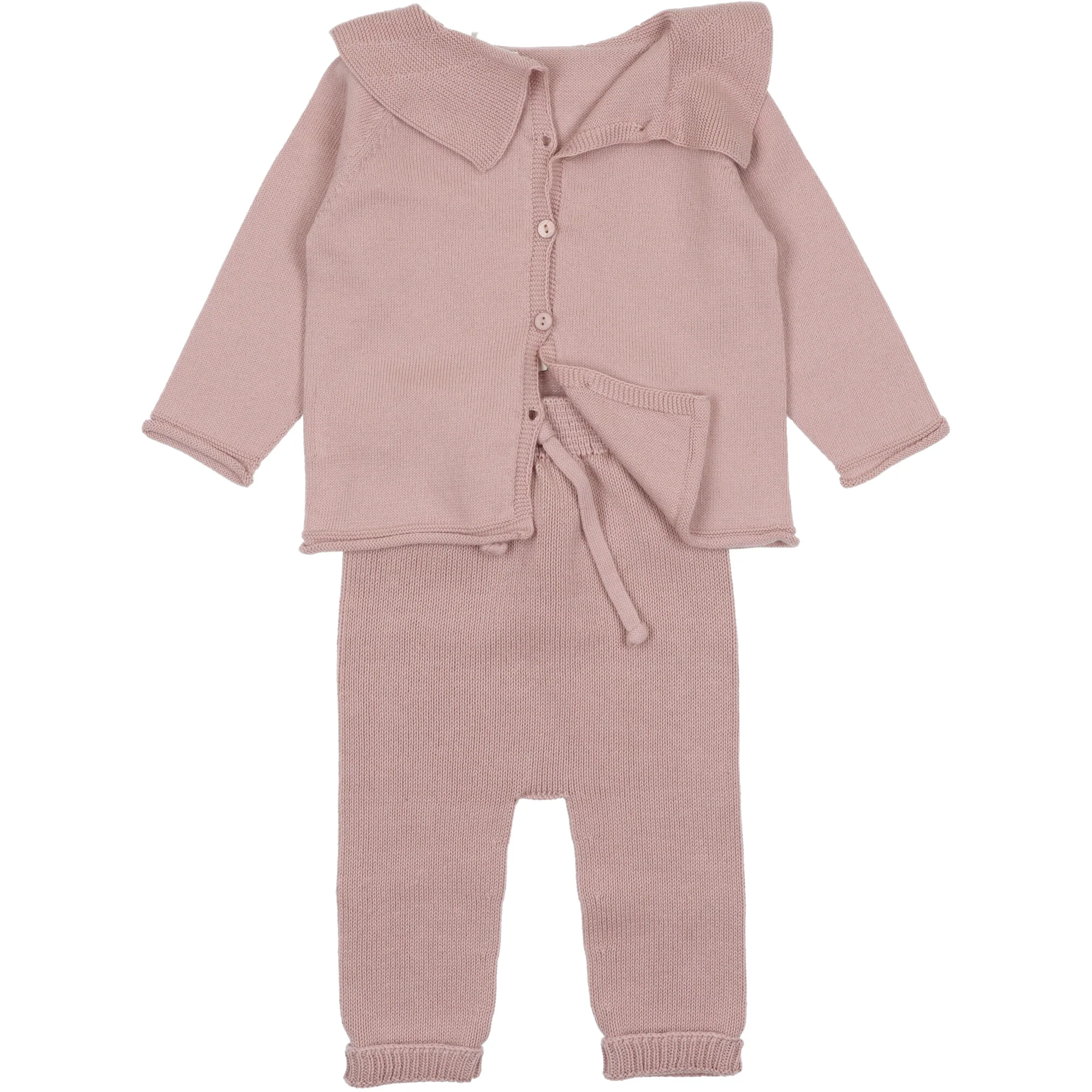 Completo in filo di cotone, maglia reversibile a cardigan chiusura bottoni collo a volant, ghettina senza piede, vita elasticizzata con nodo.