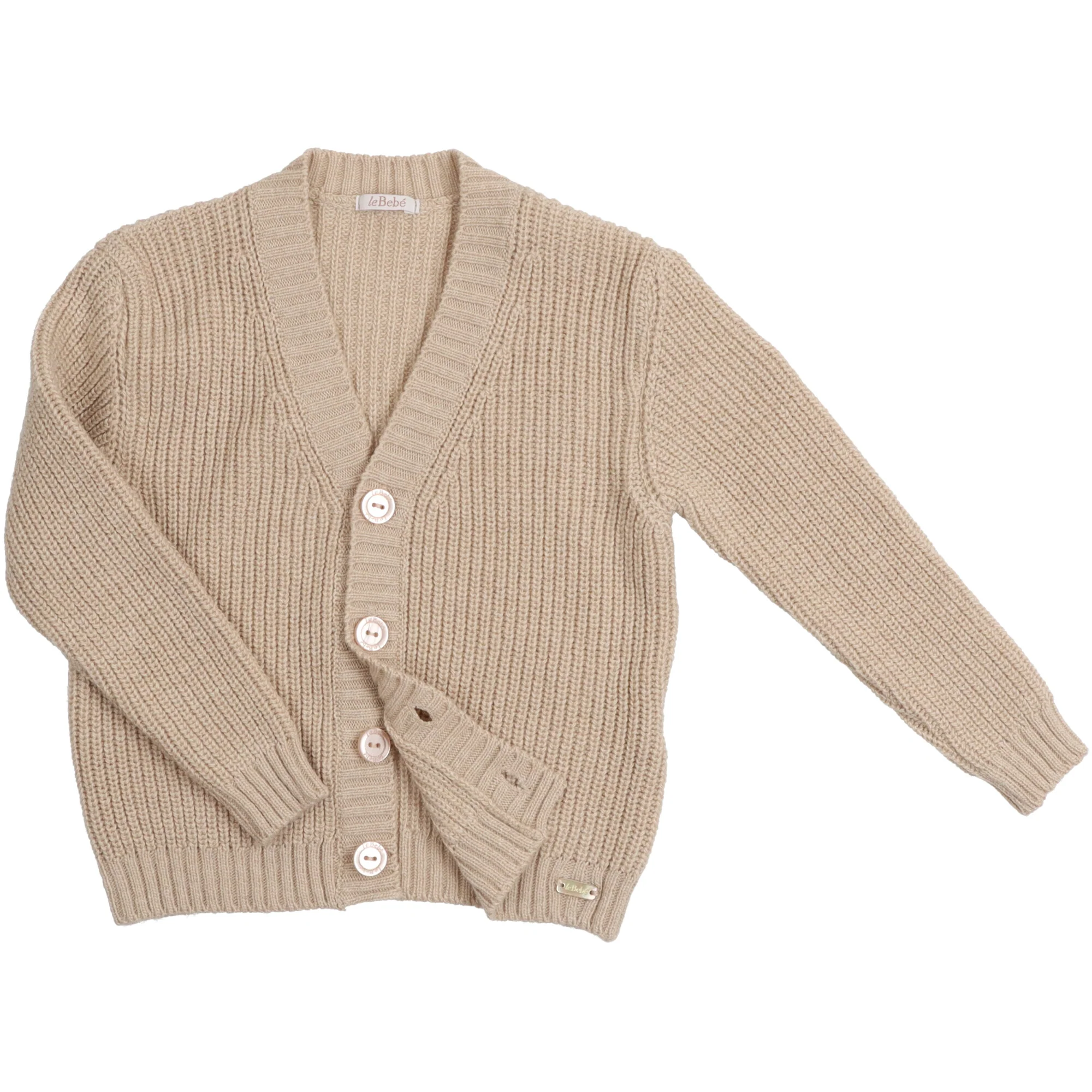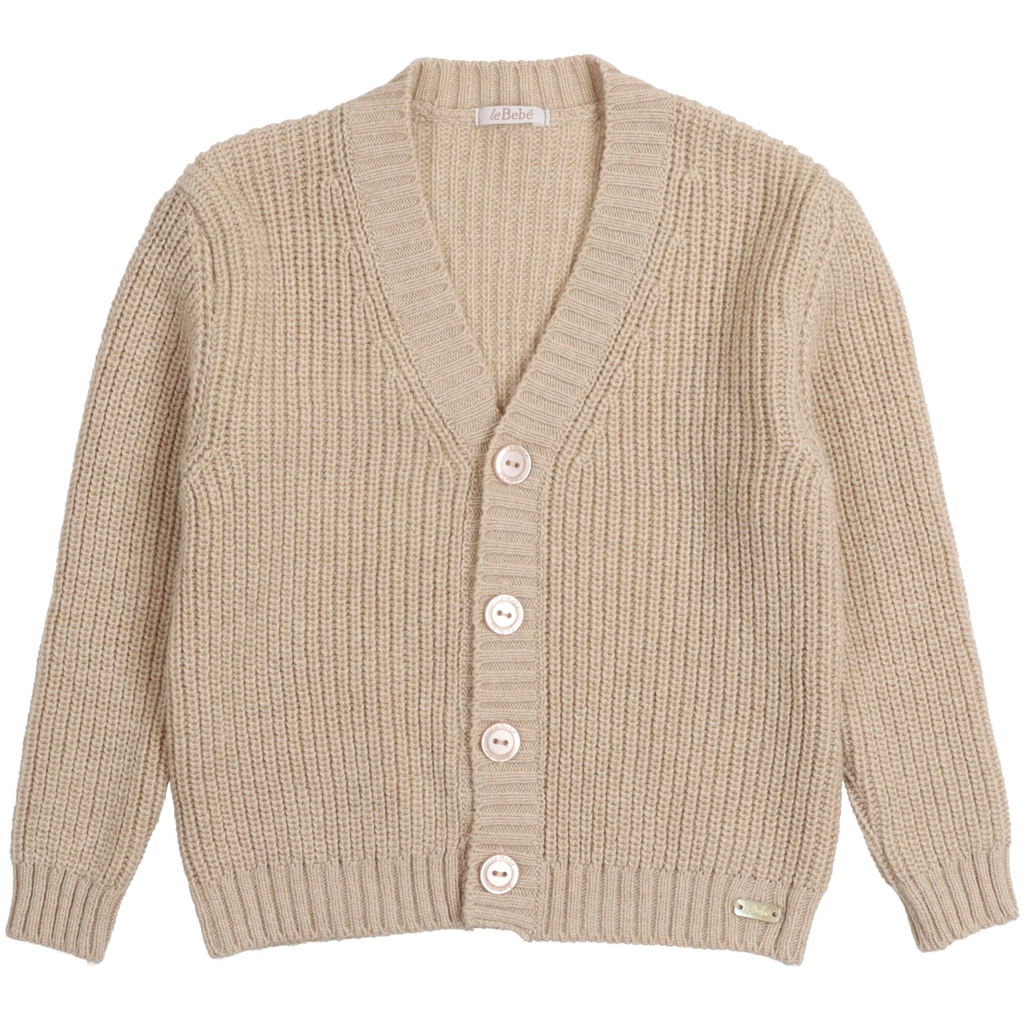 Cardigan con scollo a V, lavorato a trama grande chiuso con bottoni grandi in madreperla logati.