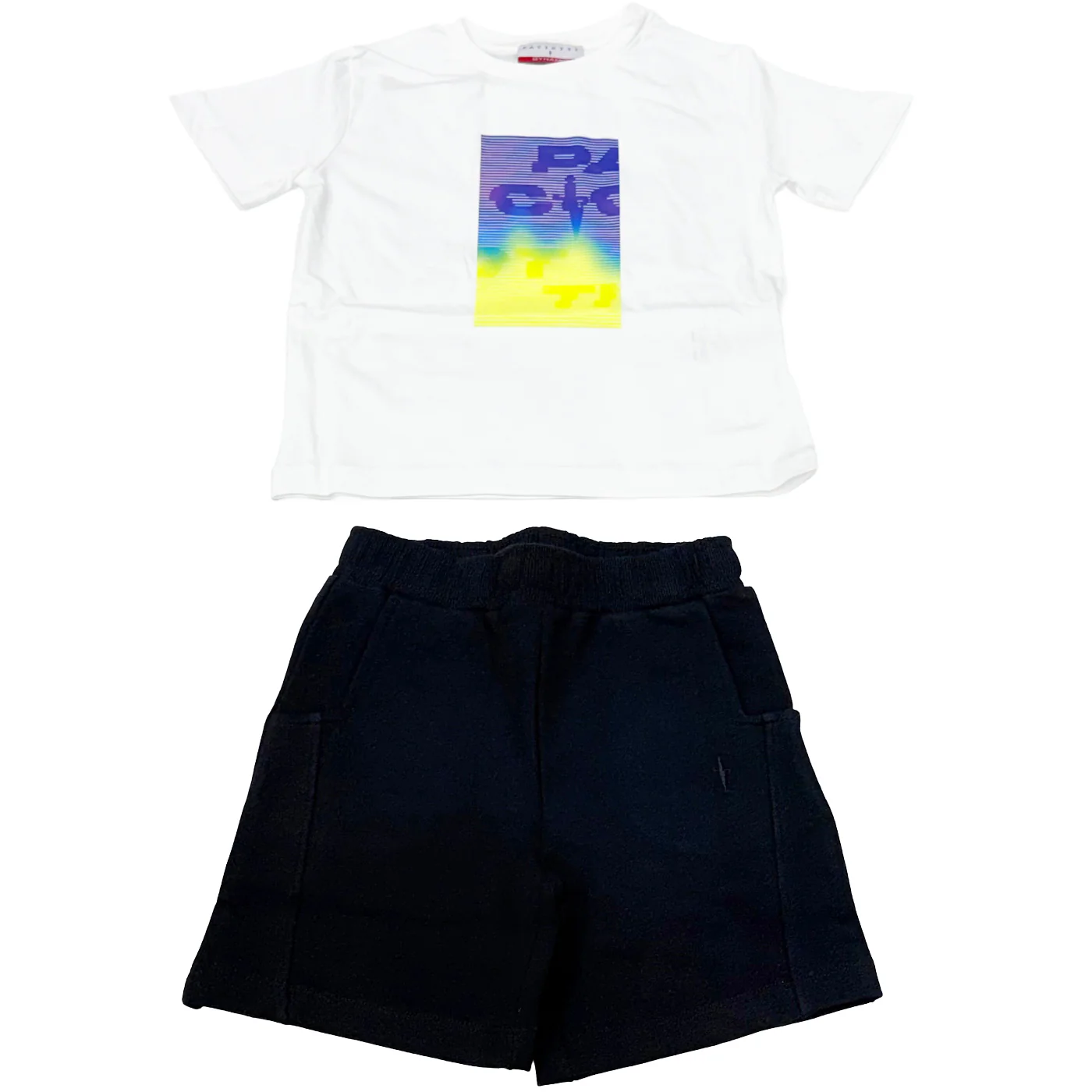 Cesare Paciotti completo due pezzi neonato in cotone bianco neroT-shirt girocollo Maniche corte Logo frontale con stampa Bermuda in cotone garzato Vita elastica Tasche a filo Logo su gambaComposizione: 100% cotoneMade in IndiaCollezione Primavera Estate Vestibilitร :Taglia Etร
