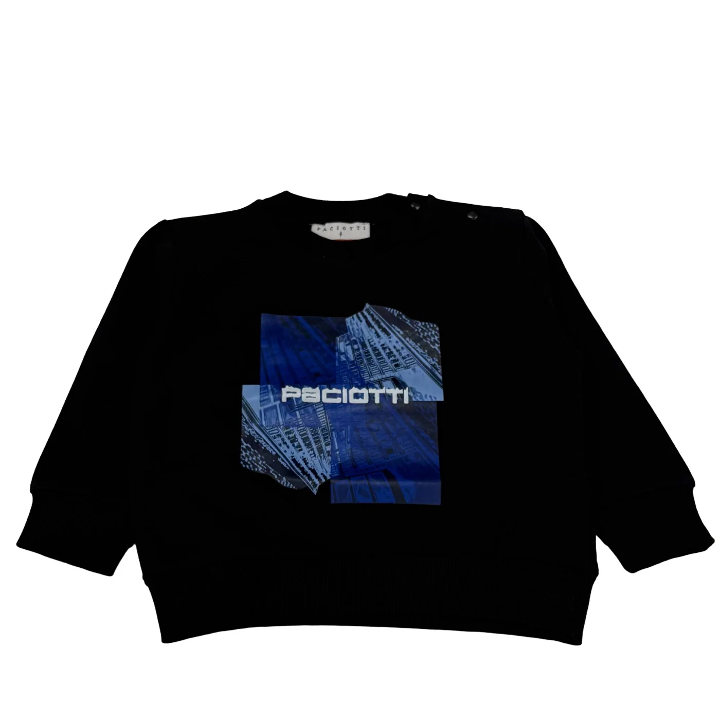 Cesare Paciotti felpa girocollo bambino in cotone garzato bluStampa con logo frontaleCollo polsini e fondo a costeComposizione: 95% cotone 5% elastanMade in IndiaCollezione Primavera Estate Vestibilitร :Taglia Etร