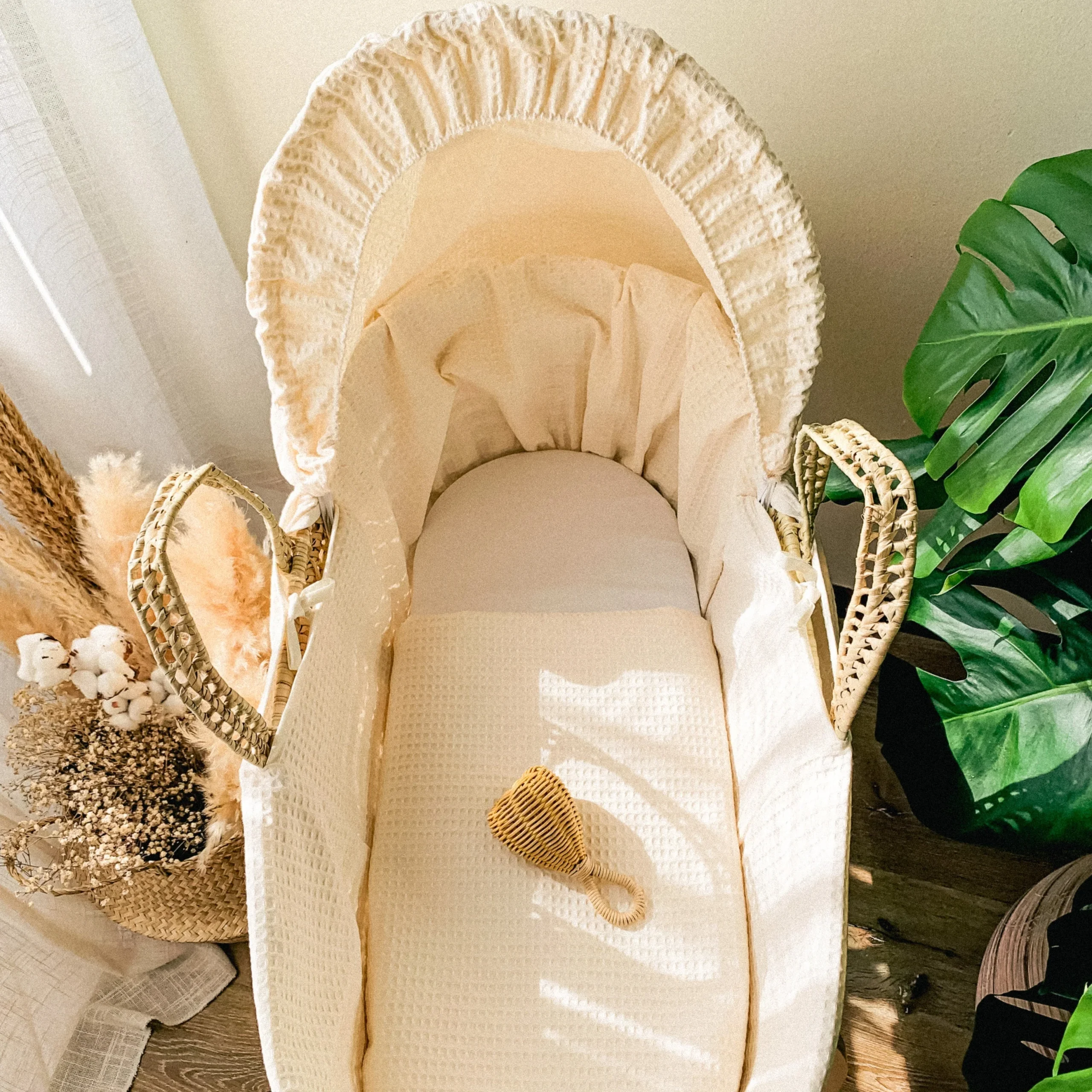 1Cesta Portabebè intrecciata a mano con foglie di palma. 1 Supporto a Dondolo ( guarda la seconda foto) 1 Rivestimento in Cotone fantasia Waffle 1 Cappuccio rimovibile 1 Piumiamo in Cotone Waffle 1 Materasso e Fodera Crema in Cotone Una comoda cesta portatile davvero originale e pratica, progettata per il tuo bambino per dormire in […]