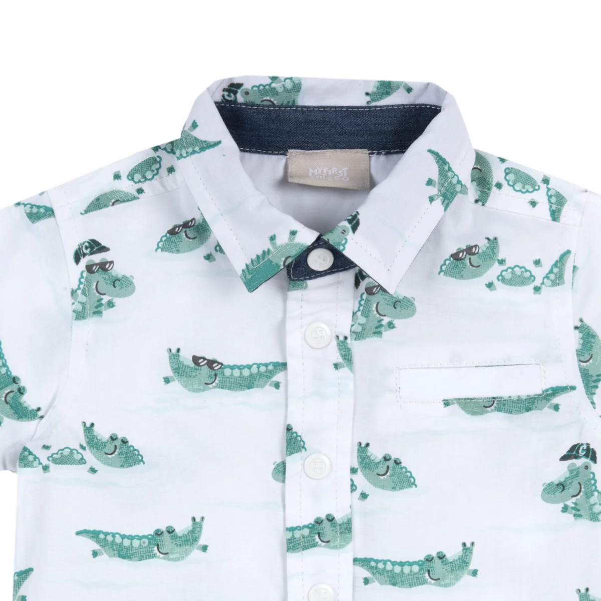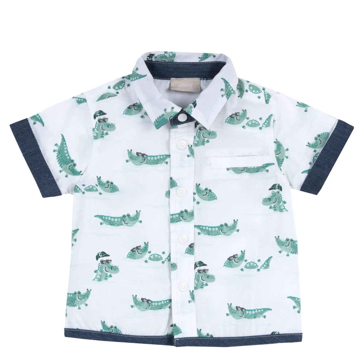 Chicco camicia baby boy in puro cotone biancoManiche corte Bordi a contrasto bluFantasia coccodrilliComposizione: 100% Cotone Made in CinaCollezione Primavera Estate 2022 Vestibilitร :Taglia Etร